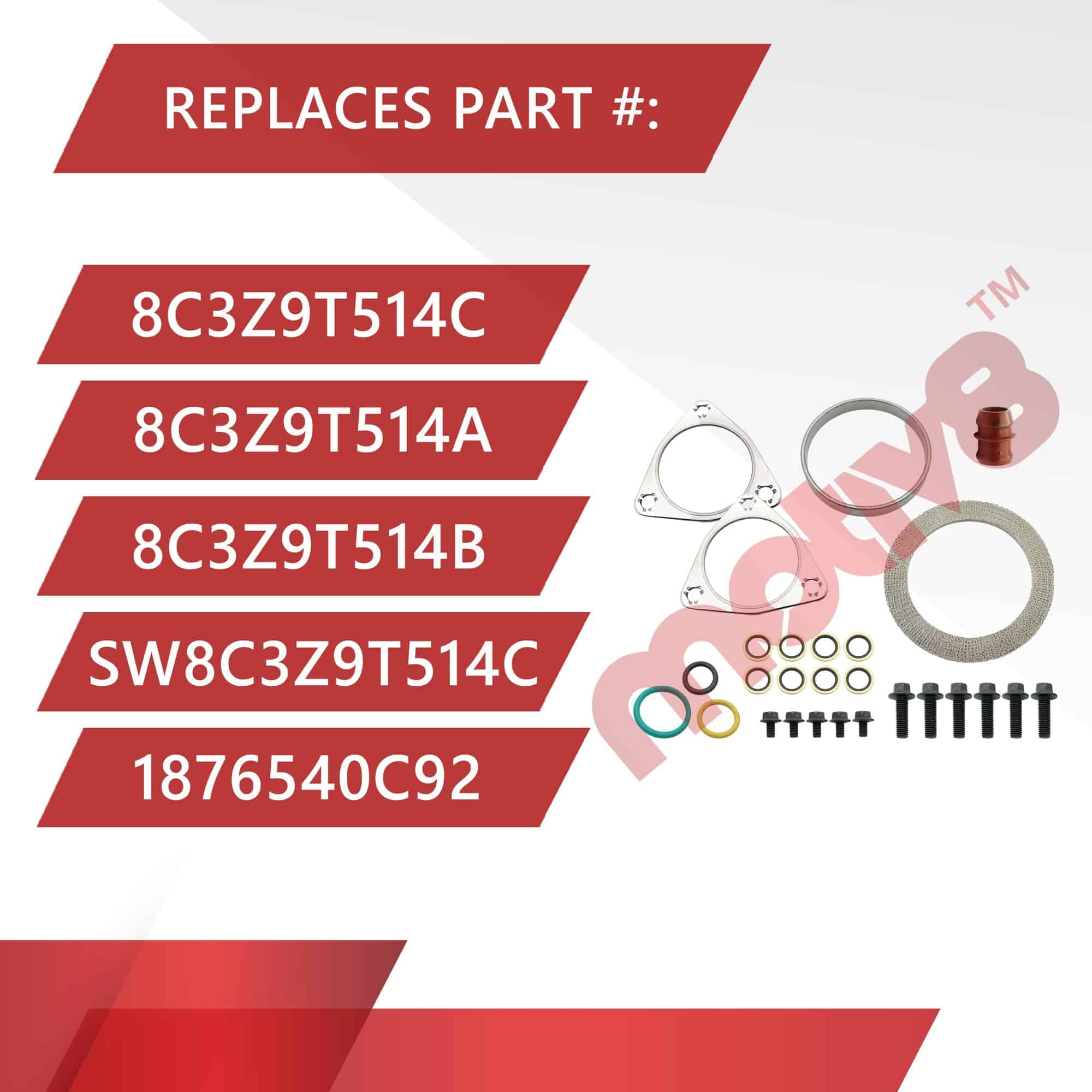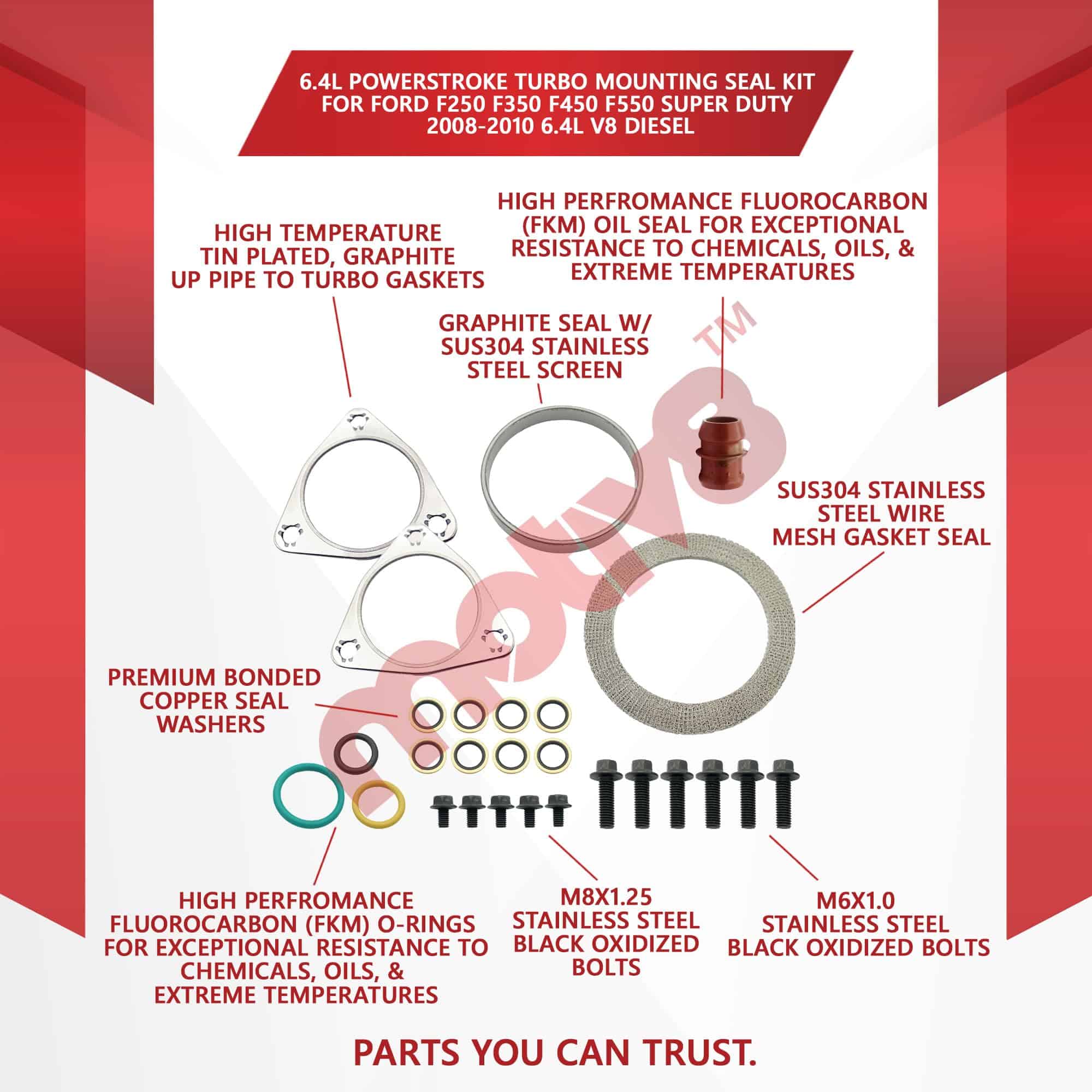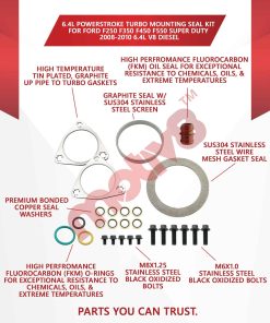 Si estás reemplazando o reconstruyendo el turbocompresor en tu Ford 6.4L Powerstroke, este es el kit perfecto para ti. Este kit contiene todo el hardware y sellos necesarios para reinstalar con éxito tu turbocompresor. Muchos cometen el error de instalar un turbocompresor sin un kit de reparación o utilizando juntas viejas, pero esto conduce a fugas en las líneas de aceite y a la filtración de gases de escape al exterior, lo que requiere la extracción e instalación repetida de la turbina del vehículo.