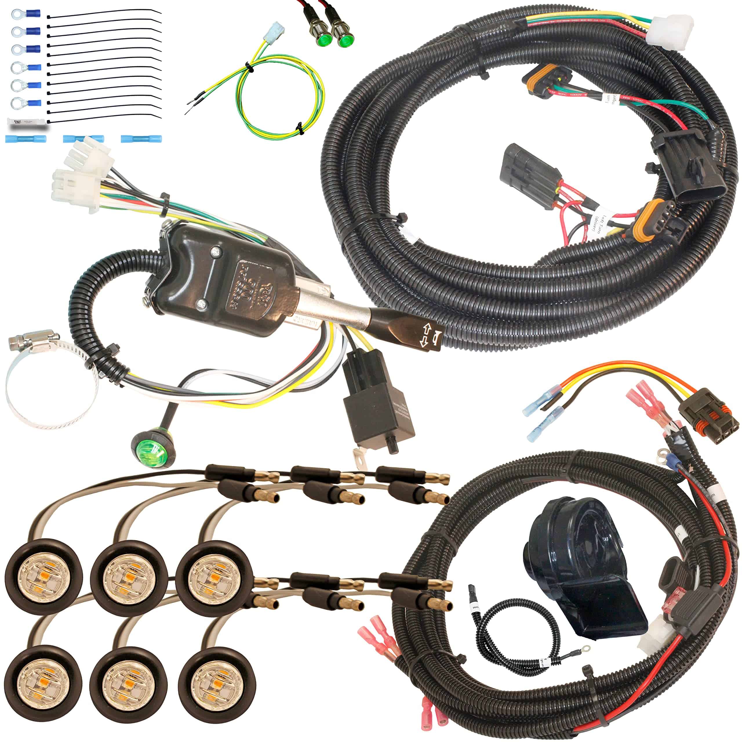 Las señales de giro delanteras con lente transparente parpadearán en ámbar al seleccionarlas y se montarán en un agujero de 3/4″ de diámetro (3 por lado), y el arnés se alimenta fácilmente a través del cortafuegos donde se conecta al arnés del interruptor.