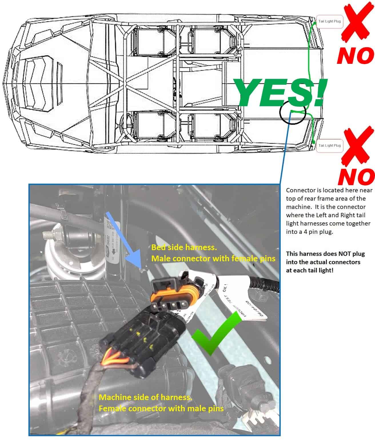 Kit de señales de giro de MCSADVENTURES diseñado específicamente para máquinas Polaris General con el conector de 4 pines de la cama al chasis. Esta conexión se encuentra en la parte superior del área del bastidor trasero de la máquina. Simplemente levante la cama para examinar la parte superior del área del bastidor trasero del lado del conductor para encontrar este conector de 4 pines.