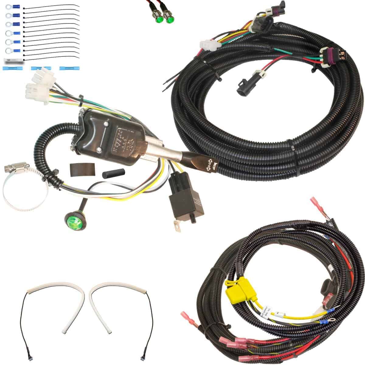 Un arnés frontal completo se alimenta a través del cortafuegos hasta el tablero y también se conecta al interruptor de señales de giro. Este arnés también incluye cables para la bocina que permiten la conexión fácil de la bocina.