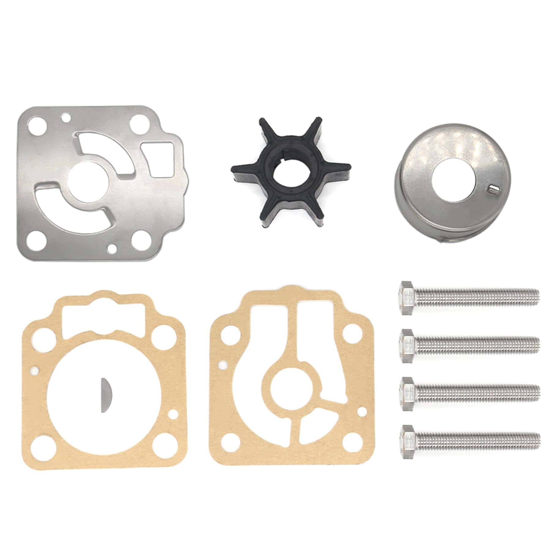 Este kit de servicio de impulsor de bomba de agua QuickMariner es ideal para motores fuera de borda Tohatsu Nissan de 40HP 50HP, tanto de 2 tiempos como de 4 tiempos, en el engranaje inferior del motor. También es compatible con motores marinos Mercury Marine de 40HP 50HP a nivel internacional. El paquete contiene un impulsor de goma, una placa de desgaste, juntas de sellado, una llave de eje de transmisión, pernos con arandelas y una copa insertable. Asegúrese de elegir la junta correcta que sea igual a su junta original para una instalación adecuada.