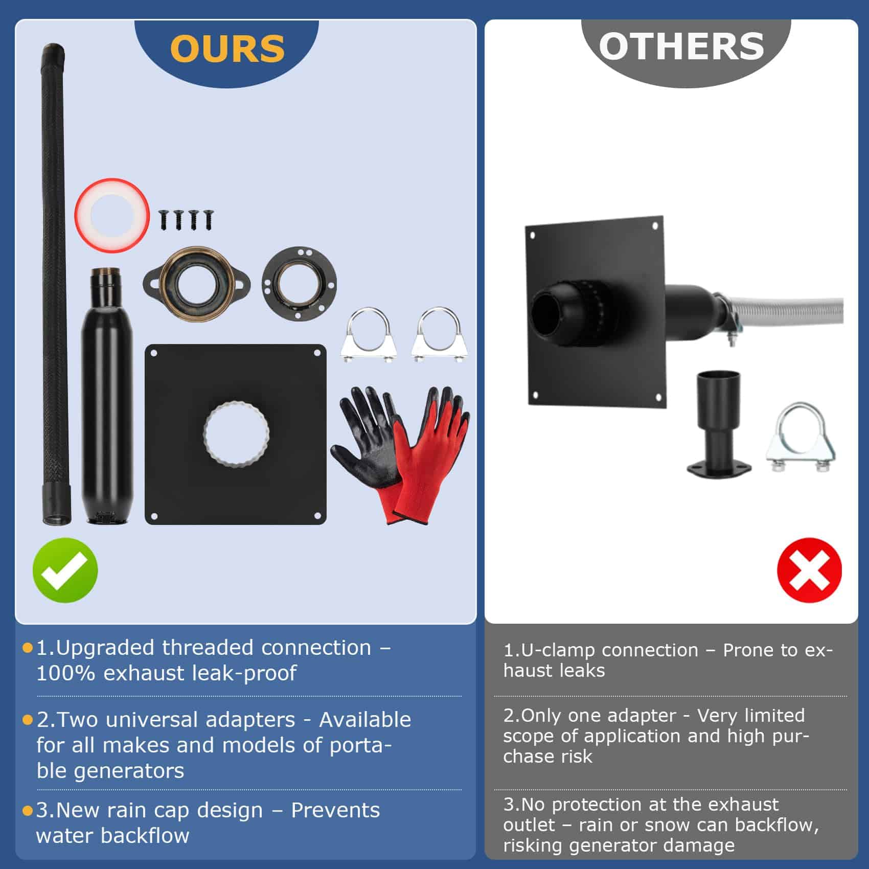 Ya no tendrá que preocuparse si encaja nuestro kit incluye dos adaptadores universales y un codo de 90 grados, lo que lo hace compatible con la mayoría de las marcas populares de generadores, incluso en instalaciones estrechas o inusuales. Y como sabemos lo frustrante que es tener que hacer viajes extra a la ferretería, hemos incluido todo lo que necesita, desde cinta de sellado y guantes hasta tornillos y placas de pared para que pueda instalarlo y hacerlo funcionar de inmediato, sin problemas.