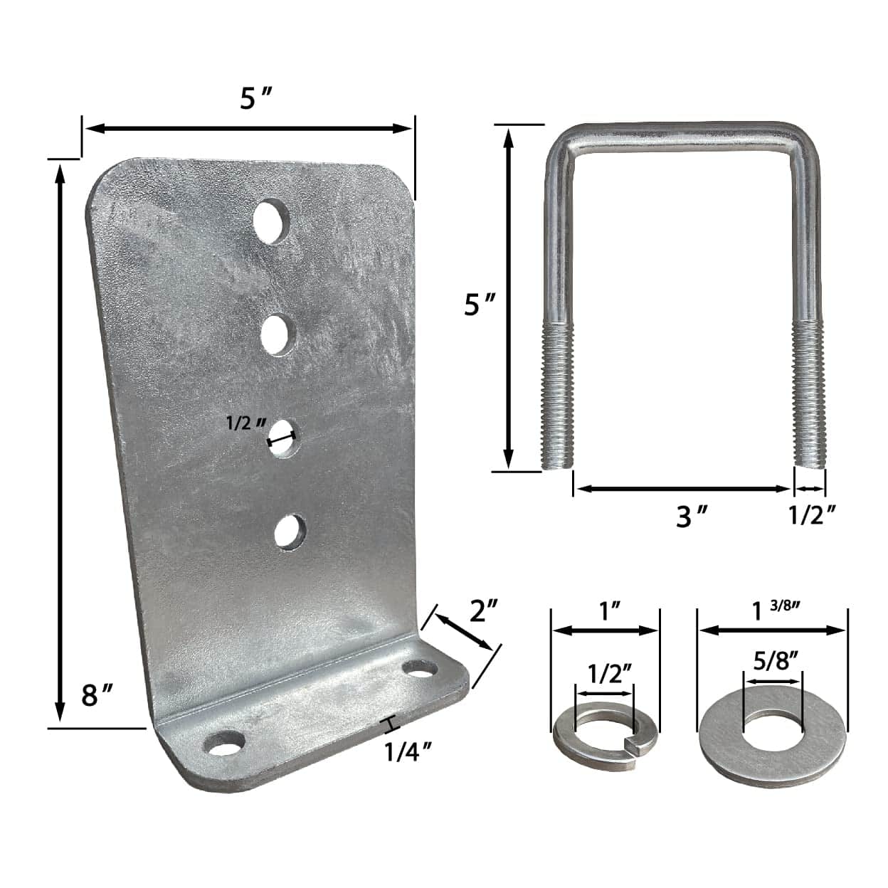 Kit de Soporte en L Galvanizado de 8″ para Barcos, se adapta a travesaños de 3×3, Resistente. Soportes hechos de acero galvanizado duradero de 1/4″ de grosor, U-bolts de 1/2″ de grosor. Recubrimiento de zinc para prevenir la oxidación y adecuado para remolques marinos y barcos de motor en agua salada, agua dulce, condiciones costeras y remolques utilitarios en condiciones heladas. Multiples agujeros de montaje hacen que este kit sea completamente ajustable para satisfacer las necesidades de su remolque. El kit incluye: (2) soportes en L de 8″, (2) U-bolts cuadrados, (4) tuercas hexagonales, (4) arandelas planas, (4) arandelas de seguridad