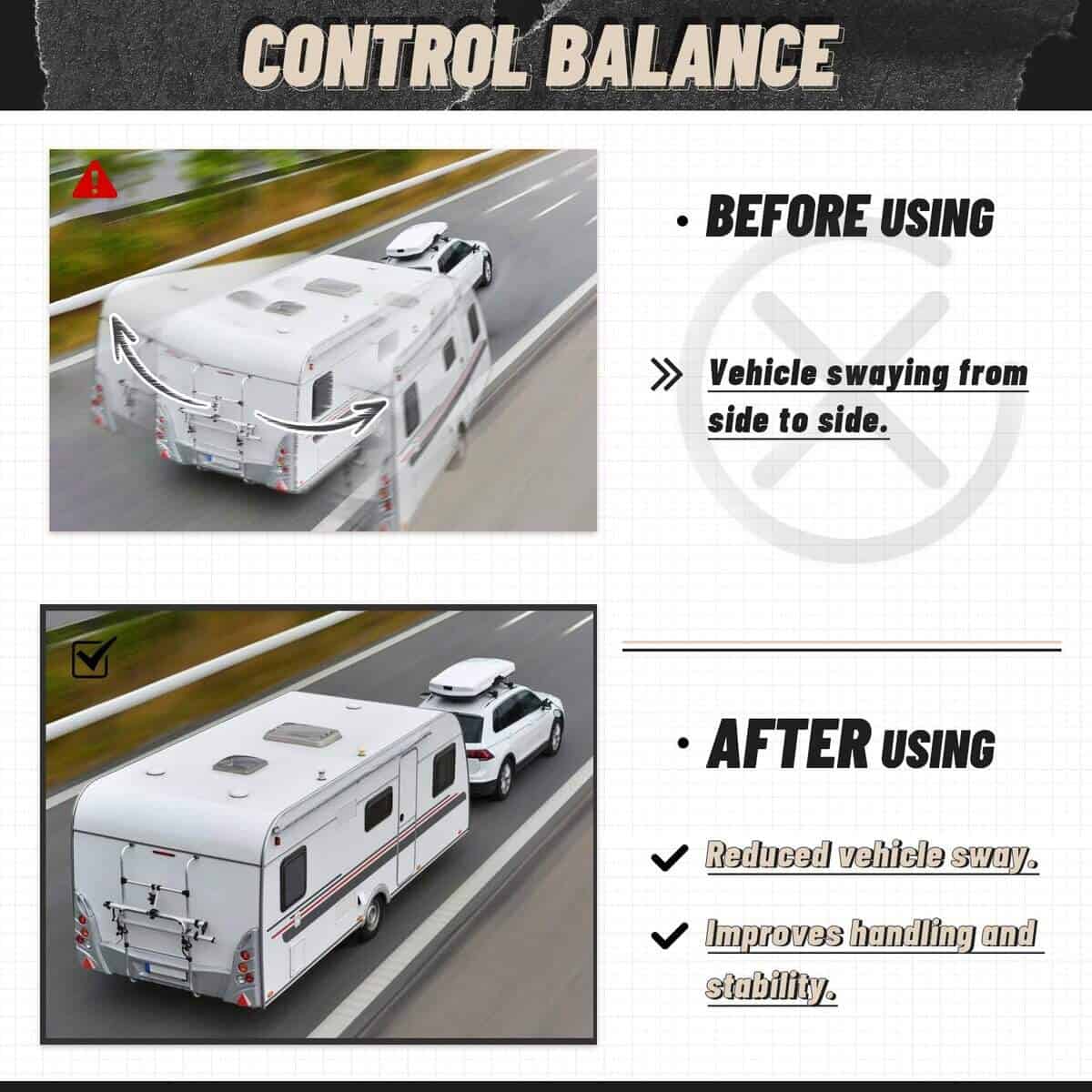 3. Diseño para: Específicamente diseñado para ser remolcado por un vehículo de tamaño mediano, el sistema Equalizer virtualmente eliminó la oscilación. Puede remolcar directamente un remolque de viaje, garantizando una conducción segura incluso a altas velocidades, tráfico de camiones, clima extremo o cuando grandes vehículos pasan.