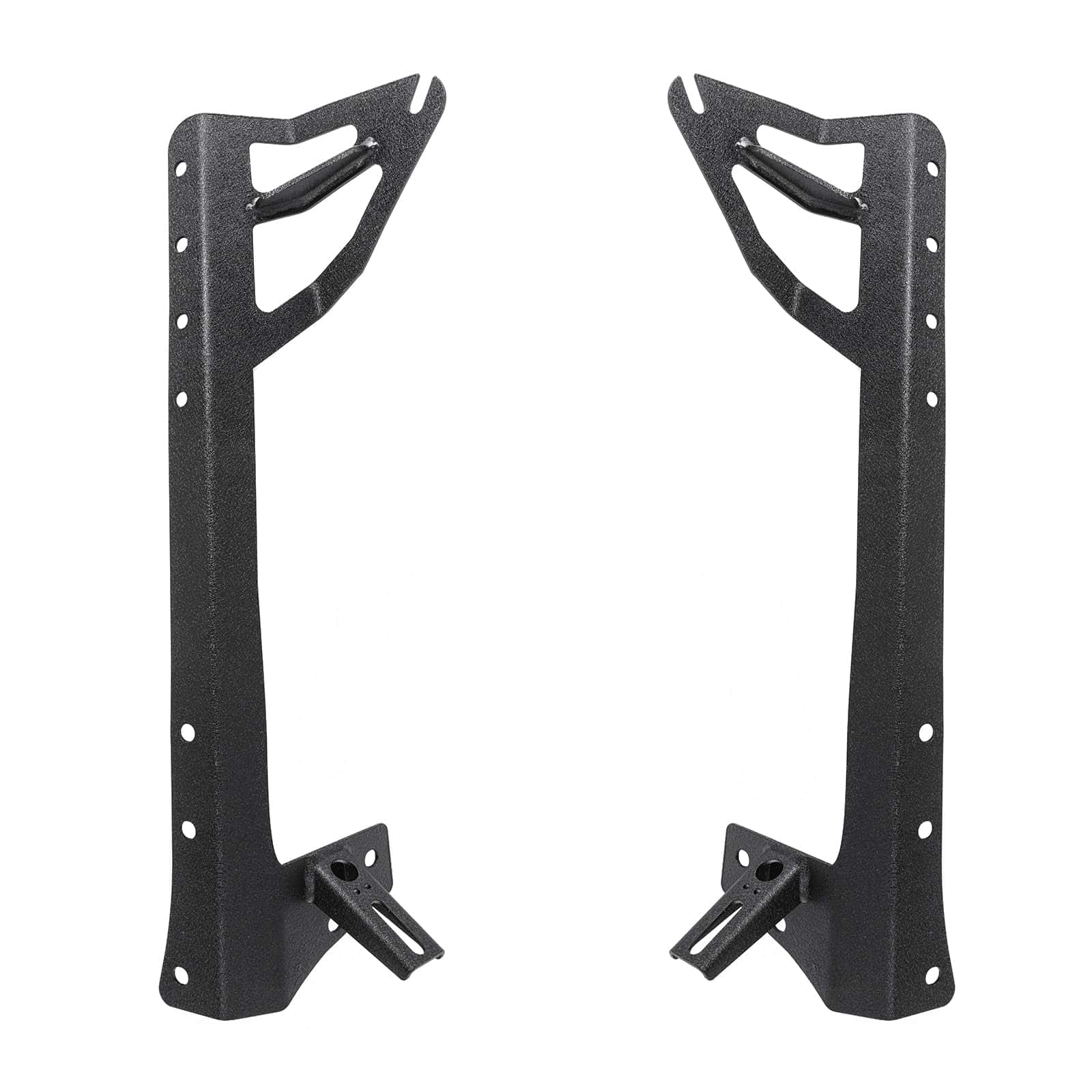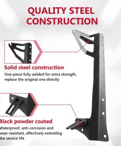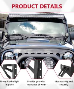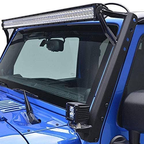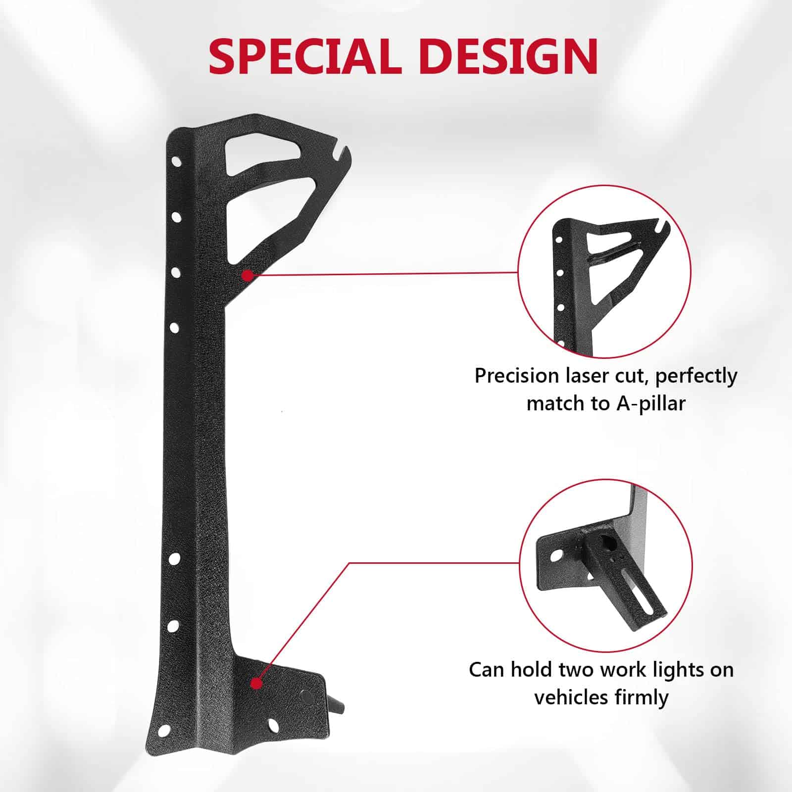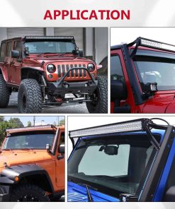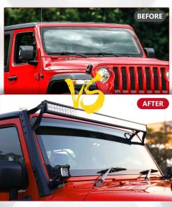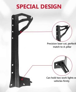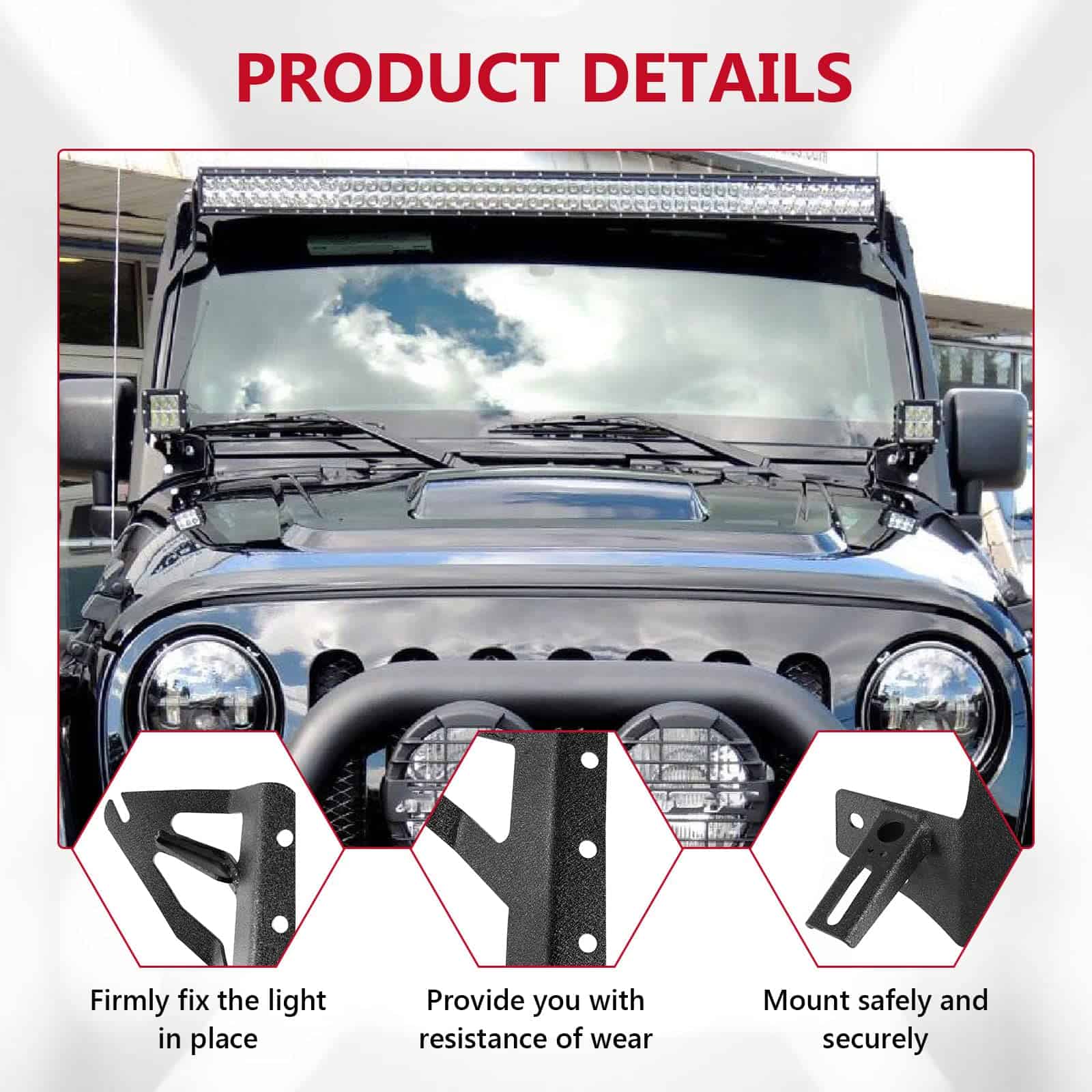 Construcción completa de metal de acero, soldada en una sola pieza. Color: negro. Instrucciones de instalación no incluidas. Soportes de montaje de parabrisas de posventa con soportes inferiores de esquina. Puede sostener una barra de luz recta de 52″ + dos luces de trabajo en el vehículo firmemente. Solución definitiva para agregar más luces sin demasiados soportes voluminosos. Diseño elegante y sofisticado que agrega un aspecto offroad agresivo. Corte láser de precisión, se adapta perfectamente a la forma de la columna A original. Juntas de esponja adheridas para evitar daños en la pintura del automóvil.