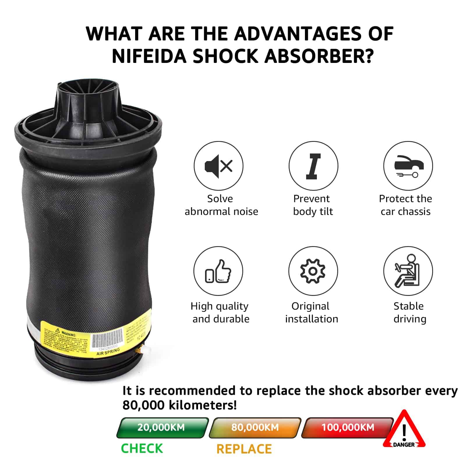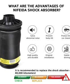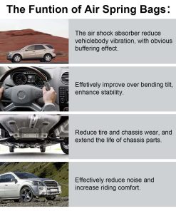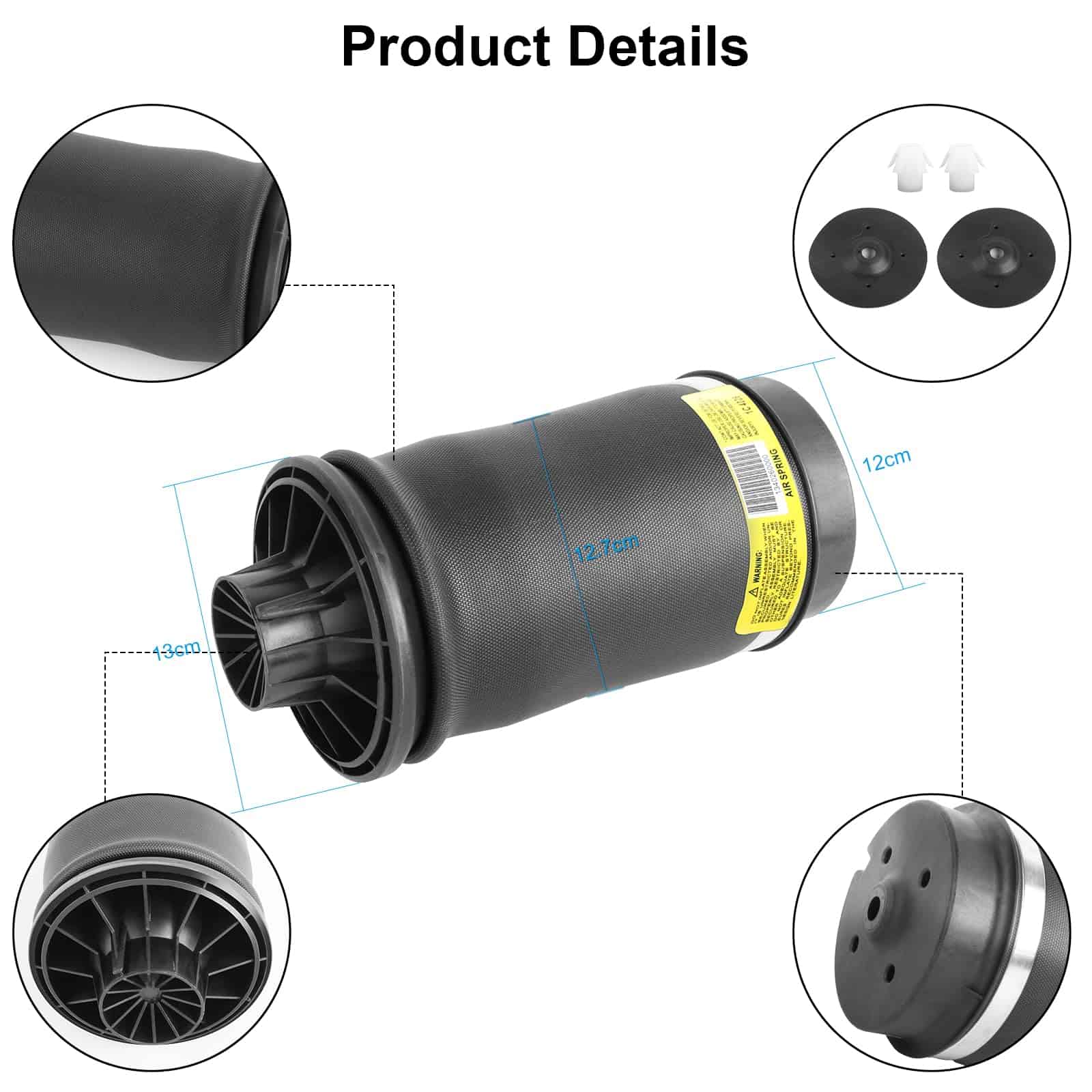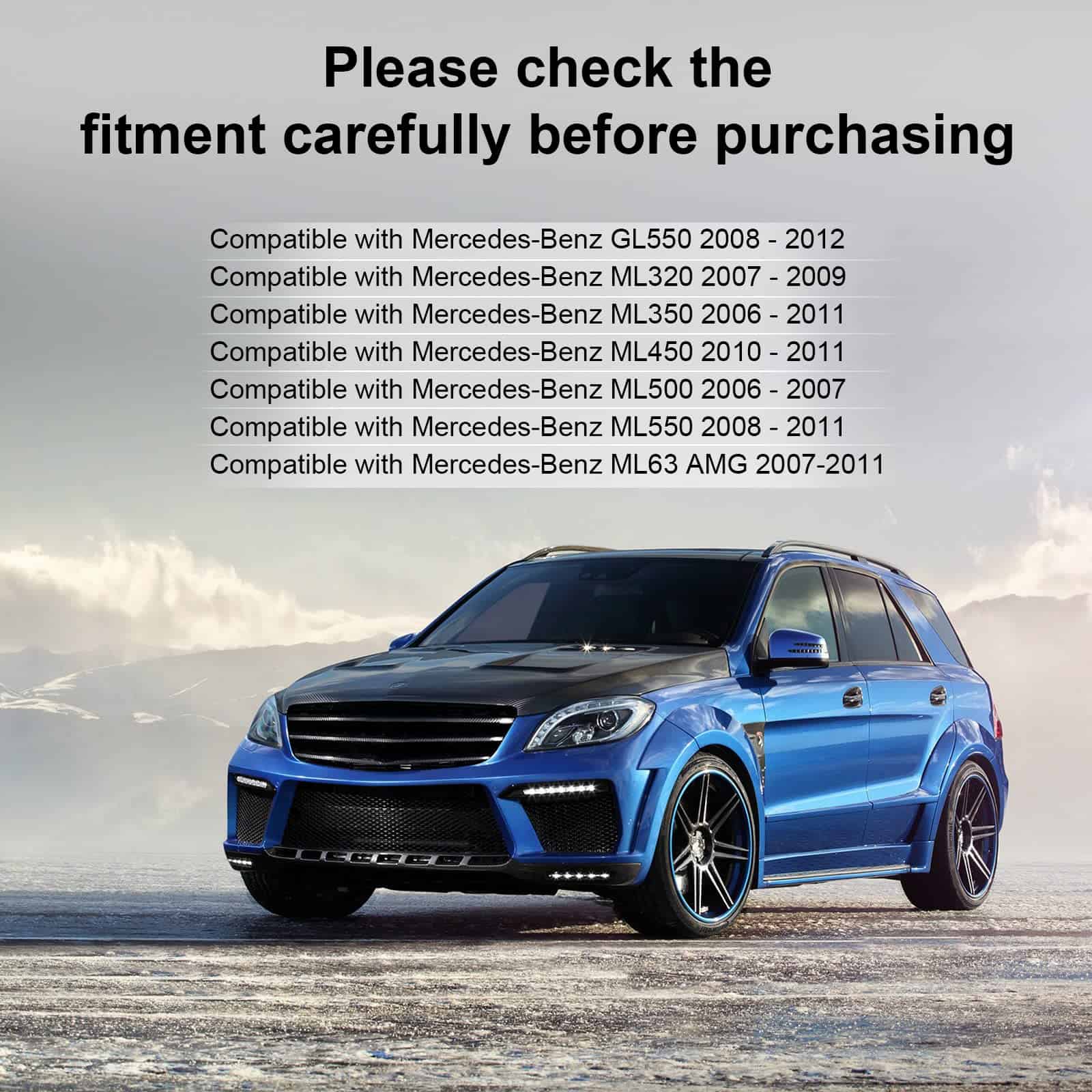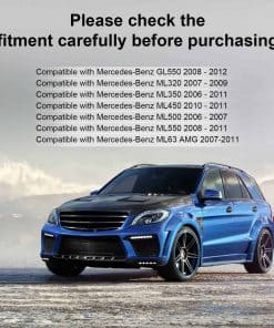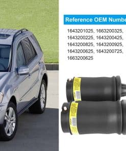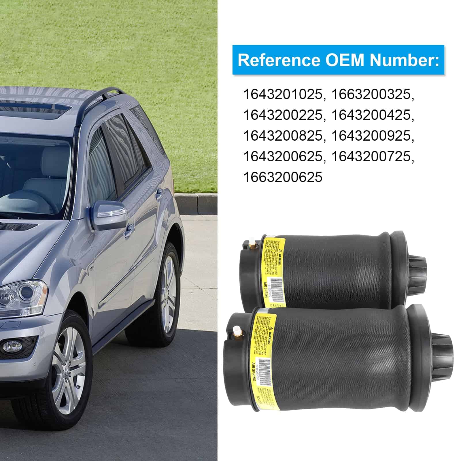 1. COMPATIBILIDAD Compatible con Mercedes-Benz X164/GL-Class GL320 2007-2009, GL350 2010-2012, GL450 2007-2012, GL550 2008-2012; Mercedes-Benz W164 ML-class ML320 2007-2009, ML350 2006-2011, ML450 2010-2011, ML500 2006-2007, ML550 2008-2011, ML63 AMG 2007-2011. 2. Número de OEM de referencia 1643200225, 1643200425, 1643200625, 1643200725, 1643200825, 1643200925, 1643201025, 1663200325, 1663200625. Por favor, compruebe la compatibilidad y el número de OEM cuidadosamente antes de comprar. 3. Calidad superior Las bolsas de suspensión de aire están hechas de goma de alta densidad de alta calidad, más duraderas que los resortes de suspensión de aire ordinarios, mejor rendimiento de compresión y carga, proporcionándole una mejor experiencia de conducción después del reemplazo. 4. El paquete incluye un par de bolsas de resorte de aire traseras izquierdas y derechas, reemplazo perfecto para el resorte de aire original. Para una experiencia de conducción suave, es necesario reemplazar su bolsa de amortiguador a tiempo. 5. 100% Satisfacción Garantizamos que todas las bolsas de aire traseras son nuevas y 30 días de devolución y cambio gratuitos. Stock en EE. UU. Si tiene alguna pregunta, no dude en contactarnos, nos complacerá resolver el problema por usted.