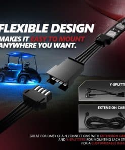 3 veces más brillante con LED SmartColor 3-en-1 Pinte el cromo brillante de su bicicleta y la carretera debajo con el brillo vívido de Aura LED. A diferencia de las tiras LED tradicionales que utilizan SMD de un solo color para simular el color, las tiras de luz Aura están hechas con seis SMD de SmartColor 3-en-1. Estos potentes SMD combinan micro-LED de todos los colores en una luz refinada de ángulo amplio. Dirija el espectáculo ¡Ilumine su bicicleta desde una distancia de hasta 80 pies con 2 controles remotos de tamaño bolsillo -1 control remoto de tamaño billetera -1 control remoto de tamaño llavero -También incluye un interruptor ON/OFF montable para un uso rápido Aura Recuerda Otros kits de luces olvidan qué opción tenías activada por última vez. Imagina tener que restablecer tus luces cada vez que enciendes tu bicicleta. Pero con Aura LED, tu bicicleta brilla del color exacto que deseas, cada vez. ¡Puede ser colocado en cualquier lugar! El diseño flexible hace que sea fácil instalar en cualquier lugar que desee. Perfecto para guardabarros, carenados, bastidores, tanques de combustible o alforjas. Motos deportivas, cruceros, turismo, ATV, etc. Compatible universal Fabricado para todos los modelos y marcas. Motos deportivas, cruceros, turismo, ATV, etc. Harley, Victory, Honda, Yamaha, Kawasaki, Suzuki Kit de Luces LED de Carrito de Golf Original AURA Incluye: 1 x Control Remoto de Mano 1 x Control Remoto de 4 Teclas 1 x Pequeño destornillador 1 x Cable de Alimentación ON/OFF 1 x Caja de Control Aura V1 10 x Tiras LED de 5″ 3 x Varios tapones de fusible 5 x Separadores Y 2 x Cables de Extensión de 48″ 4 x 4 cordones de 8″ (Cables de Extensión)