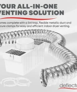 El Kit de Trampa de Pelusa para Secadora Interior Deflecto LTF es una solución confiable y eficiente en energía para ventilar secadoras eléctricas en interiores. Es ideal para apartamentos, condominios, vehículos recreativos y sótanos donde la ventilación exterior no es posible. Este kit completo incluye un duradero reservorio de pelusa de plástico, un conducto flexible metálico Supurr-Flex de 4 pulgadas de diámetro x 5 pies de largo resistente al fuego, y dos abrazaderas de plástico seguras para una instalación fácil. La trampa de pelusa captura de manera efectiva la pelusa que escapa, mejorando el rendimiento de la secadora, reduciendo los riesgos de incendio y minimizando el tiempo de secado. Al redirigir el aire cálido de vuelta a tu hogar, este diseño ahorrador de energía ayuda a reducir los costos de calefacción durante los meses más fríos. Ligero y compacto con solo 1.26 lbs de peso, y dimensiones de 6.375 pulgadas (Al) x 11 pulgadas (An) x 5 pulgadas (Prof), este kit eficiente en espacio mejora la funcionalidad de tu secadora con un esfuerzo mínimo. No es compatible con secadoras de gas.