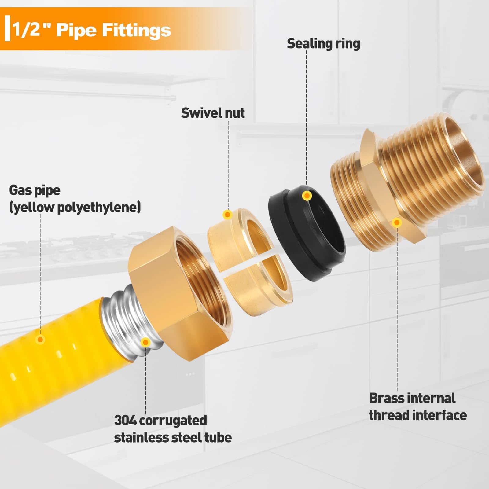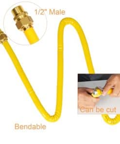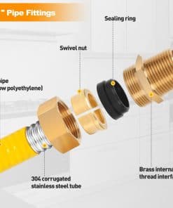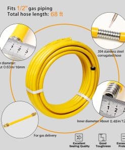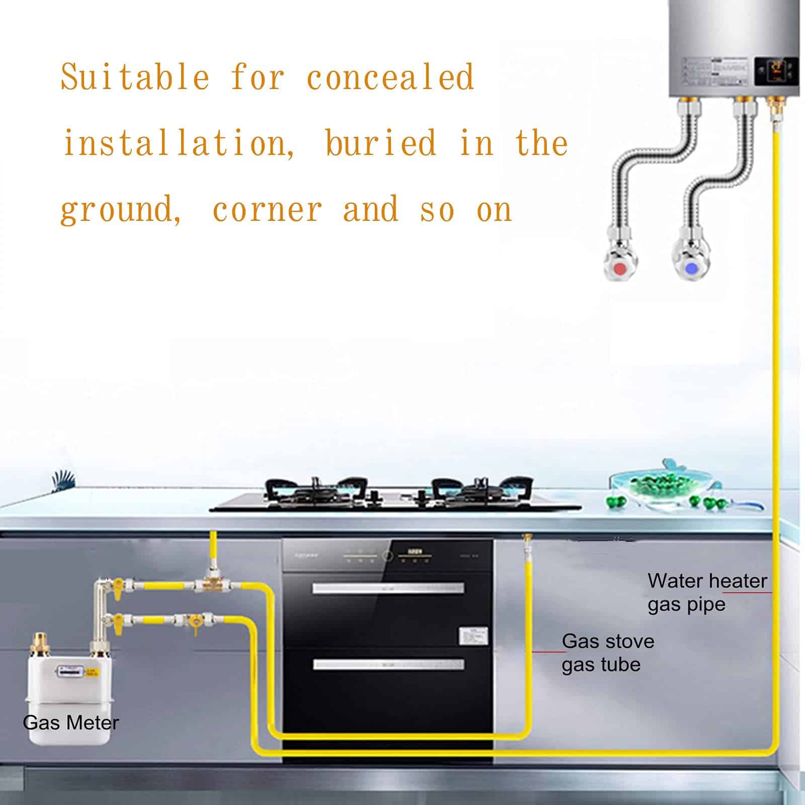 La tubería de gas natural está fabricada con acero inoxidable 304 de alta calidad en su interior y está rodeada por un tubo de goma para evitar fugas de gas. Cada tubo ha pasado pruebas de presión de tres capas, que lo hacen duradero, confiable en calidad y pueden extender su vida útil. Hay interfaces de conexión de latón macizo en ambos extremos, que tienen muy buena resistencia a la intemperie. El kit de tubería de gas es fácil de instalar, se puede cortar y doblar a voluntad, manteniendo el flujo interno inalterable, pudiendo doblarse y pasar libremente en un espacio reducido. No hay interfaz en el medio del cuerpo de la tubería, reduciendo el punto de conexión para prevenir fugas de gas y aumentar la seguridad. La manguera de gas para parrilla de gas natural funciona perfectamente, es fácil de instalar, duradera y muy rápida. Para uso con aplicaciones de gas natural, propano líquido, fosa de fuego de propano, fosa de fuego de gas natural, estufa de gas, calentador de agua. Por favor, preste atención al tamaño de la tubería al calcular la pérdida de presión. El tubo de acero inoxidable corrugado puede satisfacer las necesidades individuales de los usuarios, adoptando múltiples métodos de instalación como instalación en pared enterrada, oculta y expuesta. Adecuado para tuberías de gas pre-enterradas. Se puede decorar primero y luego colocar la tubería, lo que es conveniente para que los usuarios elijan el momento de colocarla. Por favor, asegúrese de una correcta instalación antes de usar para prevenir fugas de aire. Si falta el accesorio conector, contáctenos para un reemplazo gratuito. Gracias por su apoyo. La tubería de gas nunca debe estar enterrada directamente bajo tierra sin un conducto. Para enrutamiento subterráneo de la tubería, debe estar protegida dentro de un conducto impermeable no metálico que sea al menos » más grande que el diámetro exterior de la tubería CSST.