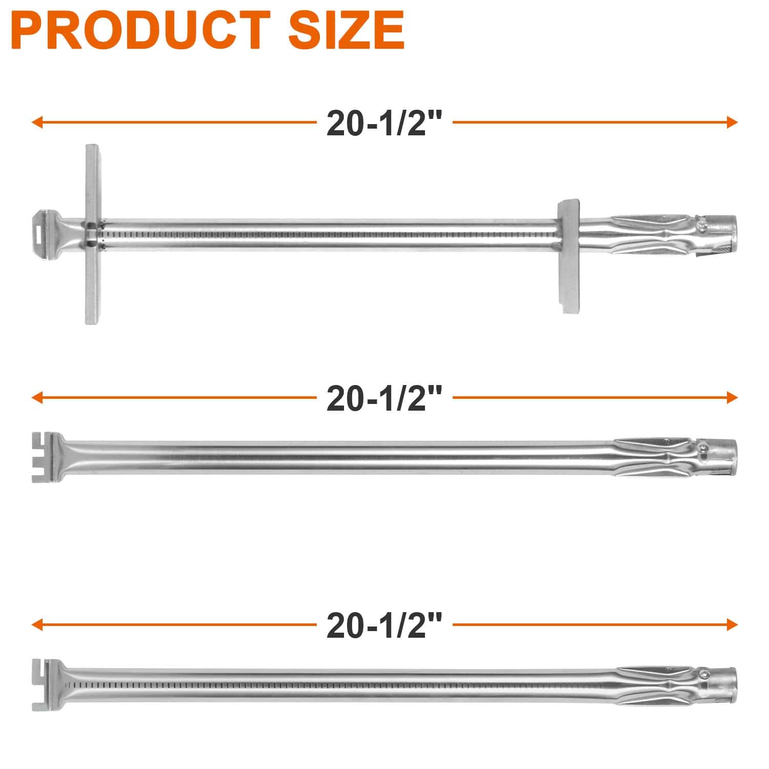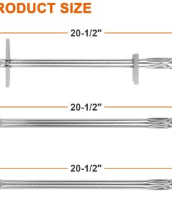 2. DIMENSIÓN y Paquete Juego de 6 tubos principales de quemadores de acero inoxidable. El kit de tubo de quemador incluye 4 tubos principales de quemadores, 1 tubo de quemador de sellado, 1 tubo de quemador para ahumadores. Cada tubo de quemador mide 20-1/2″ L.