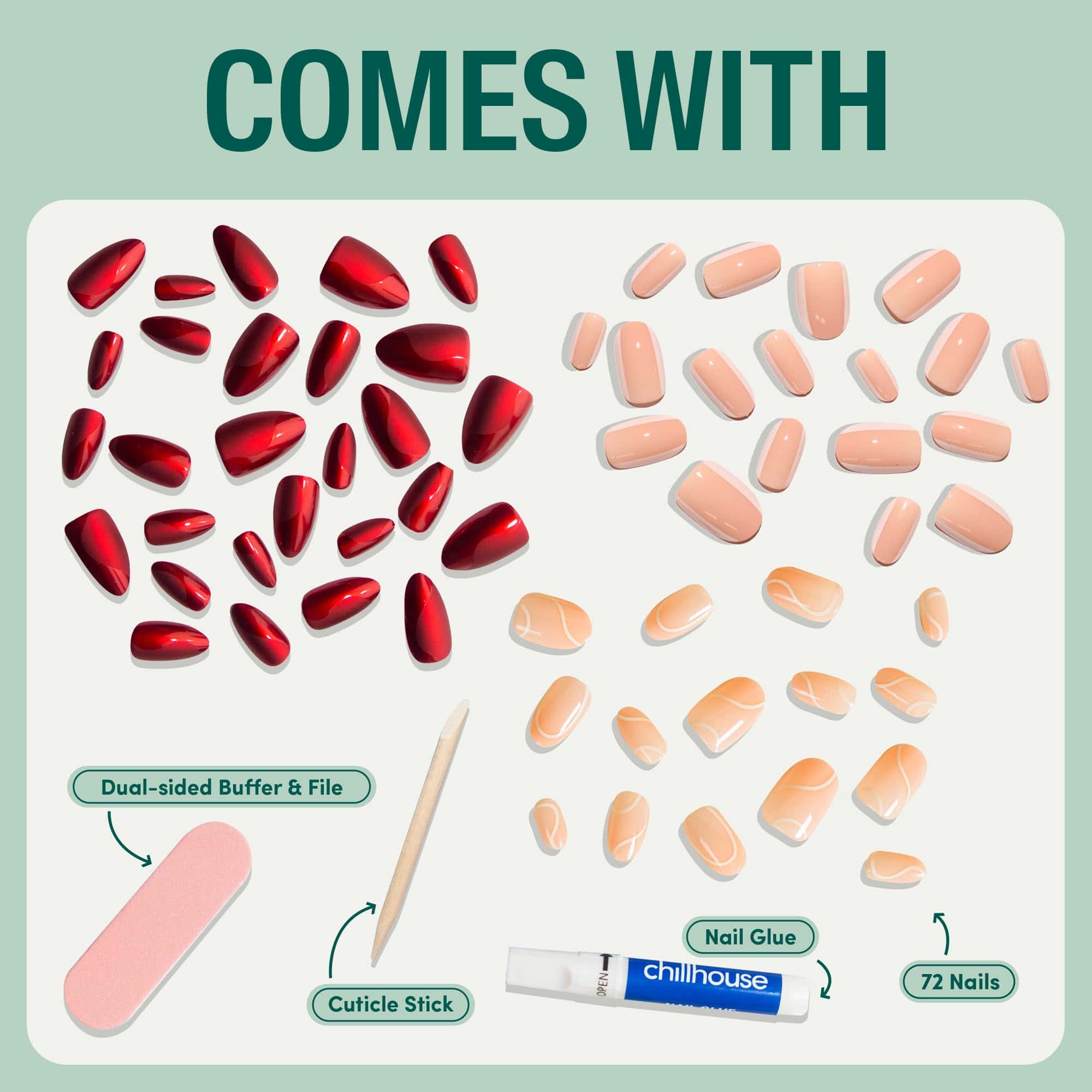 3. Cómo Usar – Aplica una capa de pegamento en la parte trasera del Chill Tip. Aplica pegamento para uñas en tu uña natural. Espera 3 segundos para que el pegamento se active. Presiona y sostén el Chill Tip en la uña natural durante al menos 30 segundos. Perfecciona la forma y sensación usando herramientas para uñas.
