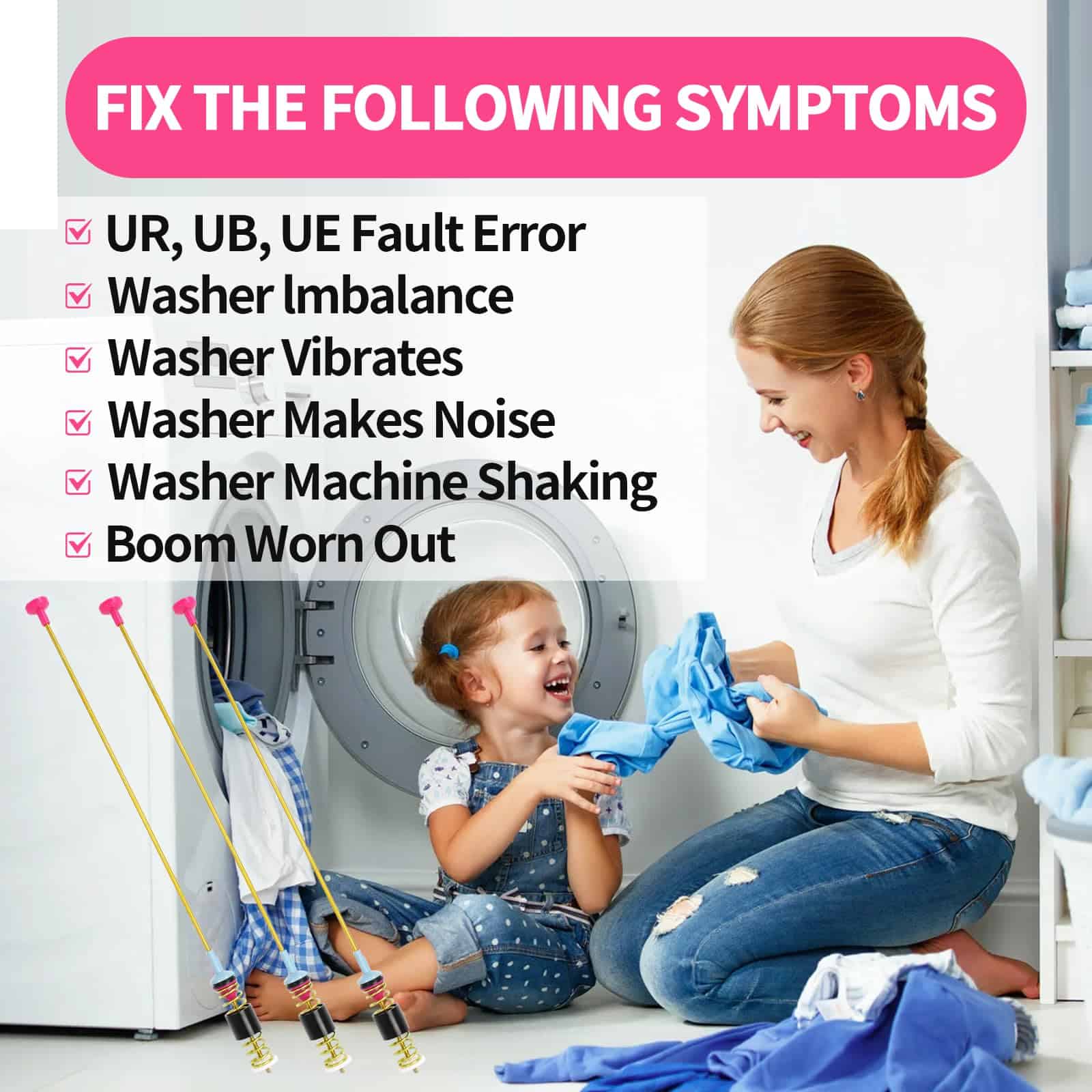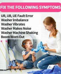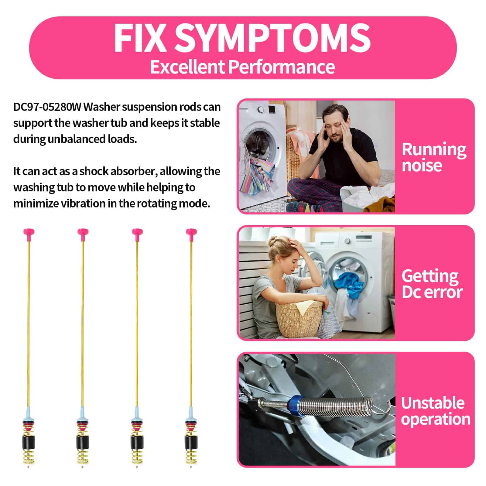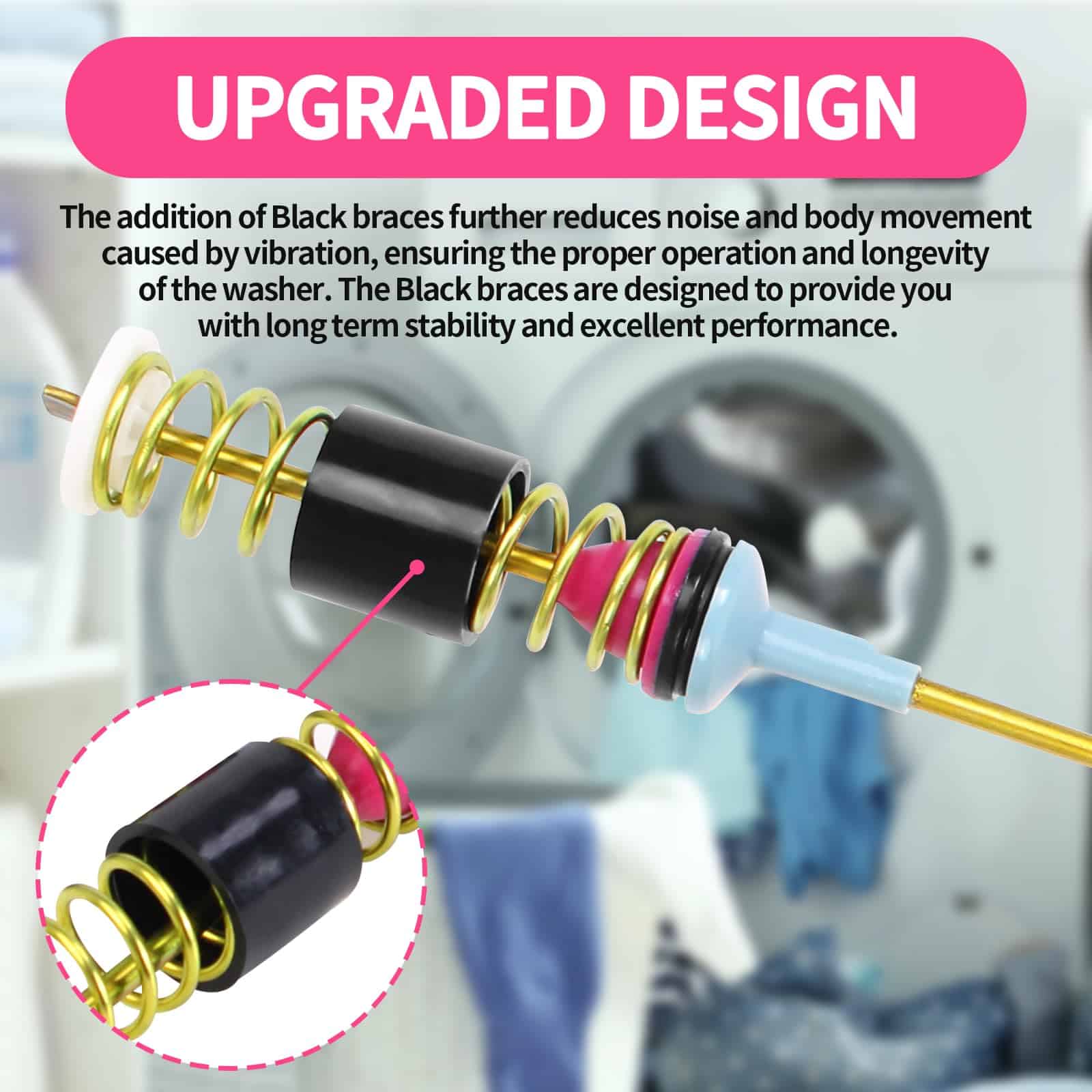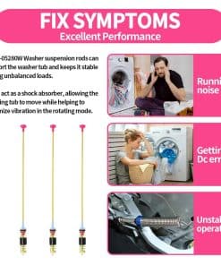 El kit de suspensión de la lavadora muestra códigos de error como UR/UB/UE, esto se debe a que las varillas de suspensión de la lavadora bajo ciertas temperaturas y ciertos esfuerzos sufren de deformación plástica, lo que resulta en una fuerza de resorte inconsistente, seguida de una carga desequilibrada, lo que provocará un ciclo de centrifugado que iniciará repetidamente, pero nunca centrifugará, reemplazar las 4 varillas de suspensión DC97-05280W a menudo corrige la pérdida de equilibrio en la lavadora y resuelve el problema de mostrar estos códigos de error. Las varillas de suspensión de la lavadora DC97-05280W cumplen o superan las especificaciones de fábrica y son una coincidencia exacta con las lavadoras de stock y son un reemplazo directo.