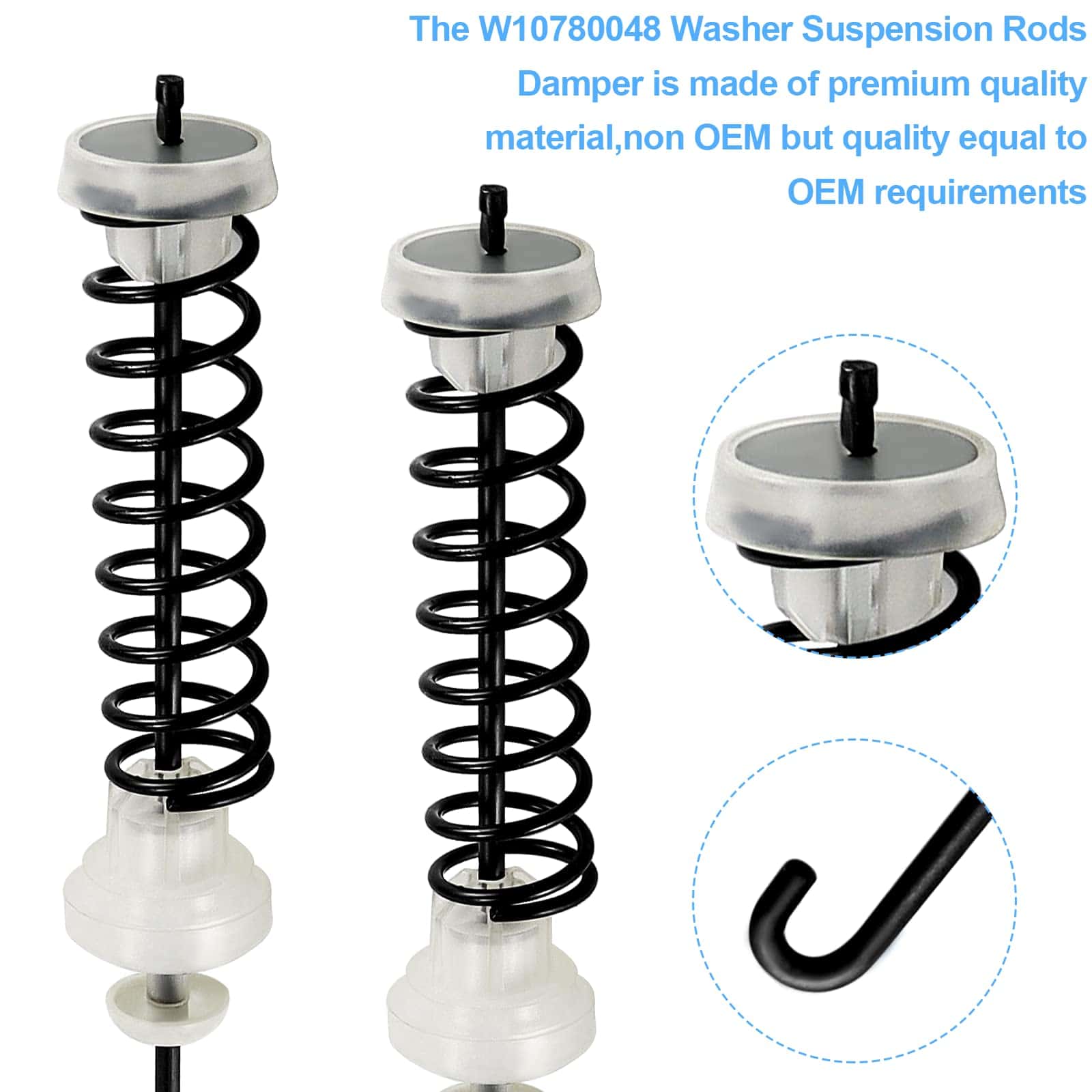 Una lavadora tiene cuatro varillas de suspensión (una en cada esquina) que soportan el tambor. Cuando una o más de las varillas de suspensión fallan, la lavadora se desequilibra y se balancea durante el funcionamiento. Reemplace las cuatro varillas de suspensión a la vez para equilibrar la lavadora. El kit de varillas de suspensión W10780048 de TOMOON ofrece la durabilidad que necesita a una fracción del costo de otras alternativas. El kit incluye: 4 varillas de suspensión, 4 bujes, 4 bolas de suspensión e instrucciones. Consejos de instalación: Desconecte la lavadora de su fuente de energía y de agua antes de comenzar la reparación. Las marcas y modelos compatibles incluyen pero no se limitan a: Whirlpool: 7EWTW1300YM0, 7EWTW1409YM0, 7EWTW1515YW0, 7EWTW1715YW0, 7MWTW1500AQ0, 7MWTW1501AW0, 7MWTW1501AW1, 7MWTW1501AW2, 7MWTW1502AW0, 7MWTW1502AW1, 7MWTW1502AW2, entre otros.