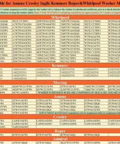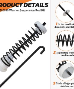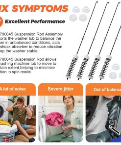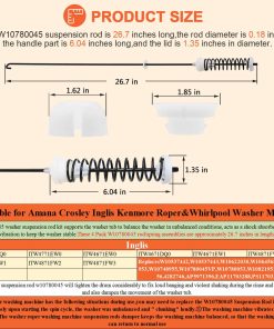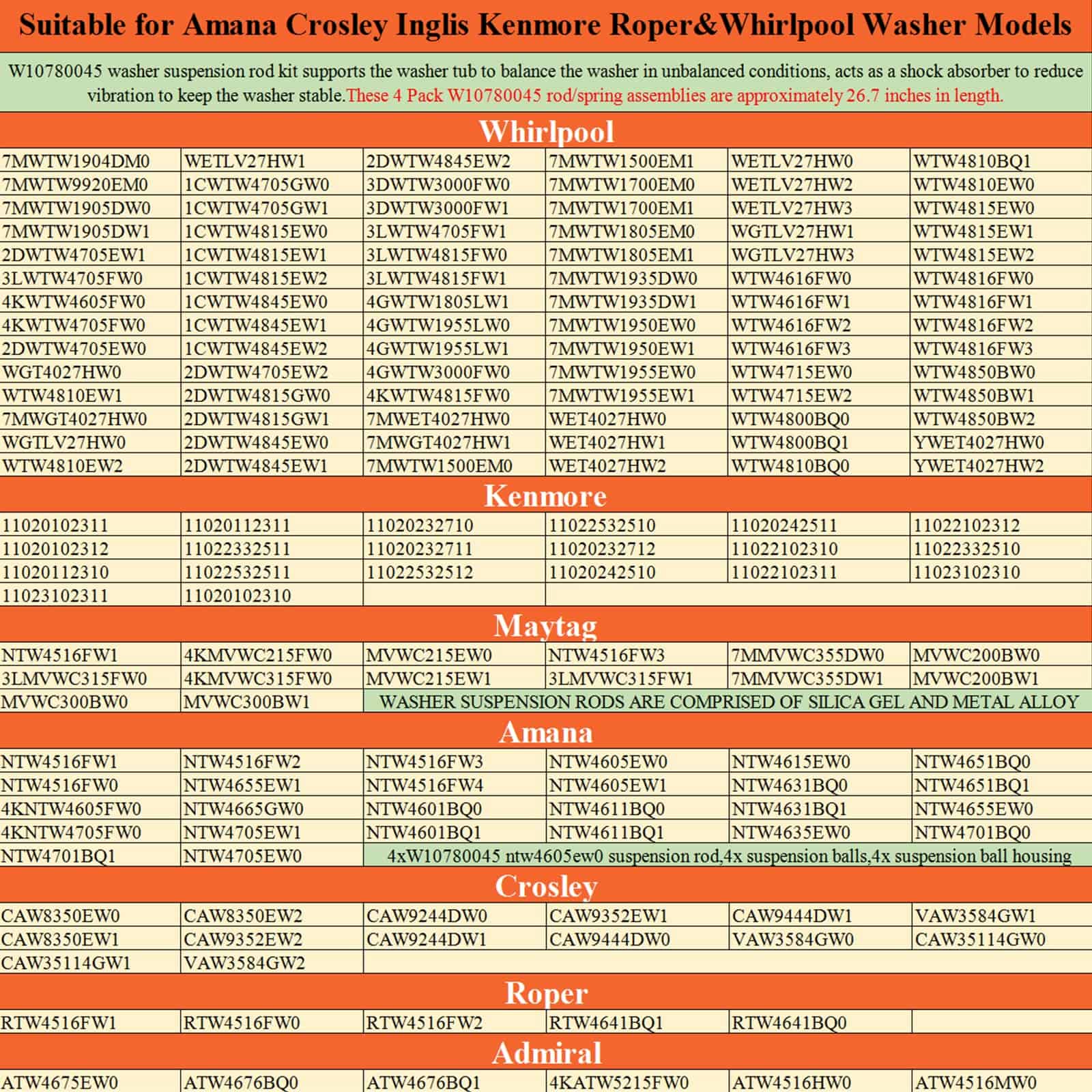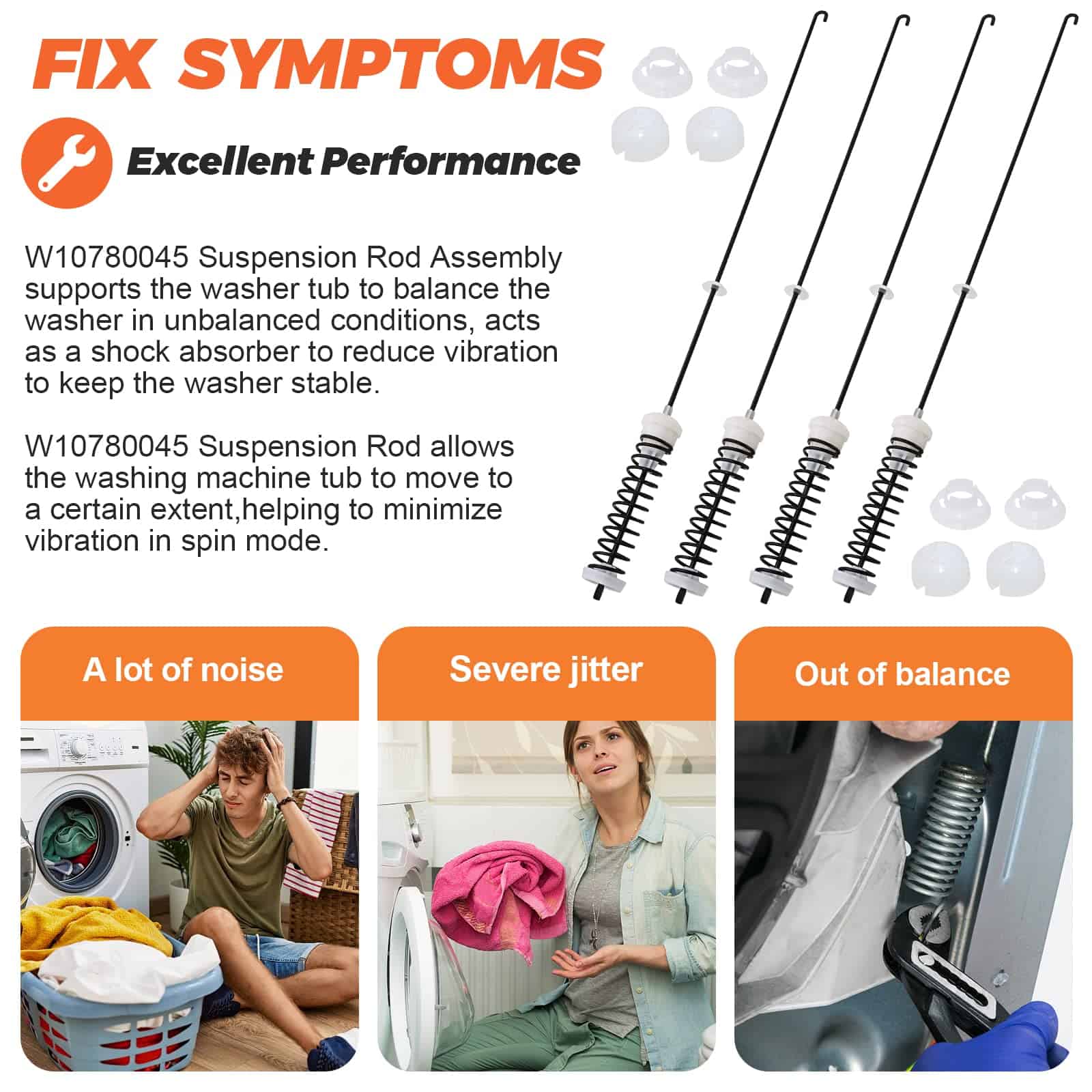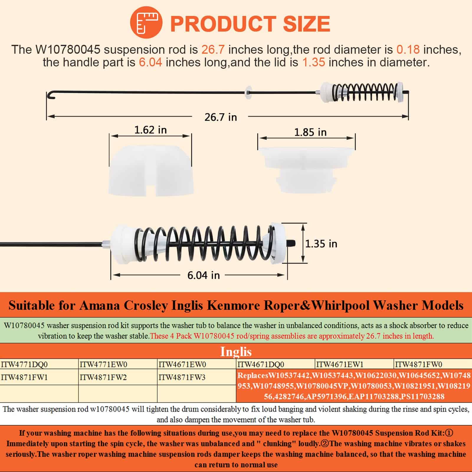PRODUCTO: Kit de varillas de suspensión W10780045 para lavadoras. Incluye 4 varillas de suspensión, copas de bolas e instrucciones. Tamaño del amortiguador de suspensión de lavadora W10780045: 31″ x 4″ x 3″. SOLUCIONA LOS SIGUIENTES SÍNTOMAS: Lavadora ruidosa, fugas, ropa más húmeda, vibraciones o temblores. COMPATIBLE CON LA MAYORÍA DE LAS MARCAS: Amana, Crosley, Inglis, Kenmore, Roper, Whirlpool. COMPATIBLE CON LOS SIGUIENTES MODELOS: Kenmore: 11020102310 11020102311 11020102312 11020112310 11020112311. Whirlpool: 7MWTW1904DM0 7MWTW1904DM1 7MWTW9920EM0 7MWTW1905DW0 7MWTW1905DW1. Inglis: ITW4771DQ0 ITW4771EW0 ITW4671EW0. Admiral: ATW4675EW0 ATW4676BQ0 ATW4676BQ1. Crosley: CAW8350EW0 CAW8350EW1 CAW8350EW2 CAW9352EW2 CAW9244DW0 CAW9244DW1 CAW9352EW1 CAW9444DW0 CAW9444DW1.