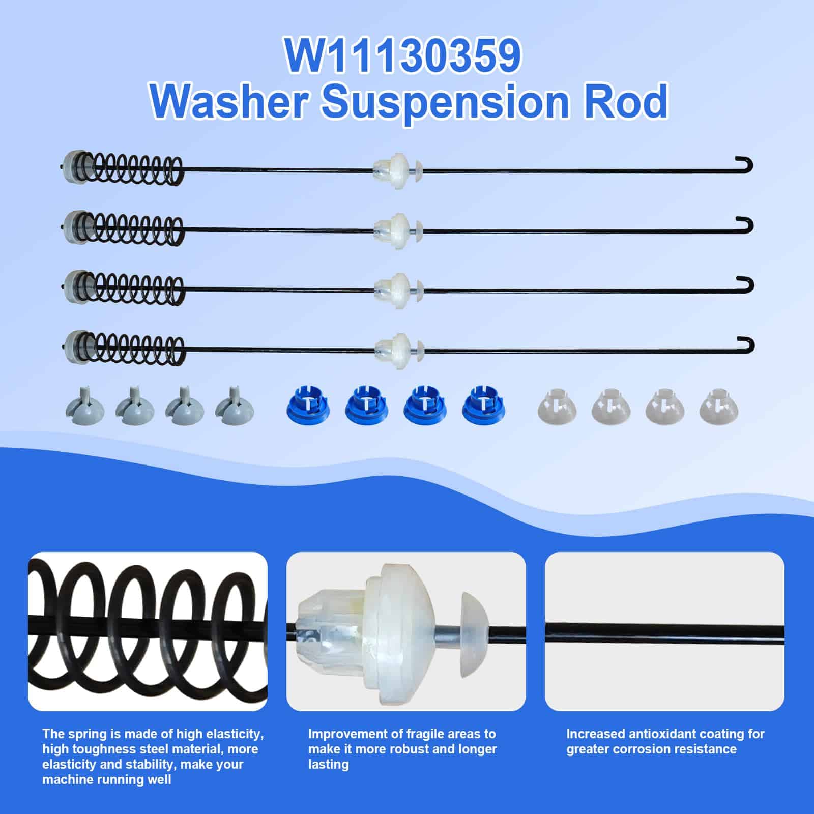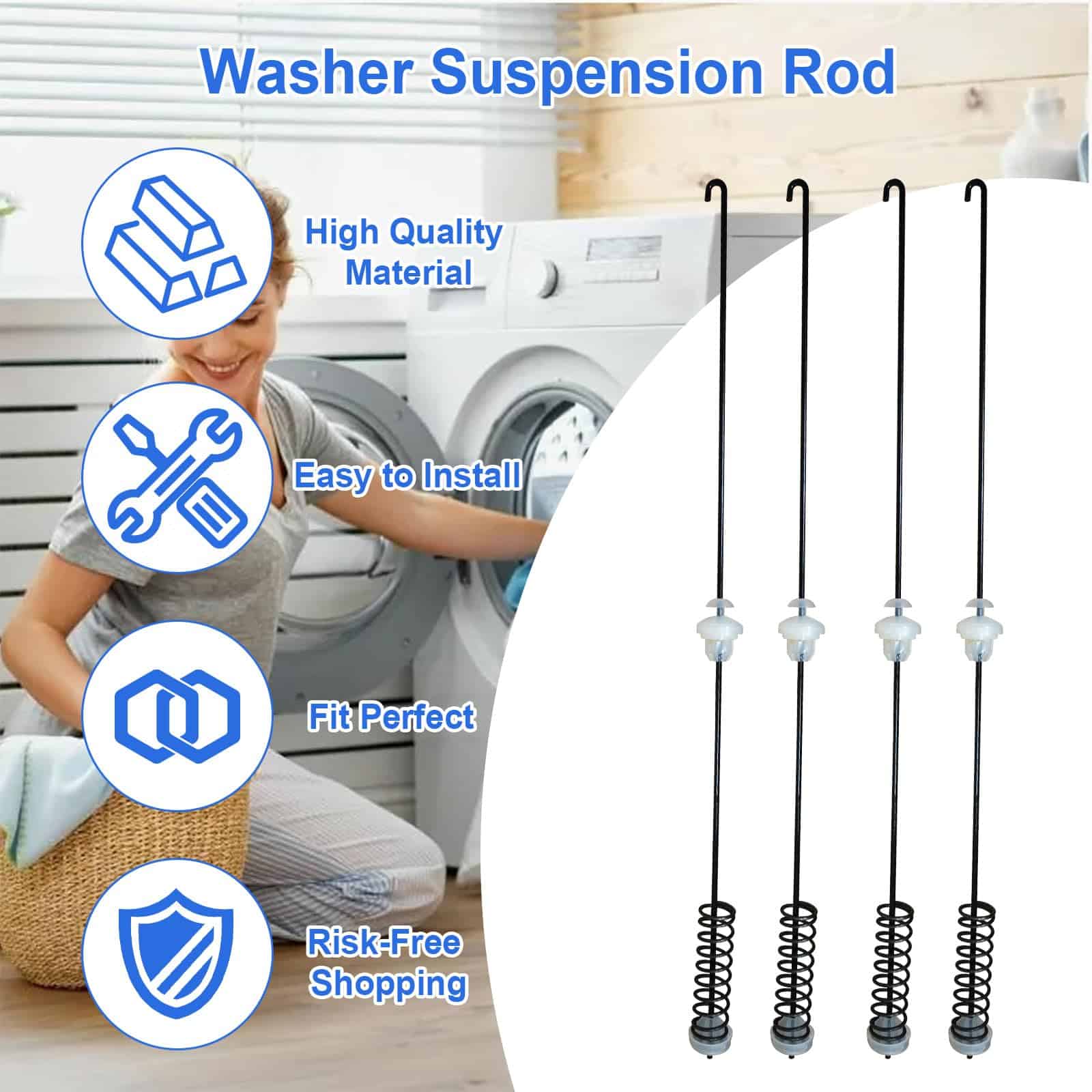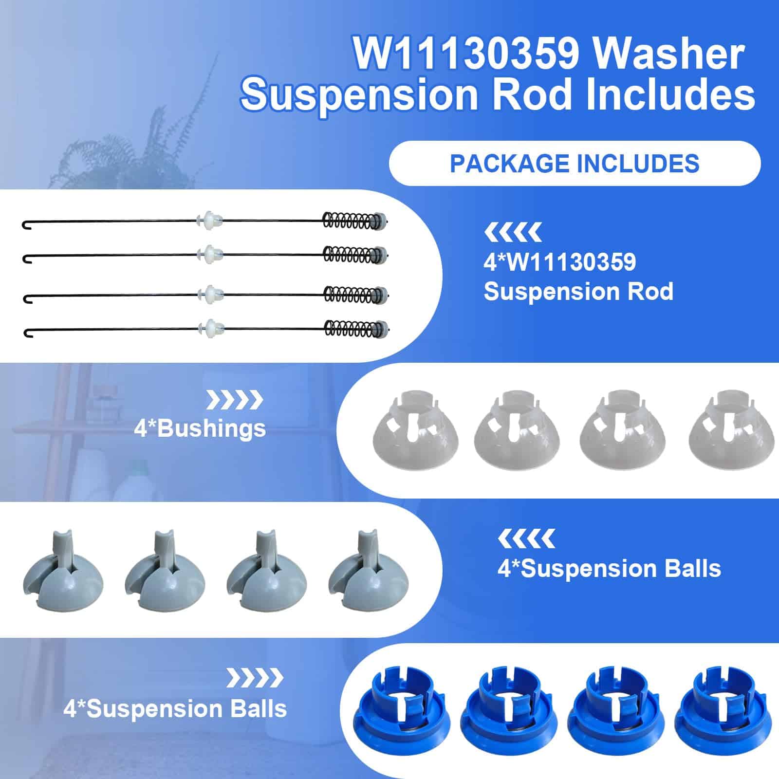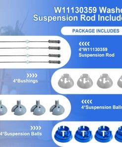 Kit de Varillas de Suspensión W11130359 Compatible con Whirlpool Maytag Kenmore Crosley – Reemplaza W10594082, W10785954, W10821704, W10901060, W11027215, W11033536, W11226784 y más. ¡Mejora el rendimiento de tu lavadora con este kit de suspensión de alta calidad! Este kit incluye cuatro varillas de suspensión, cuatro bolas de suspensión y cuatro bujes para garantizar una reducción de la vibración y el ruido, proporcionando una experiencia de lavandería más suave. Compatible con una amplia gama de modelos de lavadoras Whirlpool, Maytag, Kenmore y Crosley. Las varillas de suspensión W11130359 pueden arreglar problemas como ruido excesivo, sacudidas violentas, problemas de desbalance durante el centrifugado, suspensión rota y códigos de error como UE o DC. Garantiza un lavado suave y eficiente. ¡Ahorra tiempo y dinero con este kit de varillas de suspensión de calidad premium! ¡Compra ahora!