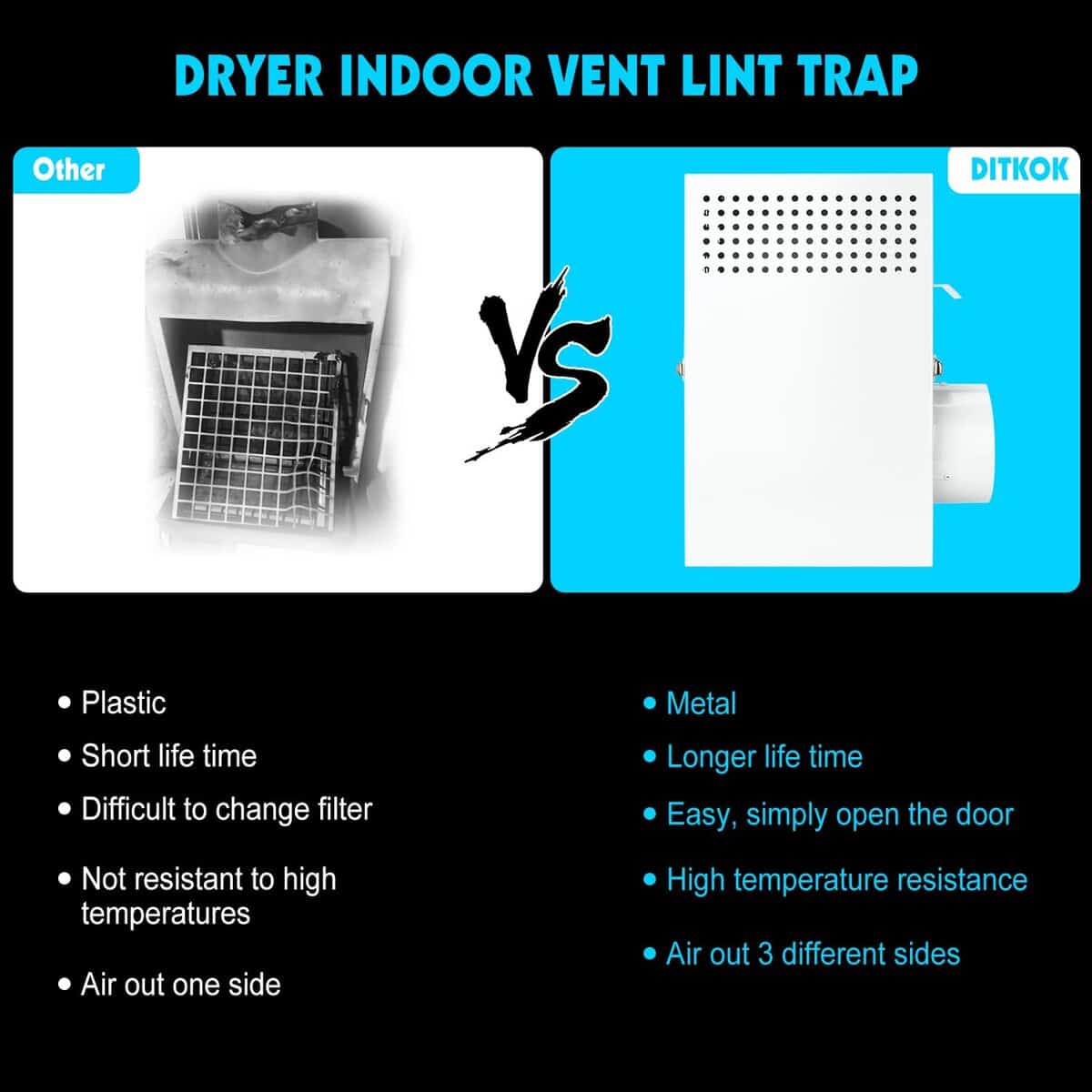 El Único Hecho de 24 calibres de Acero Galvanizado Kit de Ventilación de Secadora diseñado para Instalación en Interiores. Tradicionalmente, las ventilaciones de secadora hechas de plástico eran una mala idea, ya que las personas usan plástico y otros materiales combustibles que no son seguros para la ventilación de secadoras. No hay necesidad de preocuparse, la Ventilación de Secadora Interior de DITKOK es extremadamente segura de usar.