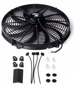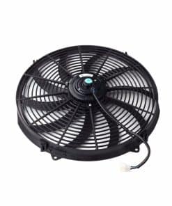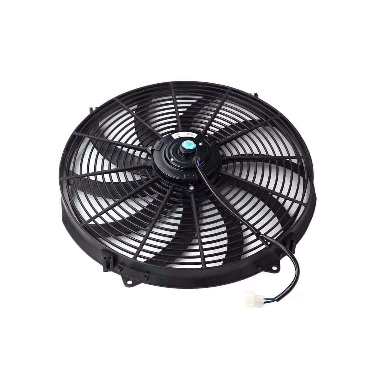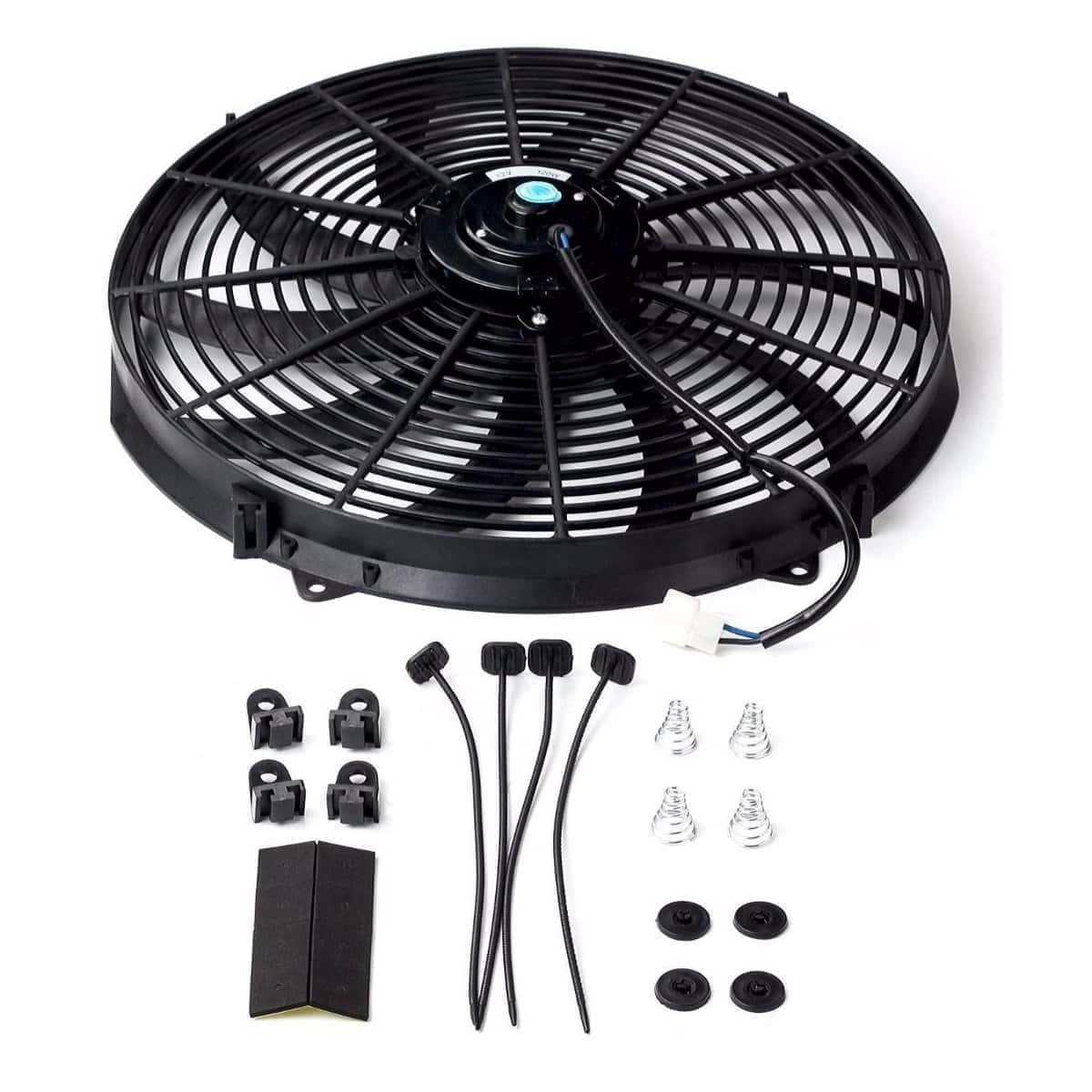 Ventilador eléctrico Ventilador de refrigeración eléctrico reversible de 16 pulgadas de 12 voltios. Ajuste universal para hot rods, motores clásicos y vehículos modernos. El potente motor de 80 vatios mantendrá su motor fresco. Configurado como extractora de aire de fábrica. La cuchilla y el cableado se pueden invertir para hacer del ventilador un empujador de aire. Para radiadores, enfriadores de aceite, enfriadores de transmisión, condensadores y más. Incluye accesorios de montaje y kit de correa de sujeción. Tamaño de la cuchilla: 15 pulgadas Tipo de cuchilla: Curvada Tamaño del motor: 80 vatios Clasificación CFM: 3000 Clasificación RPM: 2050 Amperios: 15 amperios Material: Carcasa de plástico/motor de acero