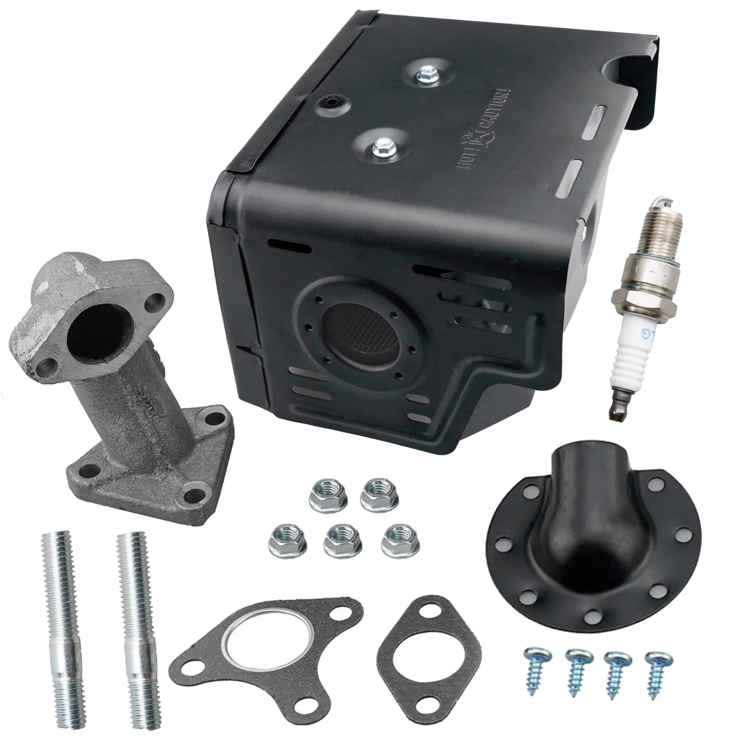 Este kit de muffler de escape de 420cc reemplaza el ensamble del muffler de Honda GX390 y el ensamble del muffler de Honda GX340. El kit incluye el muffler de Honda GX390, el muffler de Honda GX340, el tubo de escape de GX390 o colector, la cubierta del muffler o protector del muffler, el deflector de escape de GX390 o deflector de muffler de GX340, 5 tuercas, 2 pernos de montaje y 2 juntas para el muffler, así como 1 bujía para la necesidad de mantenimiento regular de su motor. Reemplaza el ensamble del muffler de Honda GX340, el ensamble del muffler de Honda GX390 y el ensamble del muffler de Honda GX420. Los números de parte incluyen muffler 18310-ZE2-W61, 18310-ZE2-W62, protector de muffler, cubierta de muffler o protector de muffler 18320-ZE2-W61, 18320-ZE2-W62, 18320-ZE3-W02, tubo de escape o colector 18330-ZE2-W00 / 18330-ZH9-N00. Este muffler de escape de Honda GX 390 con deflector se ajusta al motor Honda GX390 de 13hp, bomba de agua, lavadora a presión, compresor y más aplicaciones alimentadas por el motor Honda 390 GX 13 hp, incluyendo muchas lavadoras a presión de 4400psi y 4200psi, separador de troncos de 37 toneladas y muchos más. Es un excelente reemplazo para el muffler de Honda de 13hp y el muffler de Honda de 11hp. Reemplaza el muffler de escape de Honda de 13HP y el muffler de escape de Honda de 11hp para el motor Honda 390 y el motor Honda 340. Este ensamble de muffler de 420cc con deflector también se ajusta a muchos otros motores de clon de Honda de 338 cc, 340 cc, 389 cc, 390cc, 420 cc, 439 cc, incluyendo el motor Harbor Freight Predator 420cc, el motor Champion 389cc 420cc, el motor Powerease 420cc, el motor Rato 420cc, el motor Loncin 389cc 420cc, el motor Duromax 420cc, el motor Dewalt 420cc, el motor Simpson CRX420, el motor Genkins GK420E 420cc, el motor Ducar 389cc, el motor DH420 420cc y muchos más motores de 11hp 13hp 15hp 16hp.