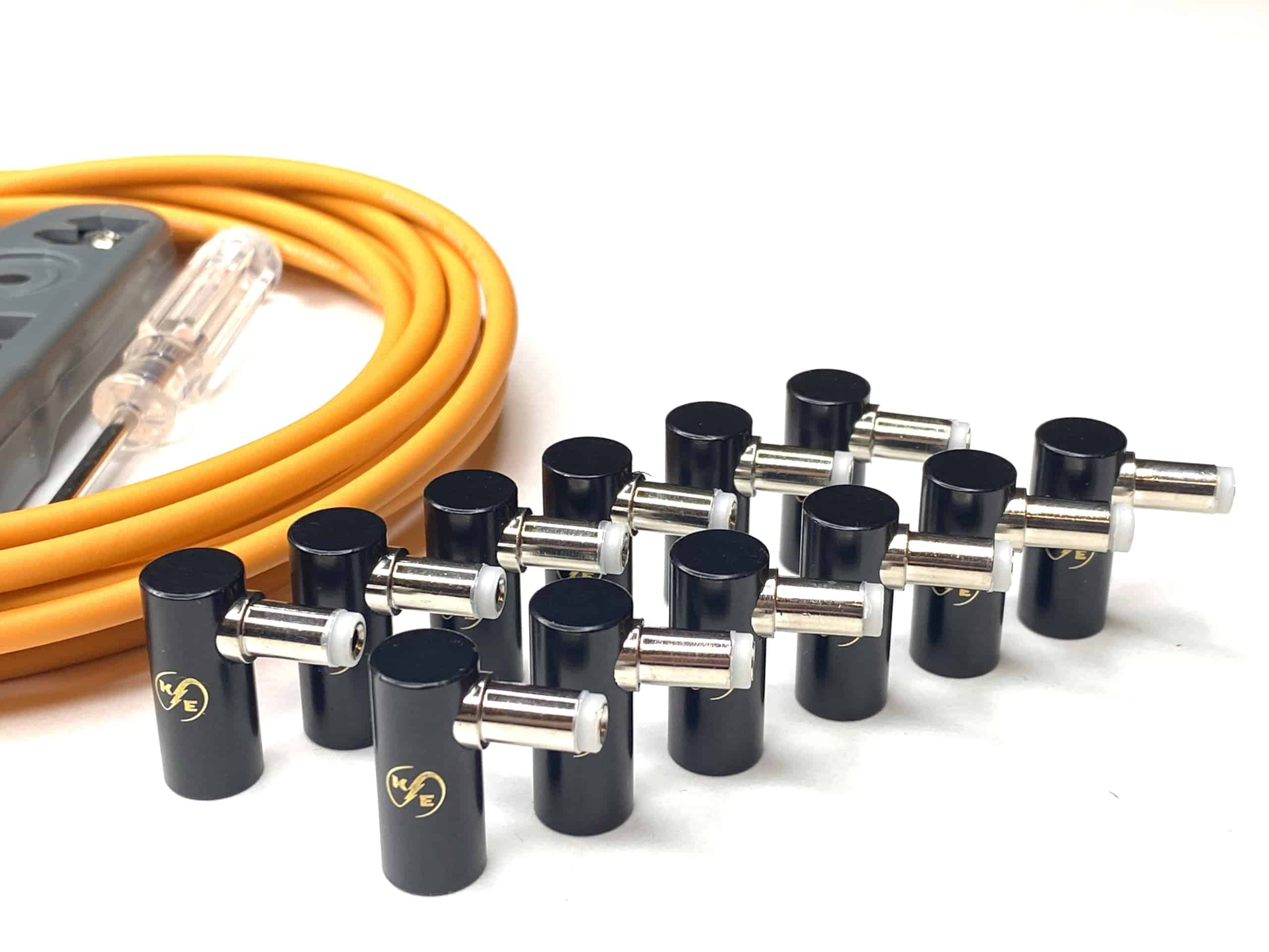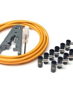 Cree sin esfuerzo cables patch de alimentación DC de longitud personalizada para sus pedales de efectos de guitarra con el Kit DIY de Conector de Barril DC en Ángulo Recto sin Soldadura de Kurrent Electric. Este innovador kit le permite construir cables duraderos y confiables adaptados a las necesidades específicas de su pedalboard. Elimine la soldadura desordenada y el cableado complejo, haciendo que la gestión de cables sea muy sencilla. Con su diseño amigable para el usuario, puede ensamblar con confianza cables de calidad profesional en minutos. Disfrute de la comodidad de las longitudes de cable personalizadas, asegurando una configuración ordenada y organizada del pedalboard. Maximice su creatividad y desbloquee todo el potencial de sus pedales de efectos de guitarra con este versátil kit DIY.
