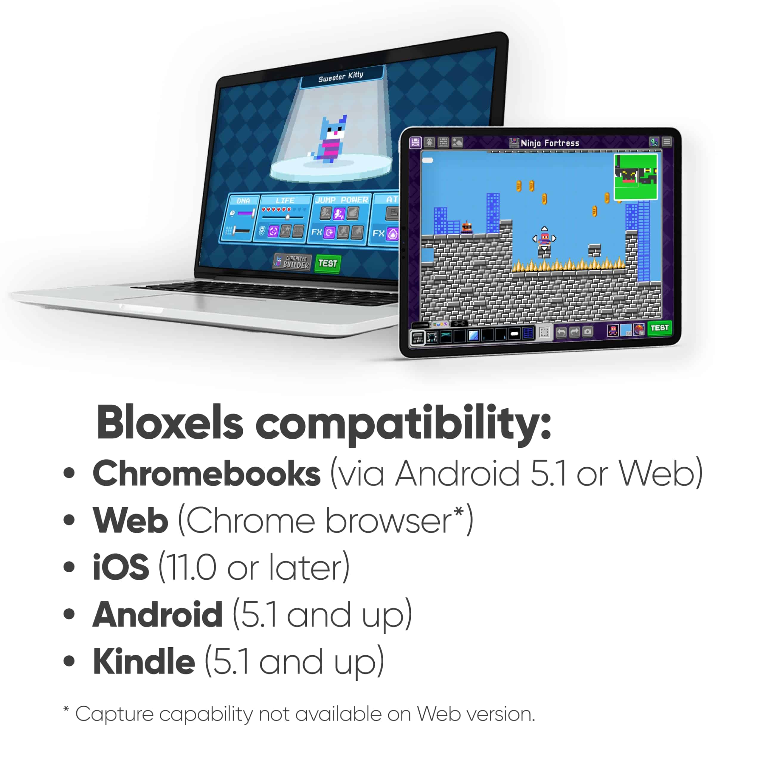 ¡Ya está aquí el nuevo Bloxels! El Kit Bloxels Game Studio pone el poder de construir videojuegos en tus manos. Crea tus creaciones usando el tablero y bloques de juego incluidos – luego captúralos con la aplicación Bloxels para llevarlos a tus juegos. Construye, juega y comparte tus propios juegos e historias interactivas. Crea personajes, construye un mundo y cuenta tus historias. Cuando estés listo, publica tus juegos en el Bloxels Arcade y juega los juegos de otros creadores de Bloxels. Se incluye una cuenta Bloxels con la compra del Kit Game Studio. Se requiere una cuenta Bloxels para usar la aplicación Bloxels. La aplicación Bloxels es compatible con iOS, Android, Kindle y navegadores web.
