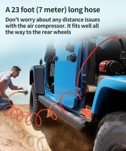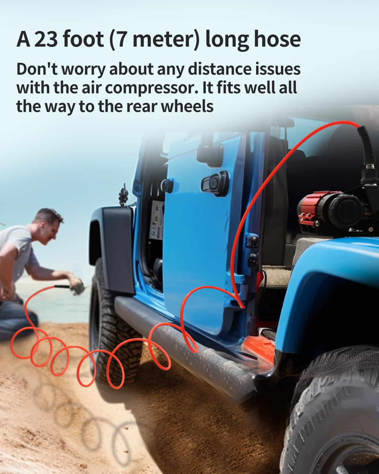 3. Una manguera de 23 pies (7 metros) de largo: No se preocupe por problemas de distancia con el compresor de aire. Se adapta perfectamente hasta las ruedas traseras.