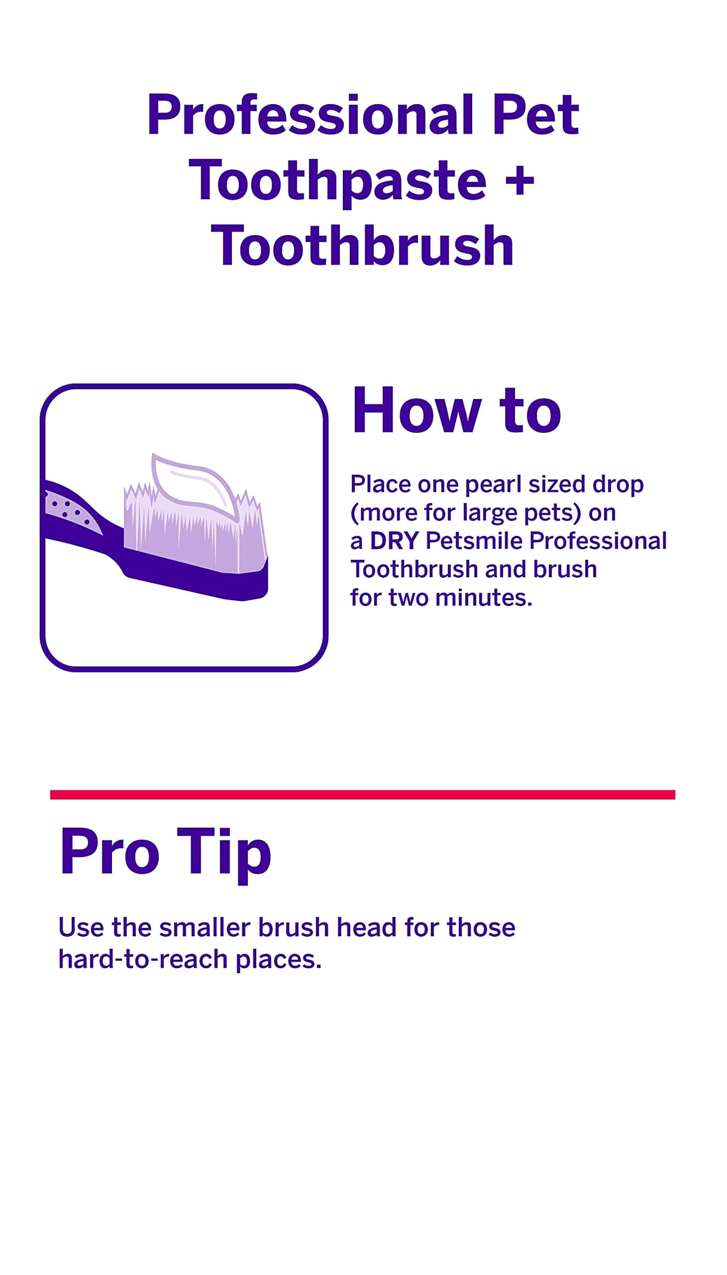 Petsmile es la única pasta de dientes recomendada por la VOHC para su mascota con Calprox. Los veterinarios eligen a Petsmile debido a los ingredientes de alta calidad que promueven dientes blancos y encías saludables. La VOHC reconoce que Petsmile cumple con los estándares más altos para la salud oral de su mascota. Usar la pasta de dientes Petsmile y cepillar diariamente mejorará significativamente la salud oral de su mascota. La fórmula patentada de Petsmile, Calprox, está clínicamente probada para inhibir la acumulación de placa y sarro, mientras blanquea los dientes disolviendo suavemente el películo de proteínas. El películo de proteínas es la fina película biológica que se forma en la superficie de los dientes, a la que se adhieren la placa, las bacterias y las manchas. Al eliminar el películo de proteínas, deja los dientes de su mascota más limpios y más blancos, mejorando la salud de las encías y proporcionando un aliento fresco besable. Para obtener los mejores resultados, simplemente aplique la pasta de dientes Petsmile en los dientes de su gato o perro y cepille una o dos veces al día. El cepillo de dientes de doble punta tiene una cabeza de cepillo pequeña y grande, para adaptarse a una amplia variedad de tamaños de mascotas. Además, las cerdas suaves están anguladas a 45 grados para ayudar a llegar debajo de la línea de las encías y prevenir la acumulación de sarro y placa. Su mascota puede comer o beber inmediatamente después de aplicar la pasta de dientes Petsmile. Los ingredientes incluyen Calprox, agua desionizada, glicerina, ácido cítrico, fosfato dicálcico dihidratado, goma de celulosa, peróxido de urea, carbopol 934P, hidróxido de potasio, sabor, benzoato de sodio, ácido fosfórico y cloruro de cetilpiridinio. Al usar solo ingredientes de grado humano, puede estar seguro de que su mascota está usando la mejor pasta de dientes para mascotas en el mercado. La pasta de dientes Petsmile es hipoalergénica y está hecha solo con los ingredientes de la más alta calidad que promueven dientes y encías saludables.