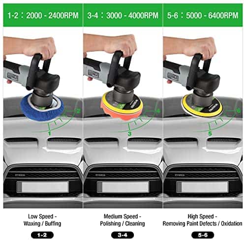 Motor de larga vida útil y pulidor de doble acción – Alambre de cobre puro con motor de alta calidad, potencia fuerte y baja sonoridad. 9 mm de accionamiento orbital de doble acción, diseño compacto que ofrece un pulido potente y consistente, corrección de pintura. La estructura de cepillo de carbono incorporada garantiza seguridad y larga vida útil, no se encontrará con el problema de que el pulidor orbital o la máquina de pulir no funciona a medias. 7 velocidades variables – El dial de velocidad variable de 7 niveles le permite controlar la velocidad de 2000 a 6400 OPM (velocidad sin carga) según las diferentes aplicaciones; baja velocidad para encerar y pulir; velocidad media para pulir y limpiar, mientras que la alta velocidad es para eliminar defectos de pintura y oxidación. Adecuado para principiantes – El diseño de eje excéntrico de nuestro pulidor de doble acción, el uso de vibración excéntrica para pulir, la cera se absorbe profundamente por la pintura del auto, la eficiencia de pulido es alta y la potencia es fuerte. Fácil y seguro para principiantes, lo suficientemente potente para profesionales. 2 tipos de diseño de mango: mango D ergonómico ajustable (desmontable y portátil) y mango lateral que le brindan un agarre cómodo; de acuerdo con sus propias costumbres para instalar diferentes mangos, y el cuerpo de goma para un control antideslizante durante el uso. El pulidor orbital aleatorio WORKPRO es perfecto para pulir y eliminar remolinos, arañazos y defectos de todos los vehículos pintados, con una amplia gama de aplicaciones, como encerar el piso, pulir autos, reparar arañazos o pulir la superficie de cualquier objeto liso. Con placas y almohadillas de 6″, también puedes usarlo en muebles, cerámica, madera y metal.