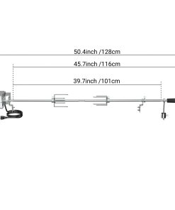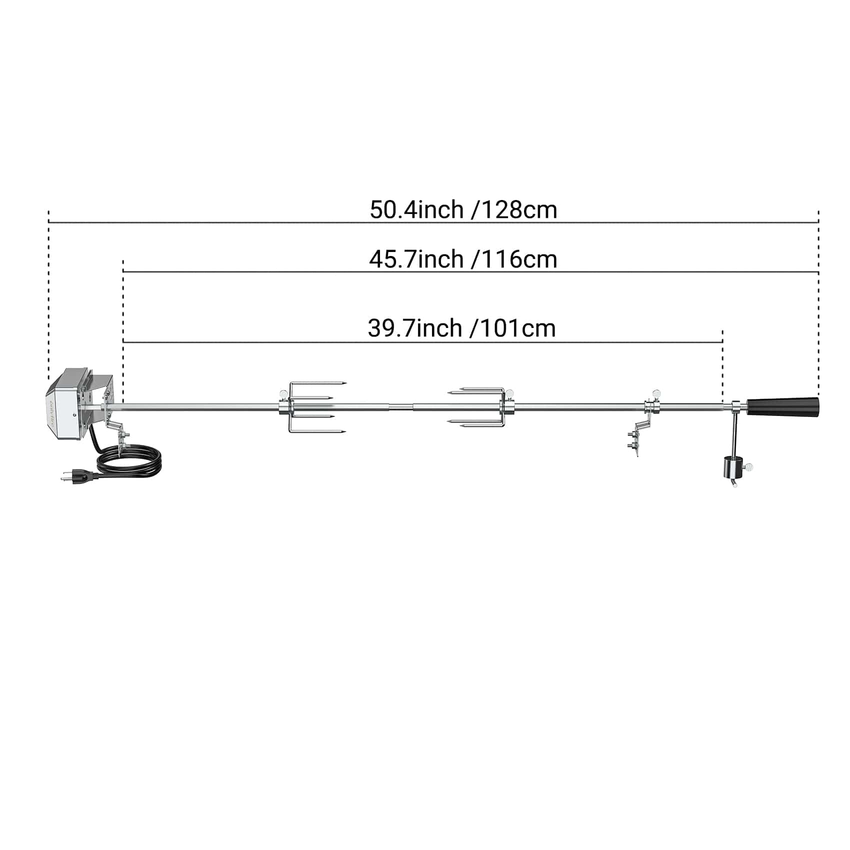 1. Motor rotisserie eléctrico de 110V. Fácil de usar y conveniente, a diferencia de la versión inalámbrica, no es necesario cambiar la batería con frecuencia. El motor de 4 vatios mantiene el asador girando a una velocidad constante y sostenida, asegurando que cada pulgada de la carne se cocine de manera uniforme y esté jugosa. Soporta hasta 20 lbs de comida, PERO NO se recomienda cocinar corderos o cerdos enteros.