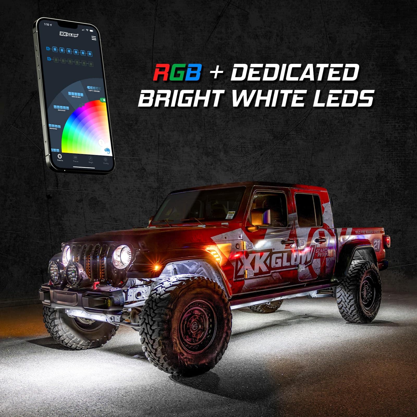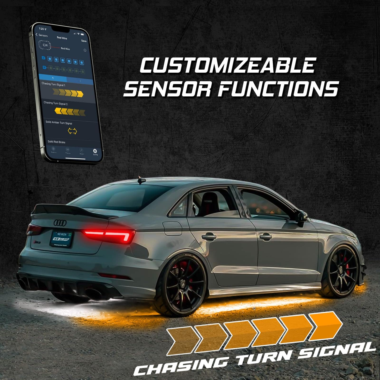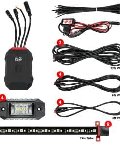 Características clave: Kit de 4a generación con funciones avanzadas de persecución direccionable. Sincroniza la luz con la música con efectos de secuenciación avanzados de estilo «ecualizador». Más de 22 temas de persecución de luz actualizados. Selecciona entre 16 millones de colores o elige uno con tu cámara. Ahora hasta 10 zonas en un solo controlador. Tres cables de sensor totalmente personalizables. Conectores y cables mejorados. Resistente al agua IP67. 2 tamaños de kit disponibles. Nuestra tecnología de última generación permite una experiencia de personalización definitiva. Con adaptadores LED direccionables, el sueño de las luces de persecución ha terminado. ¡Lo hemos hecho realidad! Hay múltiples temas predefinidos con diferentes patrones de persecución, o puedes construir uno desde cero. Nuestra tecnología LED direccionable también te permite configurar hasta 10 zonas diferentes en un solo controlador XKalpha. Los cables de sensor ahora se pueden configurar para casi cualquier cosa que desees que hagan. Todas las luces pueden volverse rojas con un destello inicial al aplicar los frenos, o incluso una señal de giro que persigue la moto. Convierte tu motocicleta en un ecualizador en persecución cuando reproduces música, incluso música de terceros, a través de la aplicación. ¡Y esto es solo el resumen! ¡Las posibilidades son infinitas con el sistema XKalpha! Especificaciones técnicas MOTOR BAJO MOTOR BAJO + PASARUEDAS Precio $399.99 $549.99 Número de artículo AP-CAR-STA AP-CAR-ADV Tubos de 24 pulg. 8 piezas 8 piezas Luces de roca 0 piezas 4 piezas Controlador: Entrada de CC de 12V. 50W por canal. Dos canales de salida. Consumo máximo de energía: 5.4W por foco, 4.8W por tubo de 24 pulg. 3 cables de sensor programables.