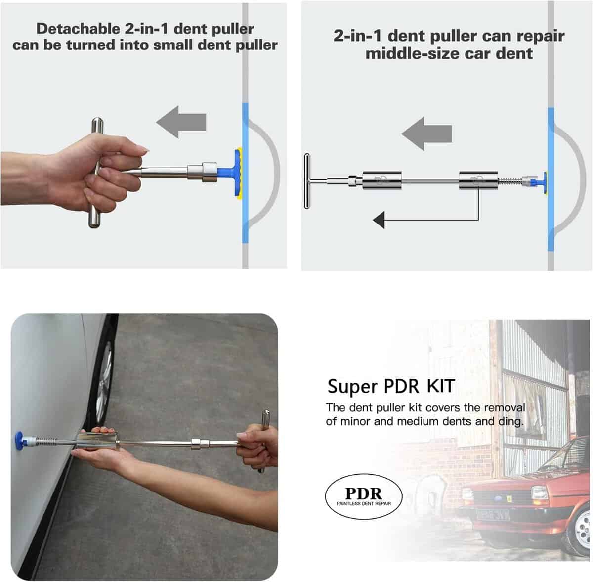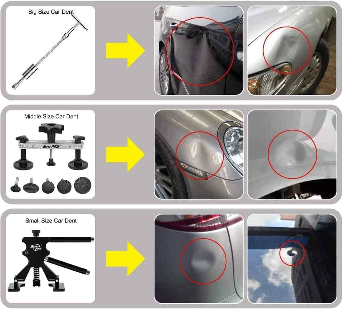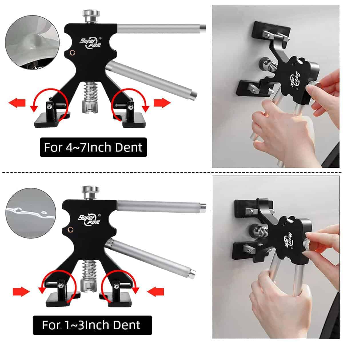 4. No solo para coches: Estos desatornilladores de abolladuras de coches no solo se pueden utilizar para reparar la mayoría de los tipos de abolladuras de vehículos causadas en la marcha atrás, al girar, arañazos, granizo y otras situaciones, sino que también pueden reparar abolladuras en la superficie de refrigeradores y lavadoras.