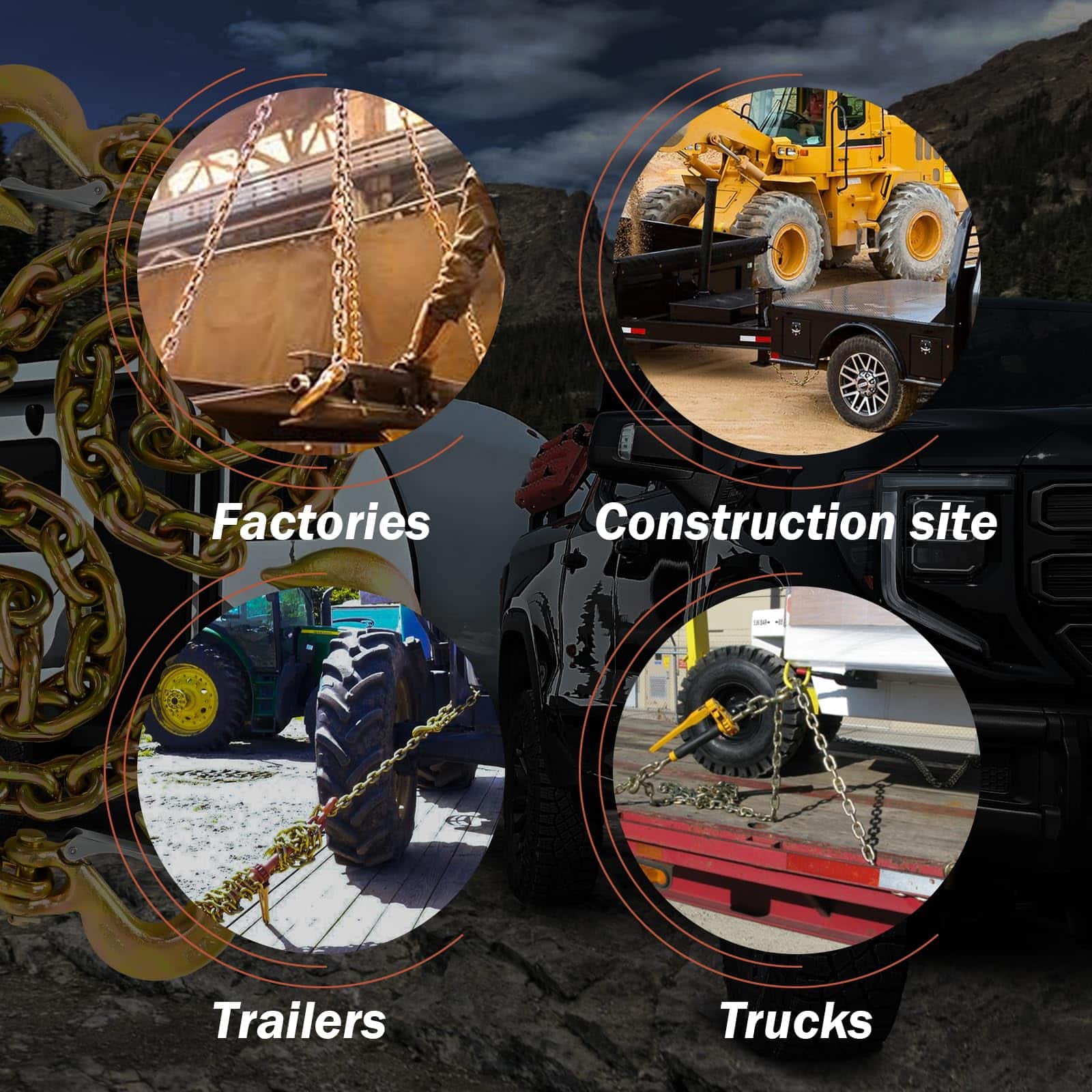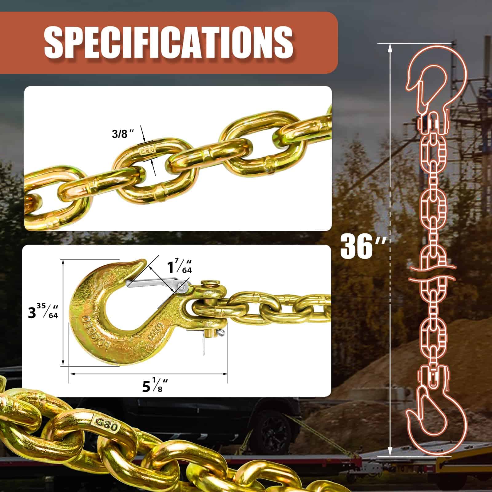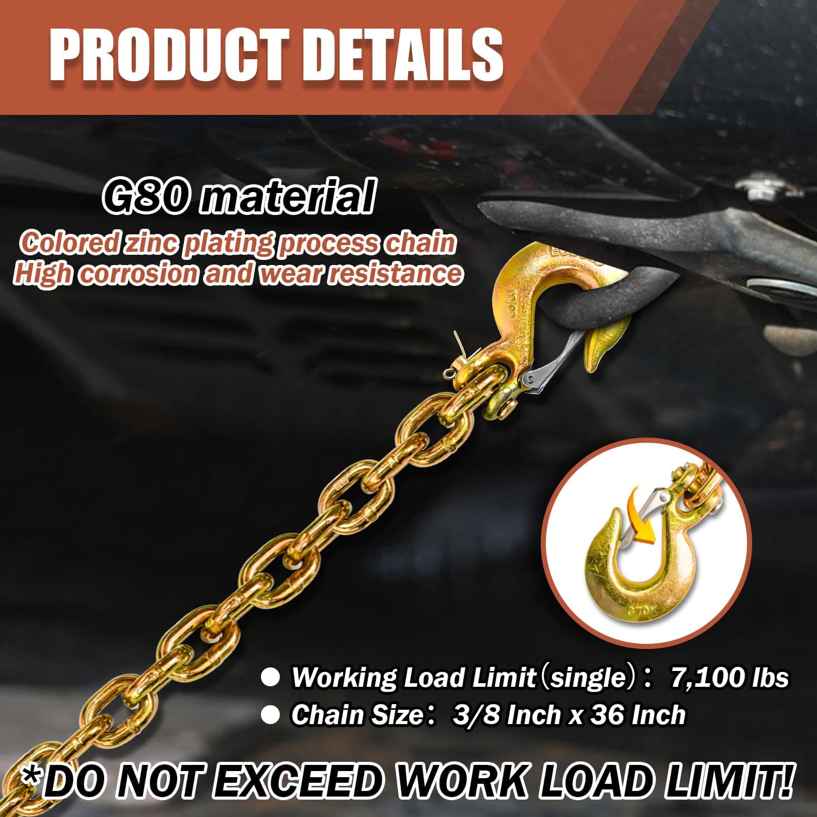 4. WIDE APPLICATION Safety chain provides additional protection for towing heavy vehicles and vessels, preventing the two vehicles from completely separating if the connection is broken. Working Load Limit: 7100 LBS.
