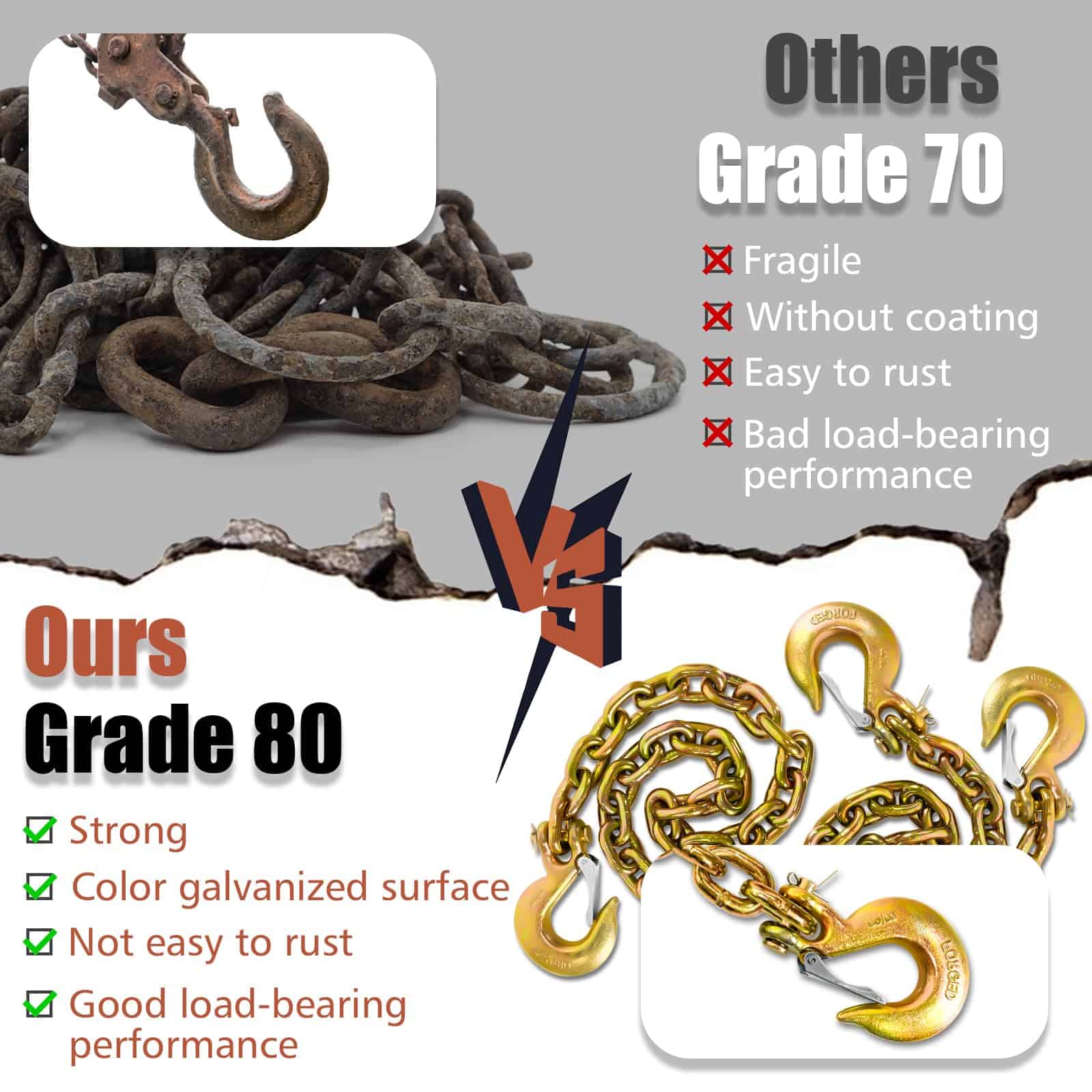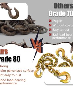 1. HIGH STRENGTH GRADE Trailer chains with hooks is G80 standard and have outstanding tensile strength. It has a higher safe working load than lower grade chains, but the weight is the same.