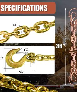 KITUYOTO Trailer Safety Chains with Hooks es un par de cadenas de remolque con ganchos de 35 pulgadas de longitud y una resistencia a la ruptura de 27,000 LBS. Estas cadenas cumplen con el estándar G80 y tienen una resistencia tensil excepcional. Están hechas de acero de aleación tratado térmicamente y recubiertas con una superficie galvanizada, lo que las hace fuertes y resistentes a la corrosión, perfectas para su uso en entornos duros. Los ganchos de seguridad mejorados instalados en ambos extremos de la cadena de remolque garantizan que no se caigan durante el remolque. Se recomienda utilizar dos cadenas de seguridad para una mayor seguridad durante el remolque. Estas cadenas de seguridad proporcionan protección adicional para remolcar vehículos y embarcaciones pesados, evitando que los dos vehículos se separen por completo en caso de que la conexión se rompa.