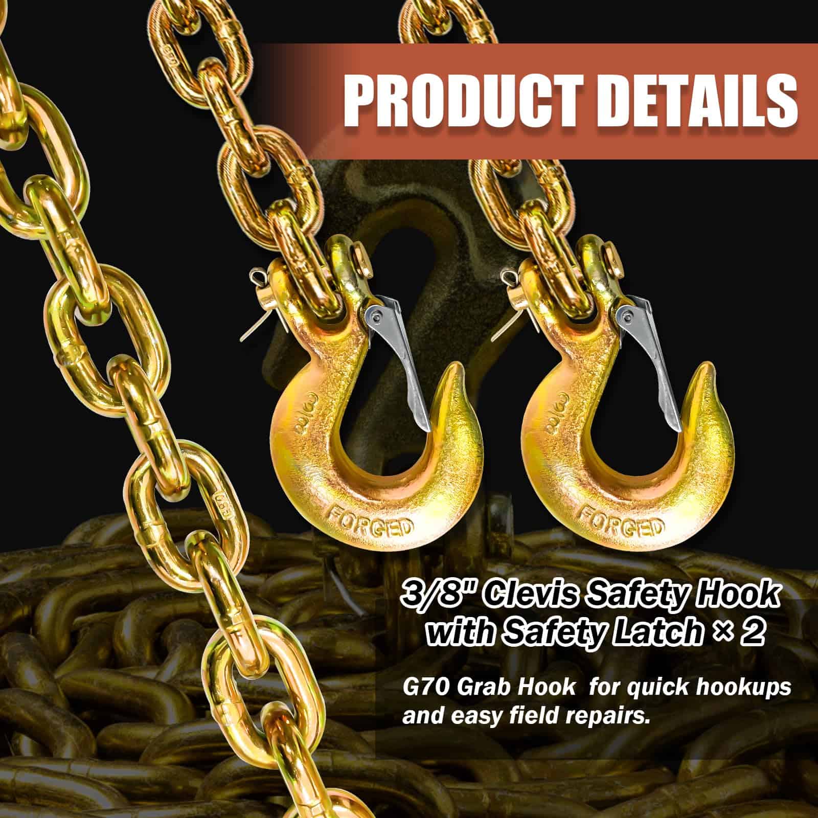 3. UPGRADED HOOK Safety hooks are installed at both ends of the towing chain, which is not easy to fall off during towing. For towing safety, it is recommended to use two safety chains.