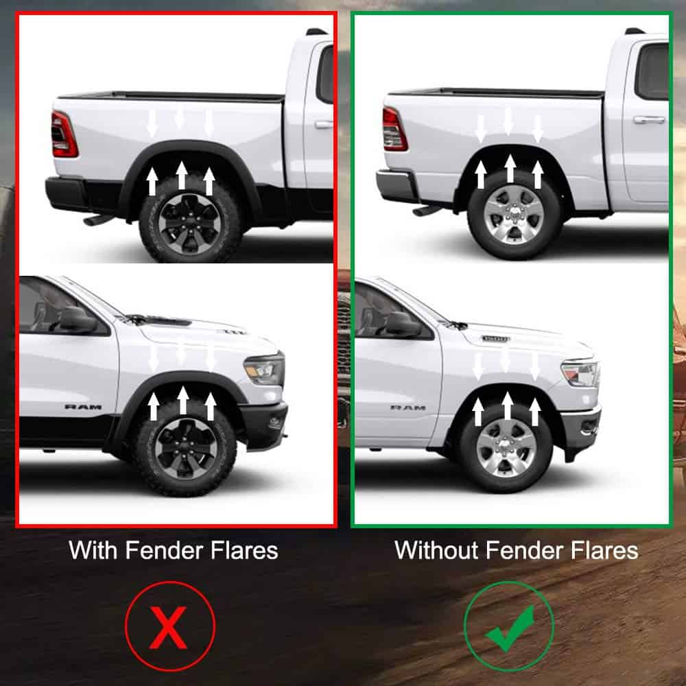 3. MANTENIENDO EL BARRO FUERA DE SU NUEVA RAM – Los guardabarros protegen el vehículo, los pasajeros, otros vehículos y peatones del barro y otros escombros arrojados al aire por la rotación de la llanta.