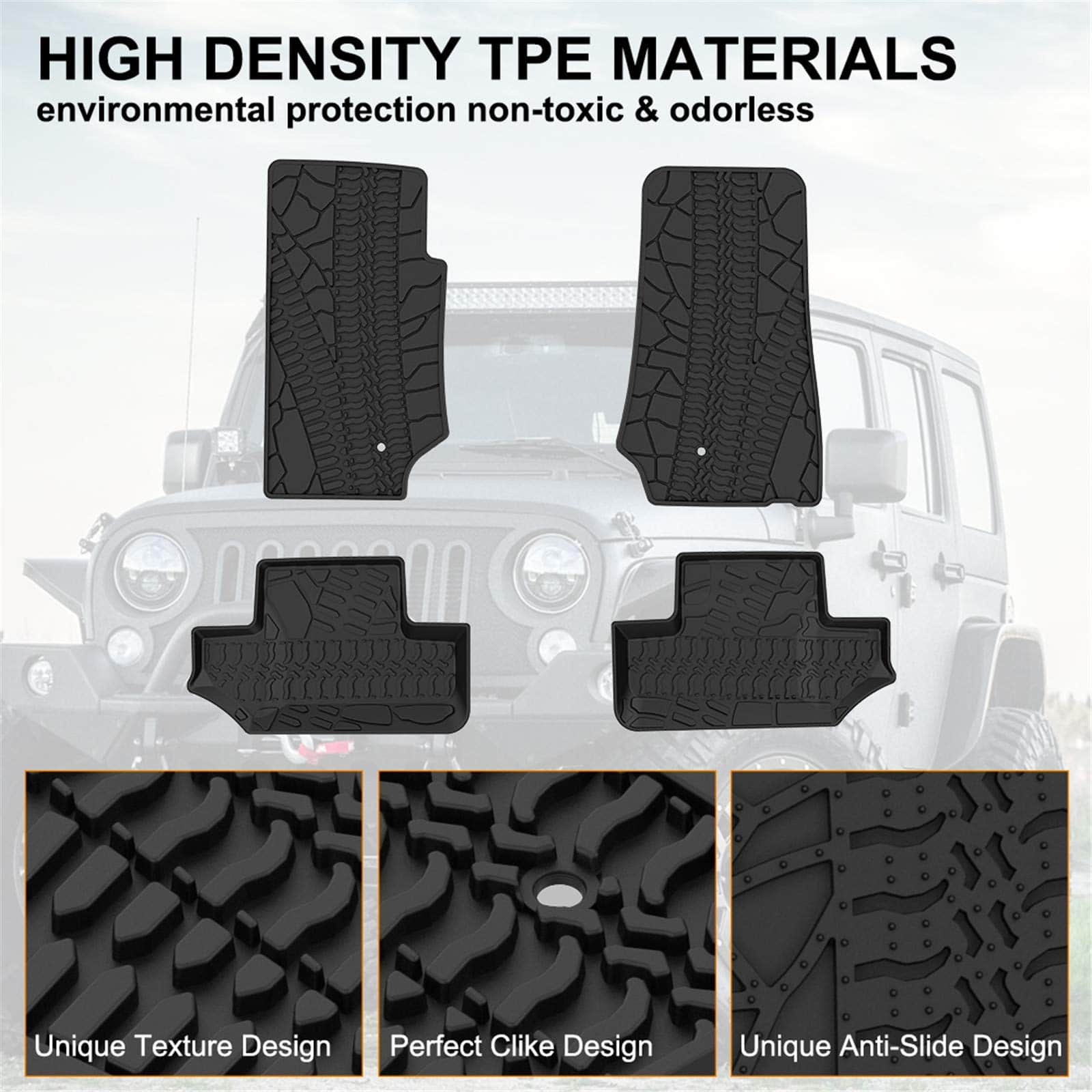 Los tapetes para Jeep Wrangler JK de KIWI MASTER protegen los pisos del conductor y el pasajero del vehículo. Hechos de material TPE, estos tapetes resistirán los elementos adversos, evitando manchas y humedad en las alfombras originales de fábrica. Puede limpiar fácilmente los tapetes con jabón y agua caliente o fría y un cepillo suave, sin necesidad de frotar intensamente ni usar limpiadores especiales. El material especial de respaldo antideslizante evitará cualquier deslizamiento o movimiento al contacto. Mantenga su enfoque en la conducción y no en ajustar los tapetes de su automóvil. Mantenga el piso de su automóvil en condiciones impecables, fácilmente, con la marca de confianza en accesorios automotrices. br br br Especificación: r br Color: Negro br Material: TPE br Peso de Envío: 9.7 LIBRAS br Dimensiones del Empaque: 26.0 X 19.9 X 3.5 pulgadas br br br Compatibilidad: r br 2007-2013 Jeep Wrangler JK de 2 Puertas br br br Paquete Incluido: r br 1 Set de Tapetes para Jeep Wrangler JK de 2 Puertas del 2007 al 2013