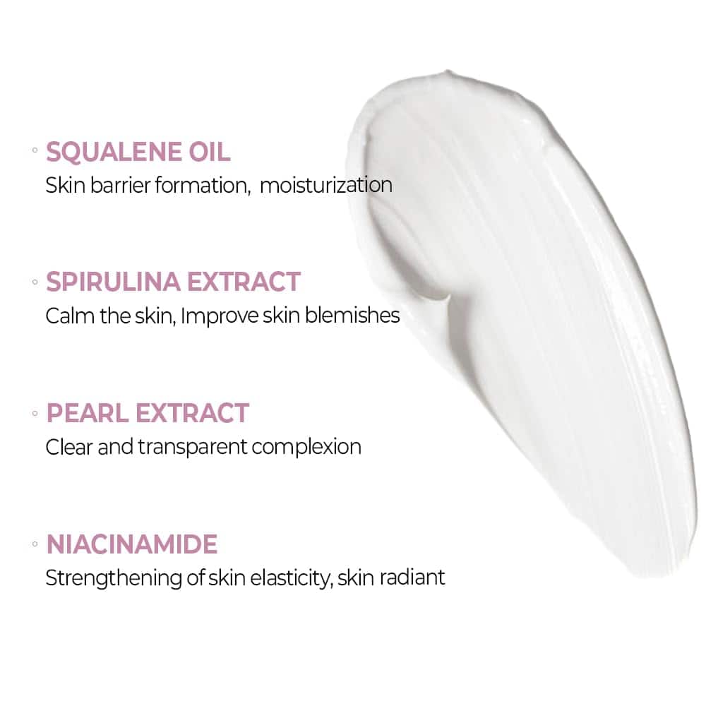 KLAVUU PEARLSATION Enriched Divine Pearl Cream es una crema facial enriquecida que contiene perlas reales, niacinamida y otros ingredientes de calidad para ayudar a revitalizar la piel. Con su fórmula única, esta crema hidratante facial brinda beneficios duales de iluminar y anti-envejecimiento para una apariencia más joven y radiante. La niacinamida trabaja en conjunto con las perlas para iluminar la piel, igualar el tono y mejorar la luminosidad, mientras que los extractos de espirulina y el aceite de escualeno ofrecen propiedades calmantes, protección e hidratación profunda. Ideal para todos los tipos de piel, esta crema revitalizante y anti-aging es un must-have en tu rutina diaria de cuidado de la piel coreana.