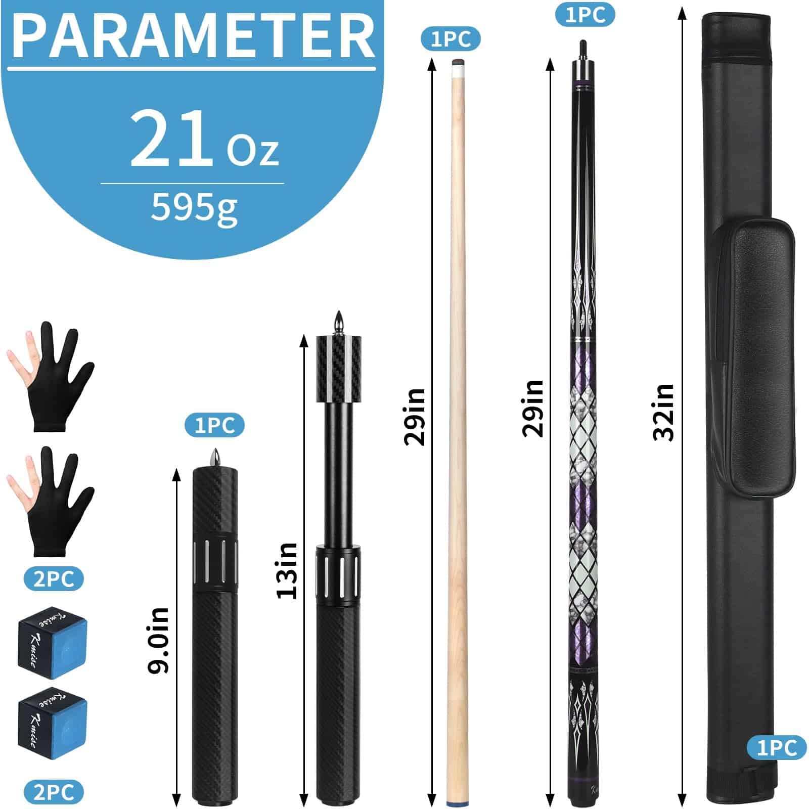 1. Taco de billar profesional Kmise de 58 pulgadas de 2 piezas desmontable, peso 20OZ, hecho de arce canadiense de alta calidad, juntas de acero inoxidable, duradero y no se deforma fácilmente, punta multicapa de 14 mm para garantizar disparos precisos, mejor transferencia de energía, es su elección ideal de taco de billar. 2. Eje perfecto El eje del taco de billar tiene baja deflexión, y el arce real es el doble de largo que el eje de taco de madera ordinario, brindándole un excelente control y precisión en cada disparo. 3. Varilla de extensión de alta calidad Viene con una varilla de extensión de taco de billar de carbono de 10 pulgadas con longitud telescópica y ajustable. La varilla de extensión de carbono agrega flexibilidad adicional a su juego, lo que le permite completar fácilmente disparos difíciles. 4. Taco de Billar Magnífico Patrón único y exquisito, y acabado multicapa de alto brillo que ayuda a proteger la madera de la humedad y curvaturas, facilitando a los jugadores mantener el taco. 5. Accesorios del set Juego de tacos de billar Kmise, que incluye taco de billar x1, extensión de taco x1, caja de taco x1, guantes x2, tizas de billar x3 y protectores de juntas. Fácil de transportar, es un excelente equipo de billar tanto para principiantes como para profesionales.