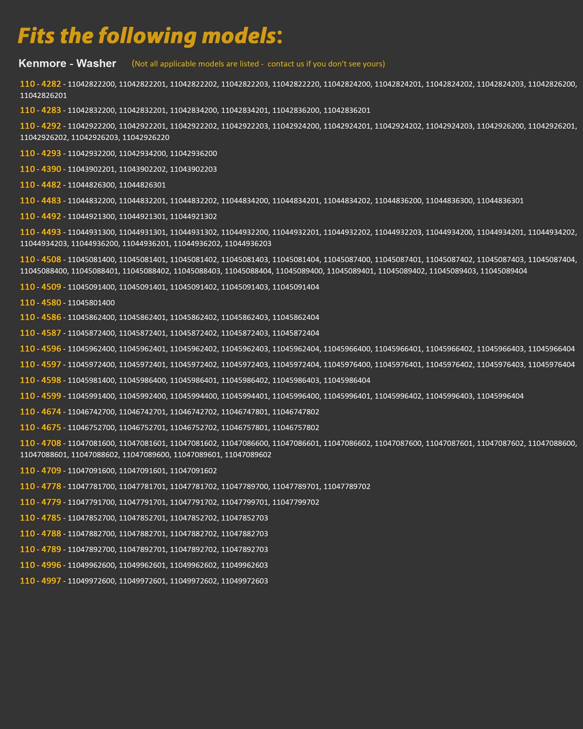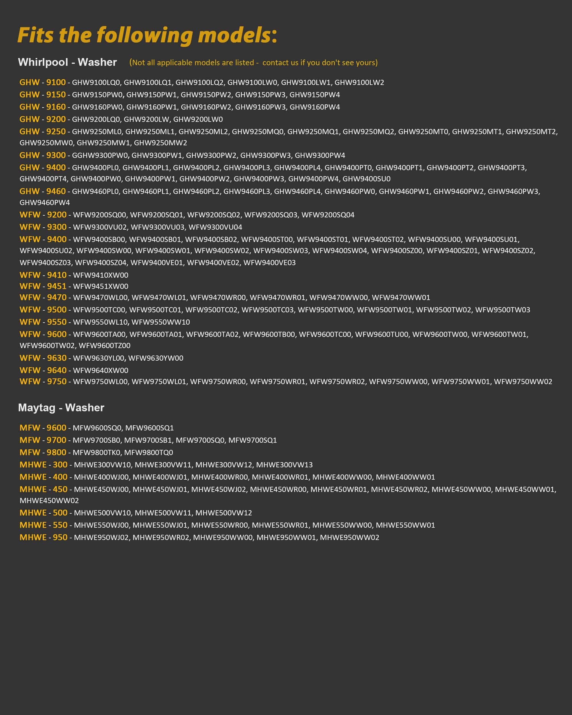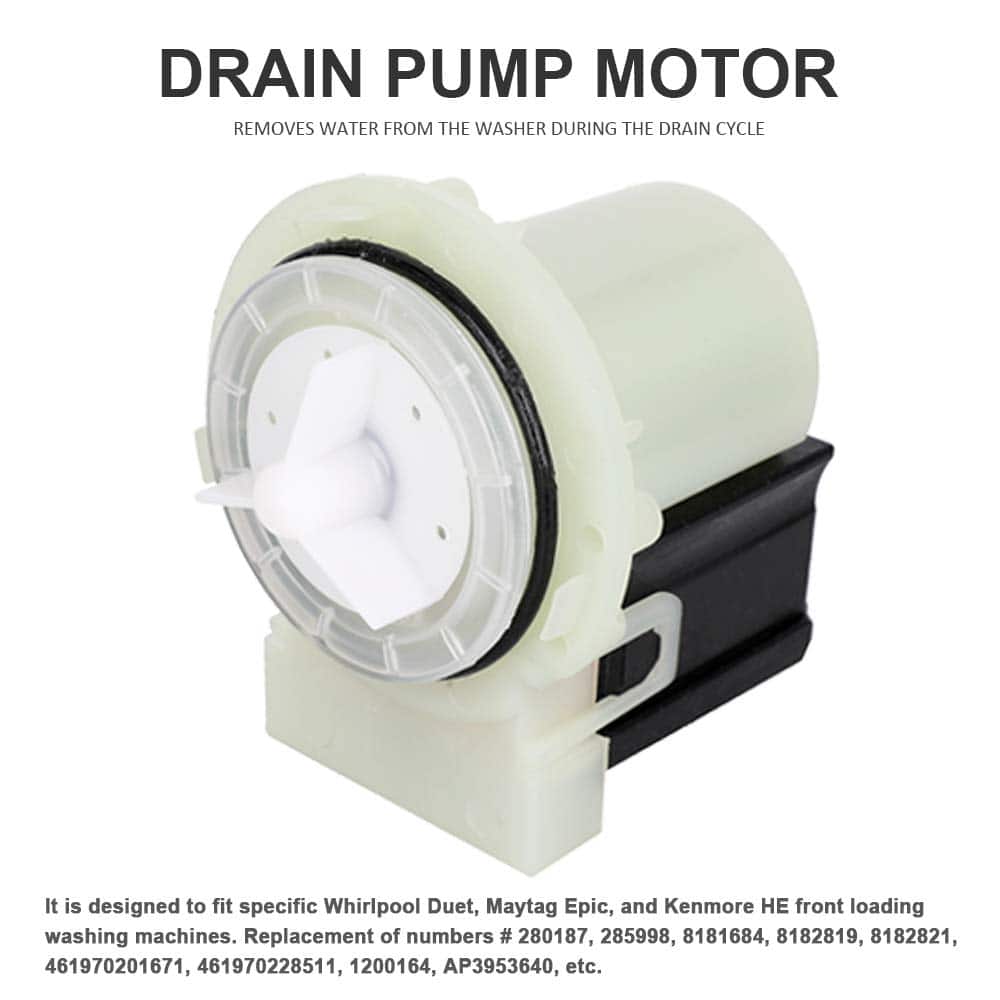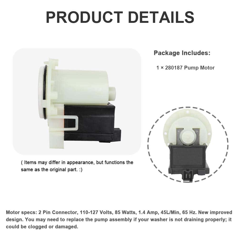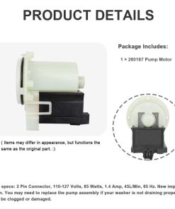 Especificación 280187 Motor de Bomba de Drenaje Reemplazo Conector de 2 Pines 110-127 Voltios 85 Watts 1.4 Amp 45L/Min 65 Hz Síntomas de Reparación No drenará Bombas pero no girará Ruidoso Goteando Nota: Esto es solo una guía, ya que otros elementos pueden causar los mismos síntomas. Reemplaza Número de Parte 280187, 285998, 8181684, 8182819, 8182821, 46197020148, 461970201671, 461970228511, 461970228512, 461970228513, 1200164, AP3953640, PS1485610, EAP1485610, PD00002352, etc. Marcas Compatibles Kenmore, Whirlpool, Maytag, KitchenAid, Amana Reemplazo exacto para lavadoras de carga frontal específicas de Whirlpool Duet, Maytag Epic y Kenmore HE. Funciona con los siguientes modelos No se enumeran todos los modelos aplicables – Por favor contáctenos si no ve el suyo.