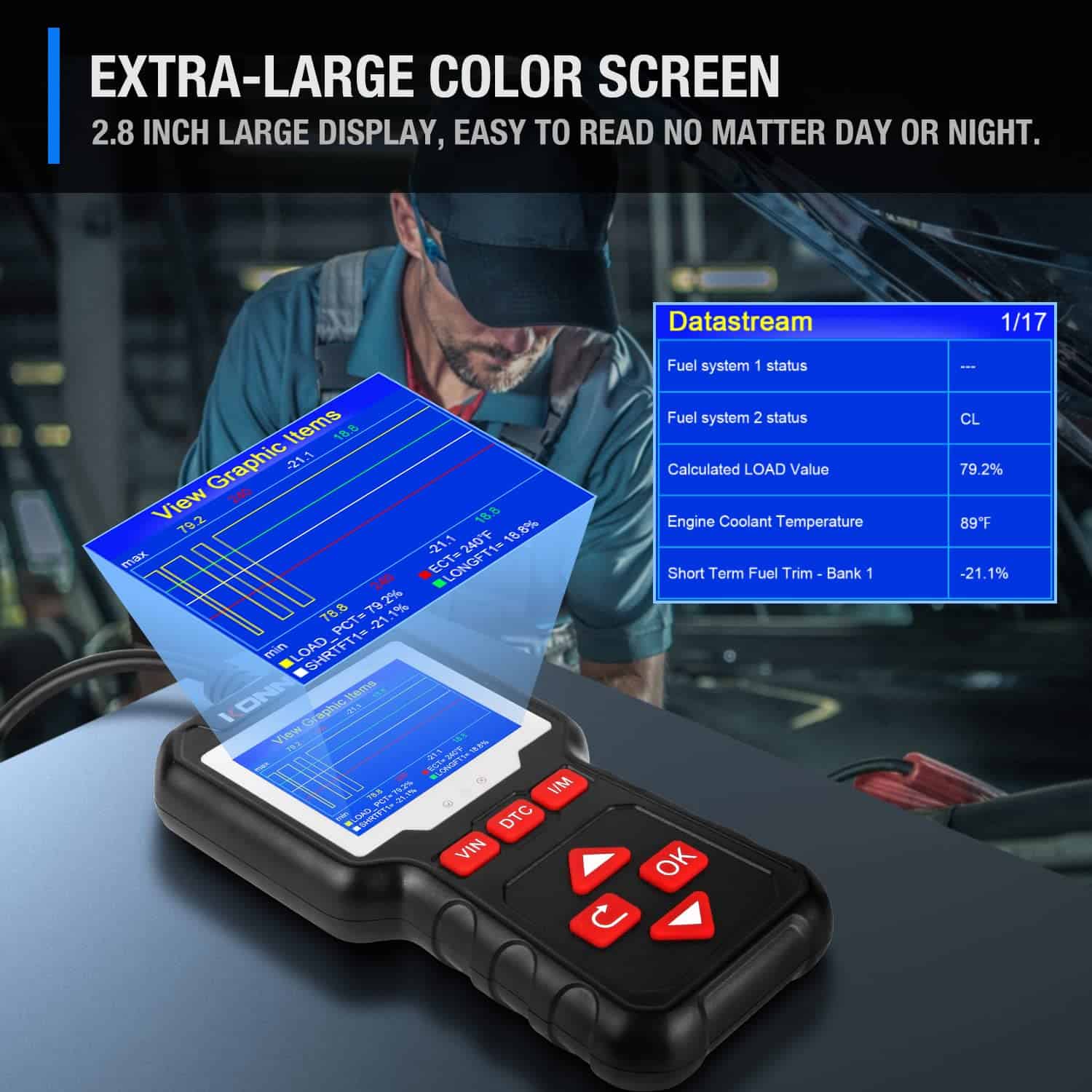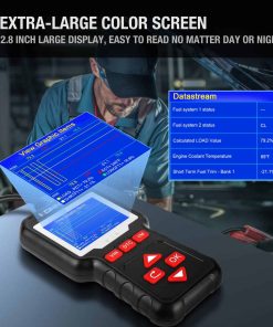 2. PANTALLA A COLOR Pantalla grande a color de 2.8 pulgadas que le permite leer fácilmente tanto de día como de noche, enchufar y listo sin necesidad de suministro de energía adicional alimentado por el puerto OBDII del automóvil.