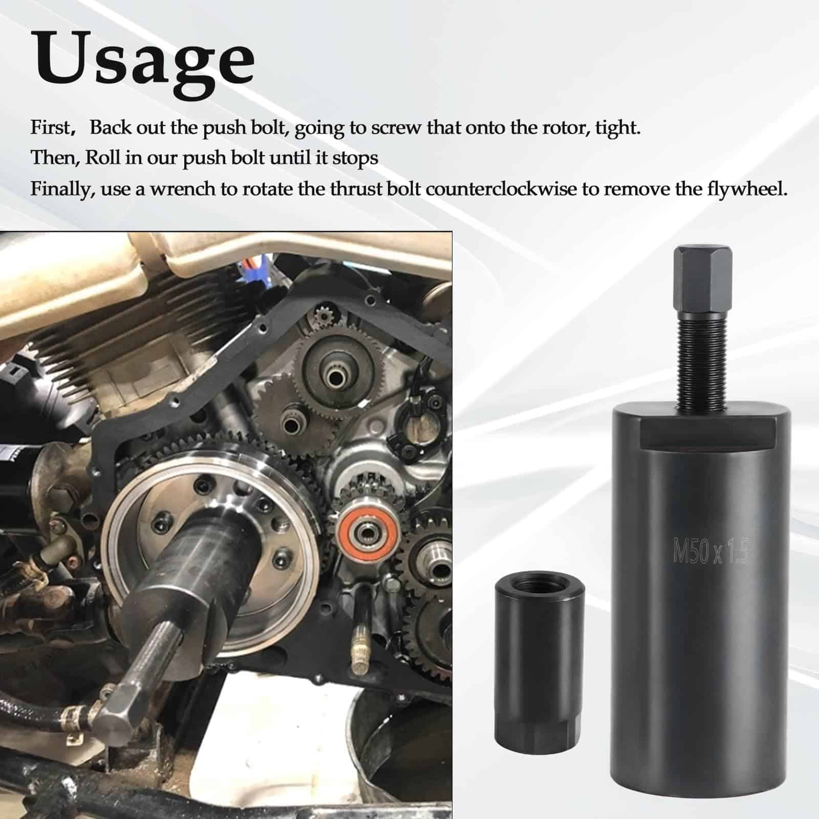 5. Uso: La instalación del removedor de magneto de rotor de volante hembra M50 X 1.5 R.H. es simple. Primero afloje el tornillo de empuje, luego enrósquelo en el rotor y ajústelo. Luego, enrolle nuestro tornillo de empuje hasta que se detenga. Use una llave hexagonal para girar el tornillo de empuje en sentido antihorario para quitar el volante.
