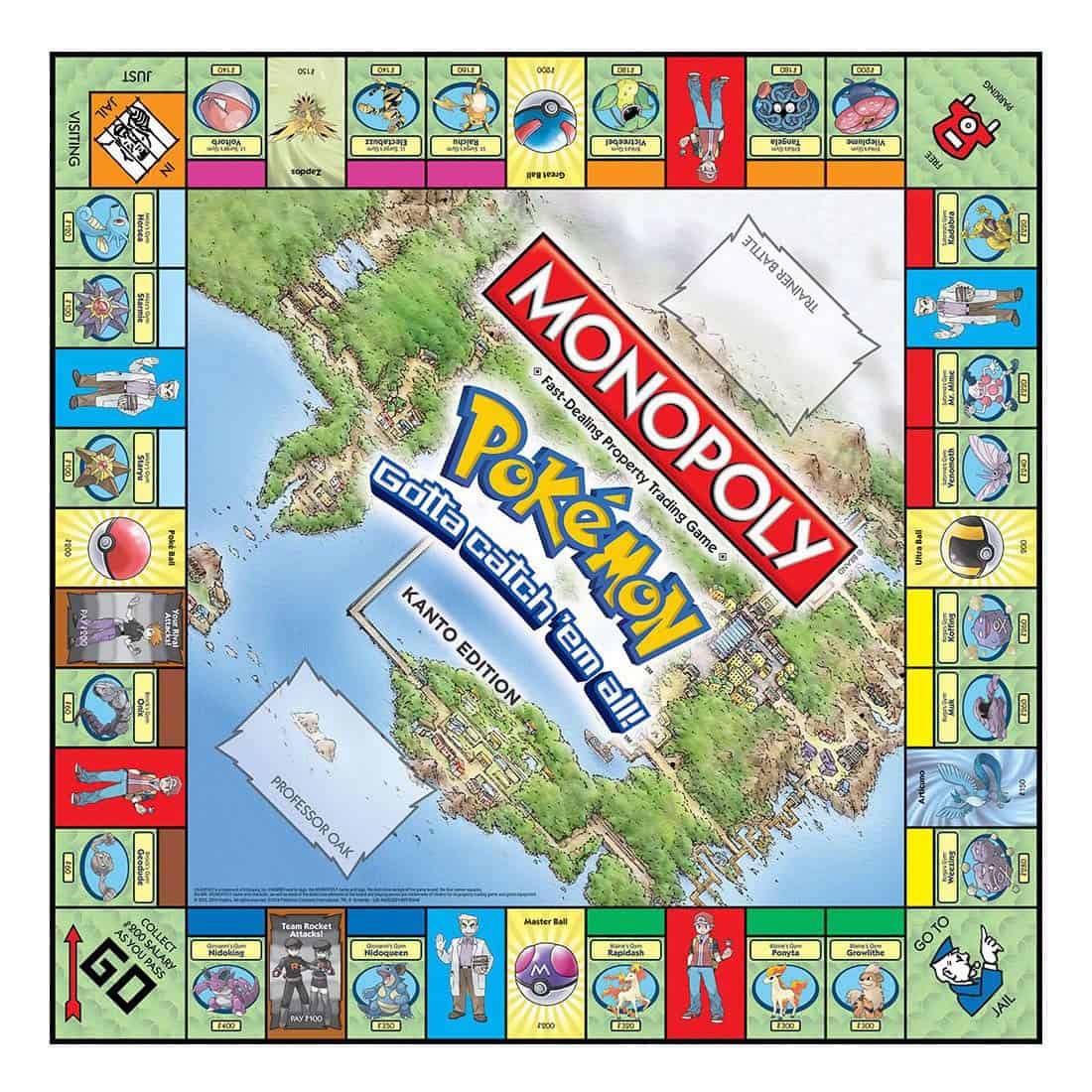 ¡Asocíate con Pikachu y amigos en Pokemon Monopoly! ¡Viaja a través de los ocho gimnasios y lucha contra todo tipo de Pokémon en la Edición Kanto de Monopoly Pokémon!