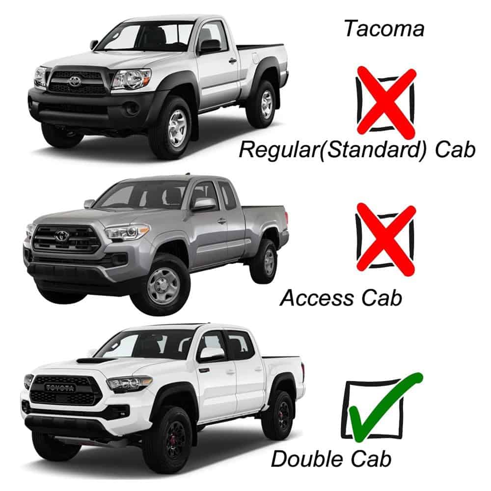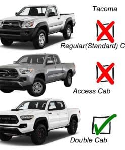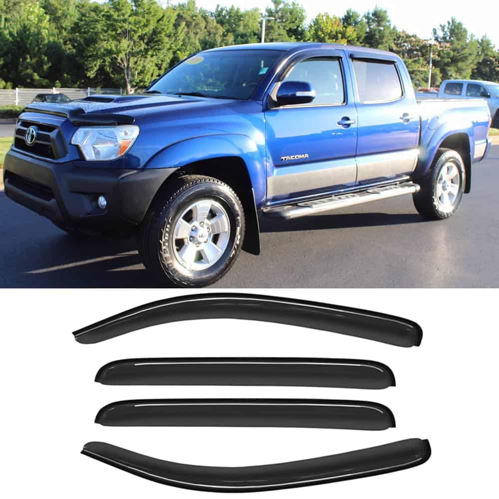 1. APTO PARA: Deflectores de ventana para 2005-2015 Toyota Tacoma Doble Cabina solamente; Nota: La doble cabina tiene 4 puertas de tamaño completo. 2. PRODUCTO OFRECIDO: 4 piezas de deflectores de ventana (se incluye instrucciones de instalación), Asegúrese de que su camioneta sea el modelo correcto que se ajuste a este artículo. 3. DURABLE Y AGRADABLE: Nuestro Deflector de Ventana está hecho con acrílico reforzado de calidad premium resistente y irrompible, no se doblará, romperá ni agrietará. El diseño flexible coloreado en negro humo está elegido con los mejores estándares para protección solar, además de agregar a la apariencia de tu precioso vehículo. 4. HAGA QUE LOS VIAJES SEAN AGRADABLES Y SEGUROS: Puedes conducir con comodidad con nuestros guardabarros contra la lluvia, sin preocuparte por el ruido del viento, la nieve fría, molestas salpicaduras de lluvia, o el sol abrasador. Ayuda a mejorar la ventilación para reducir el empañamiento de las ventanas para mantener una visión clara y hacer que los paseos sean seguros. 5. INSTALACIÓN FÁCIL: Diseño Directo Tape-On, instalación fácil de Peel-N-Stick y sin molestias al subir y bajar las ventanas. Fácil de quitar sin afectar la apariencia de tu automóvil (Sin Cortes ni Perforaciones)