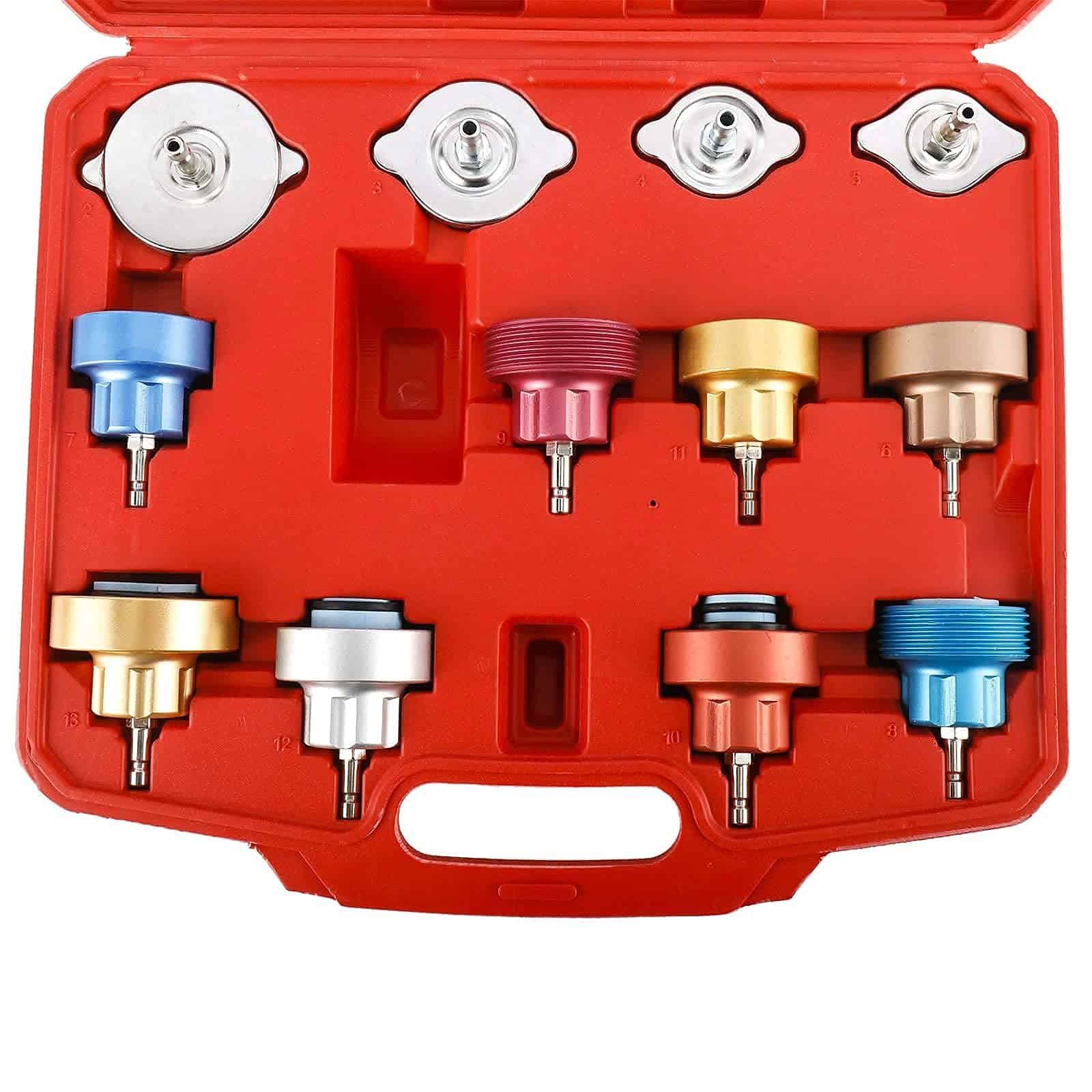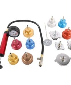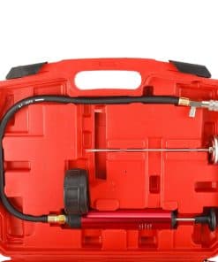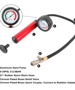 Para probar sistemas de enfriamiento automotriz presurizados de hasta 35 PSI. La alta capacidad de la bomba reduce los golpes requeridos para presurizar los sistemas de enfriamiento. Adaptadores de desconexión rápida con auto-bloqueo. Manómetro de 35 PSI con válvula de liberación de la presión