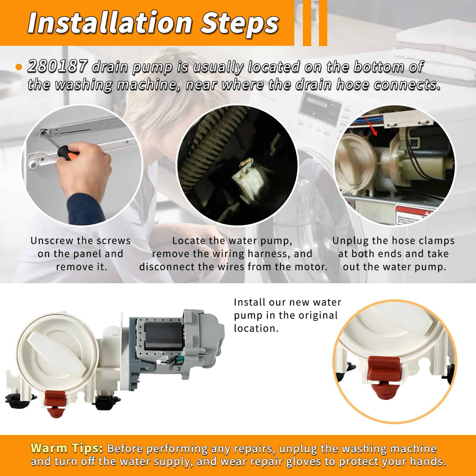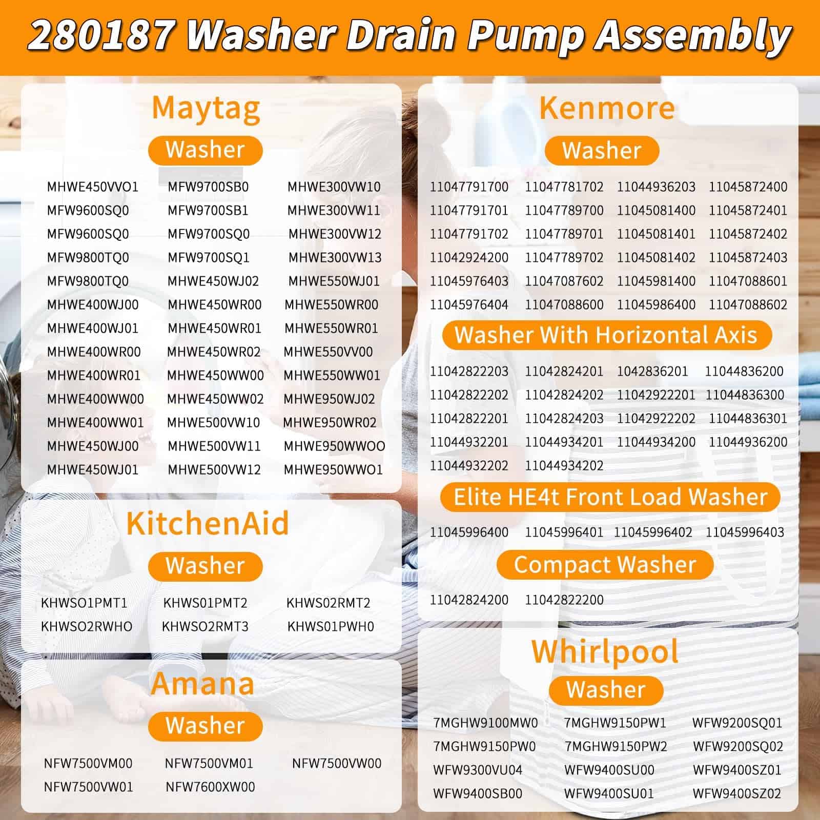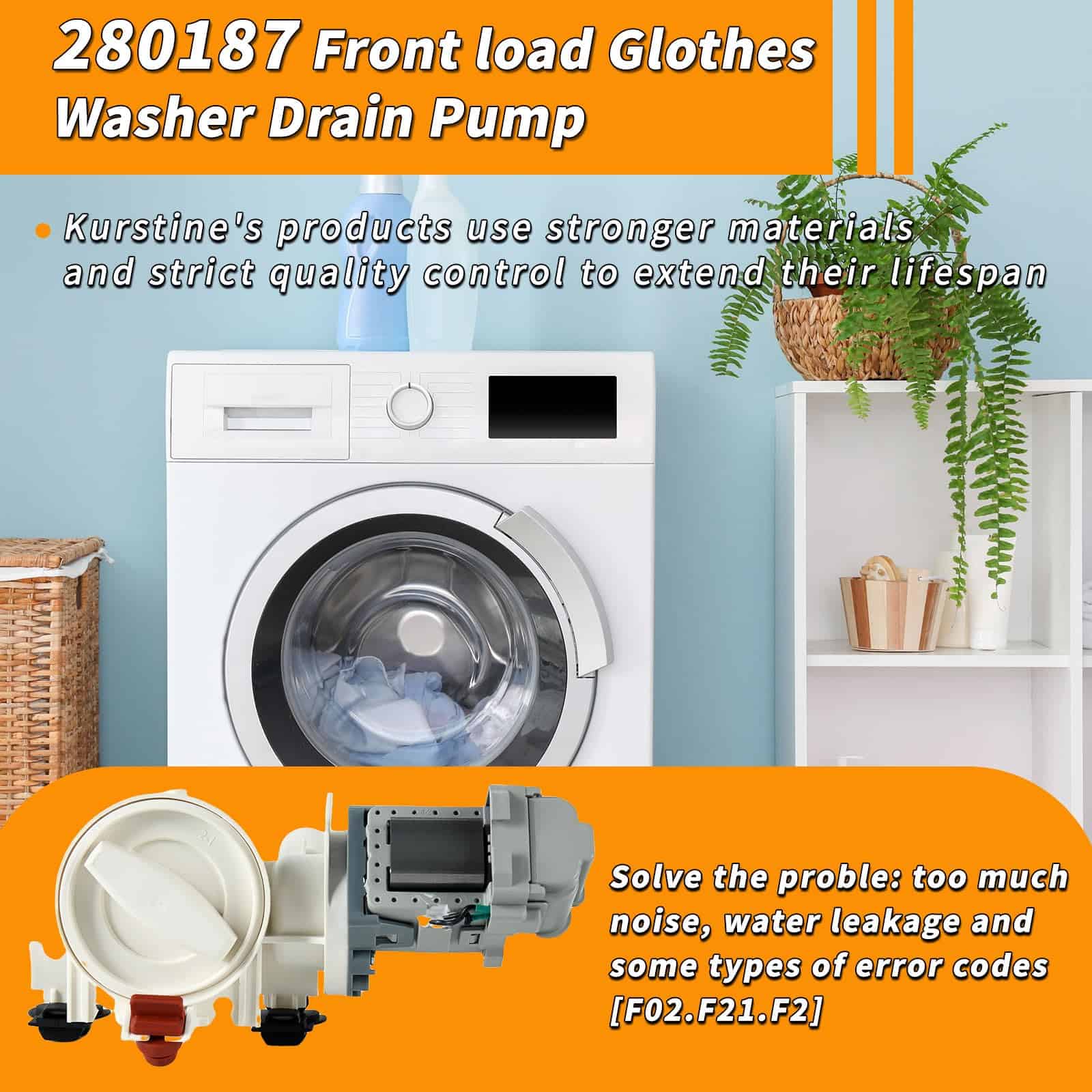 Kurstince Upgrade 280187 Filtro de Bomba de Desagüe para Lavadora de Carga Frontal es una opción confiable para resolver problemas de ruido, fugas de agua y códigos de error en lavadoras frontales. Este producto totalmente ensamblado incluye motor, filtro y carcasa de plástico de entrada/salida. El diseño de la bomba de desagüe 280187 está completamente cerrado en plástico gris para proteger los alambres de bobinado, lo que lo hace más seguro. Compatible con lavadoras de Whirlpool, Kenmore, Kitchen-Aid y Maytag, esta bomba de desagüe AP3953640 está diseñada para adaptarse a una amplia gama de modelos. Garantía: Kurstince se enorgullece de ofrecer productos de alta calidad que han sido sometidos a rigurosas pruebas de calidad. Con una garantía de 1 año y un servicio de atención al cliente excepcional, puede confiar en la calidad y confiabilidad de esta bomba de desagüe para lavadora de carga frontal.
