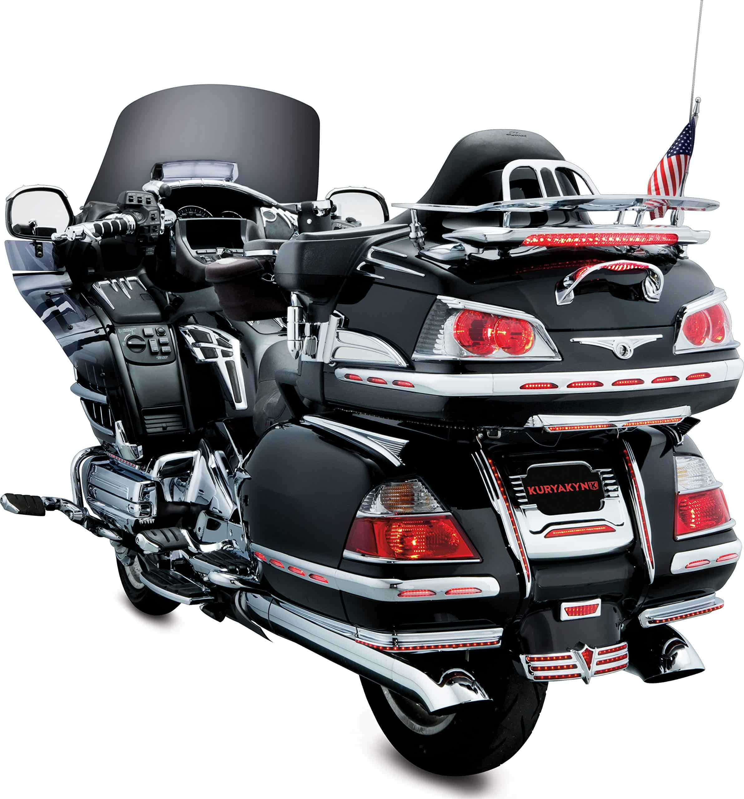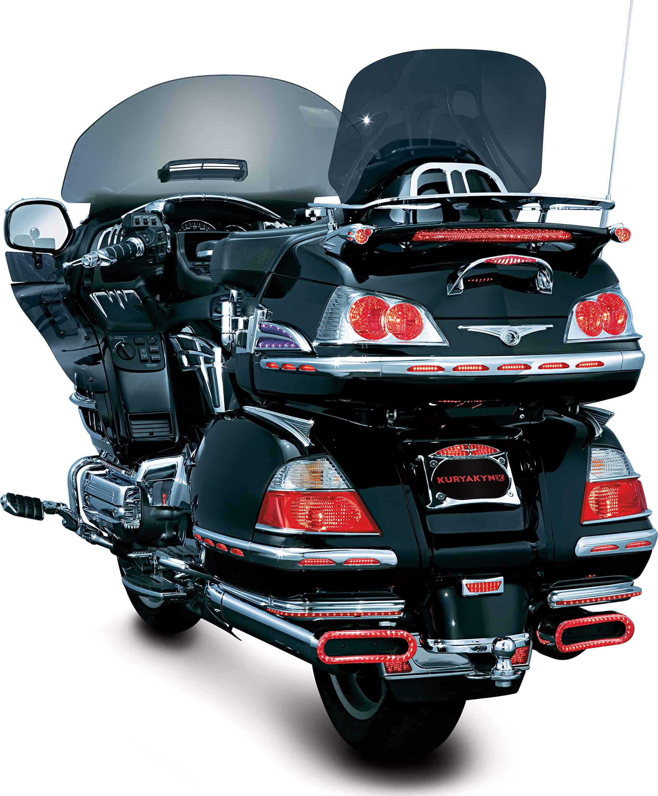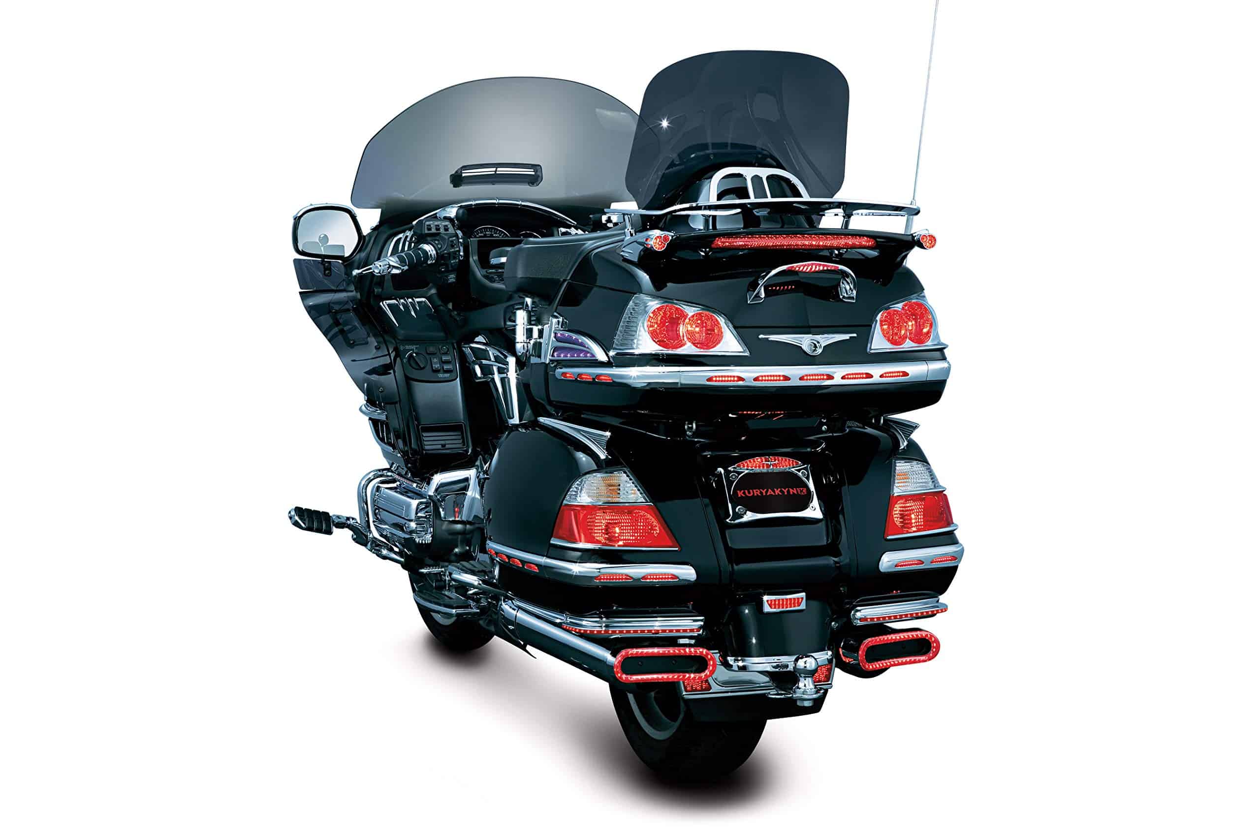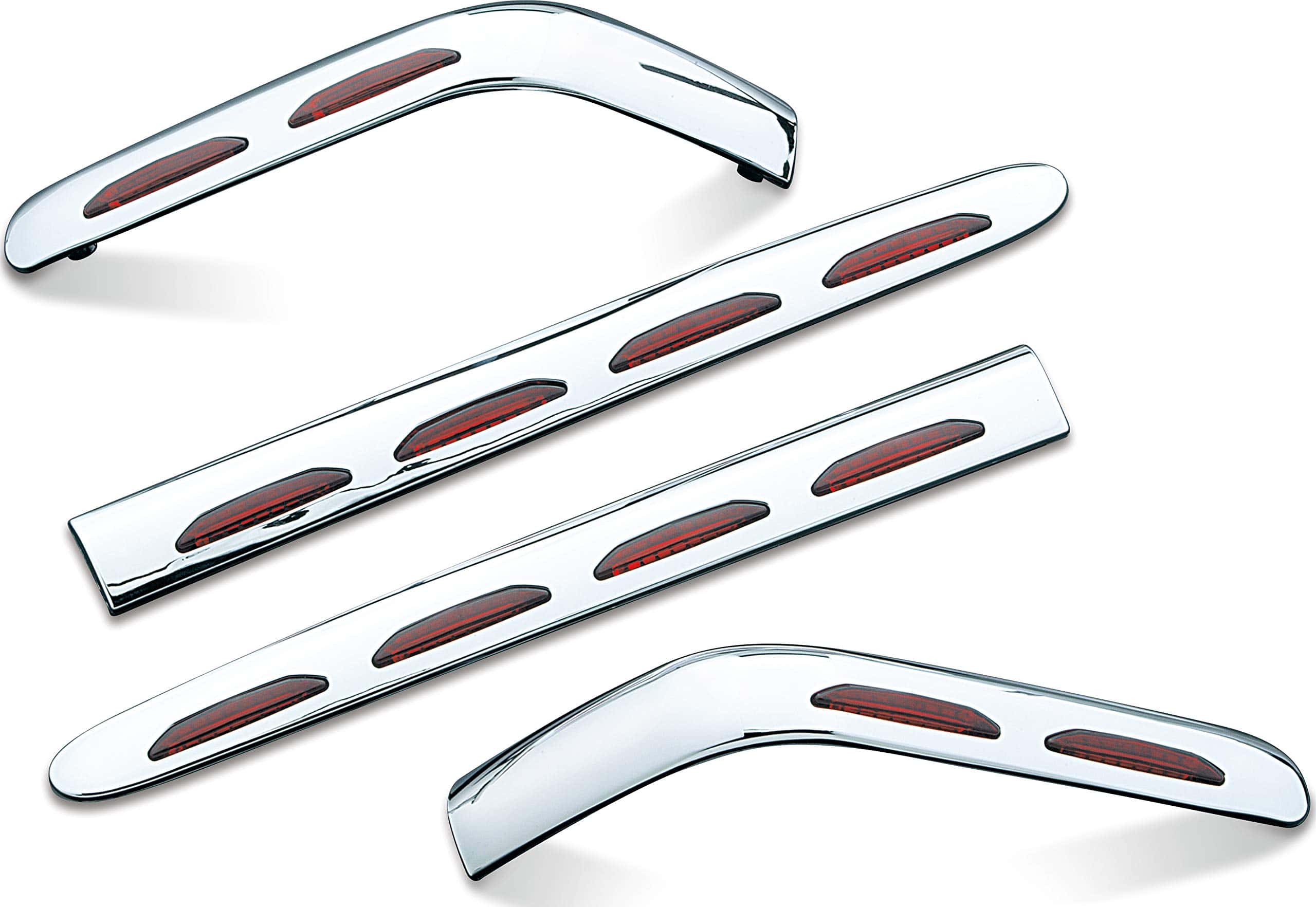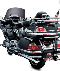 Las Molduras de Saddlebag Iluminadas Kuryakyn 3202 con Lente Roja están hechas con iluminación LED de última generación y consumen mínimo poder. Reemplazan las partes existentes en la motocicleta y conservan todos los puntos de montaje originales. Las Molduras de Saddlebag Iluminadas proporcionan luces de marcha LED de circuito único. Incluye (1) Luz de Moldura de Saddlebag Cromada – Lado Derecho, (1) Luz de Moldura de Saddlebag Cromada – Lado Izquierdo, (1) Luz de Moldura de Esquina Cromada – Izquierda, (1) Luz de Moldura de Esquina Cromada – Derecha, (1) Kit de Instalación; Recomendado para la instalación (No Incluido): destornillador de estrella, llave de vaso de 8 mm, suministros de pelado y empalme de cables. Las Molduras de Saddlebag Iluminadas Kuryakyn 3202 con Lente Roja son compatibles con los modelos Gold Wing: ’01-’10 GL1800.