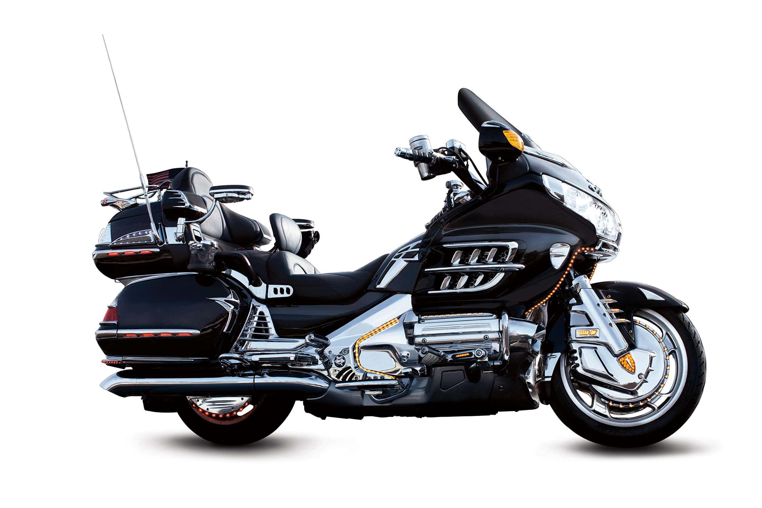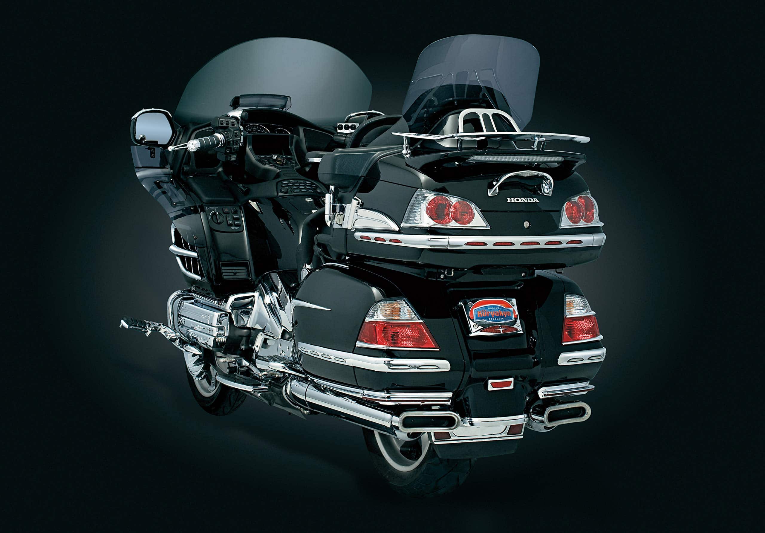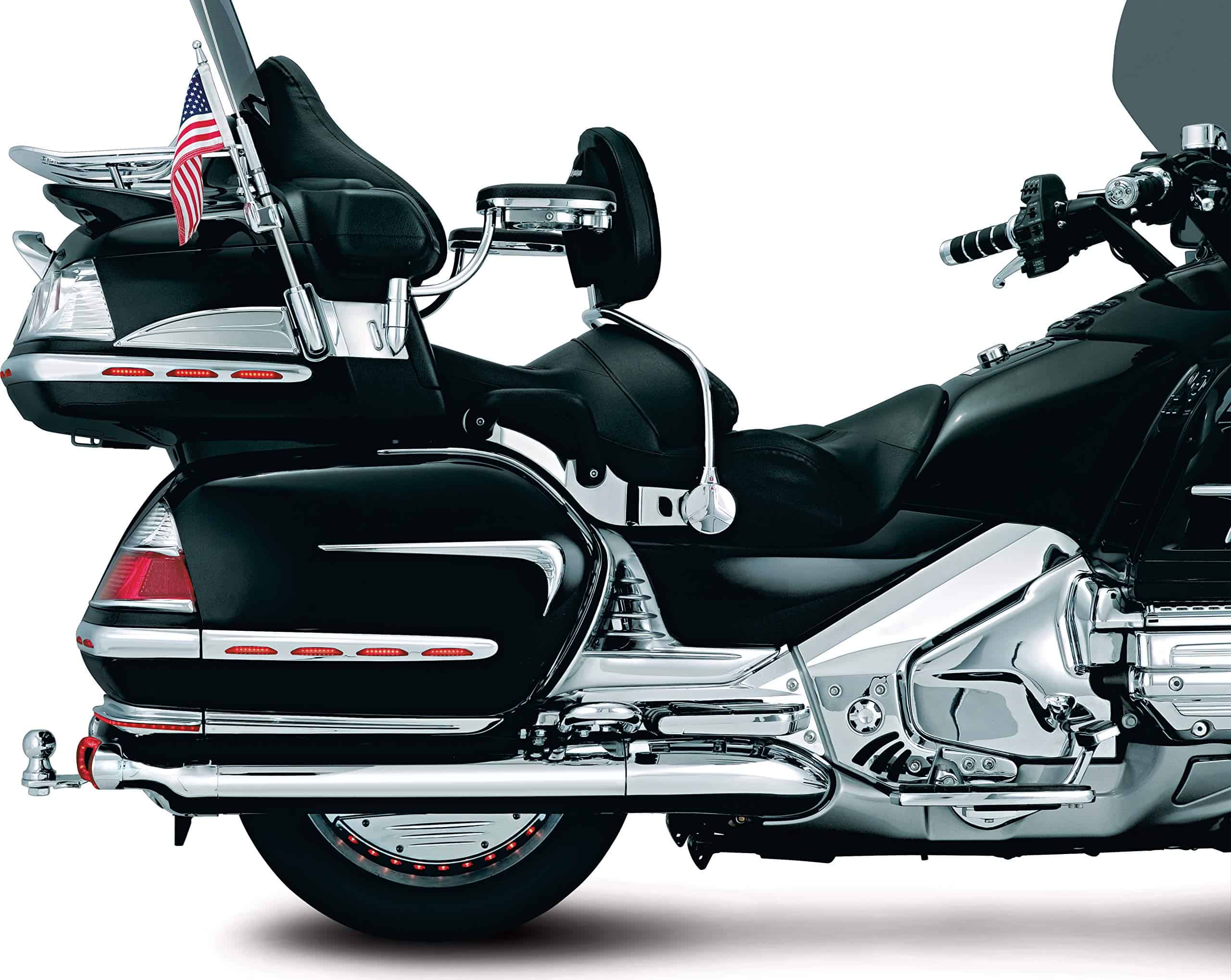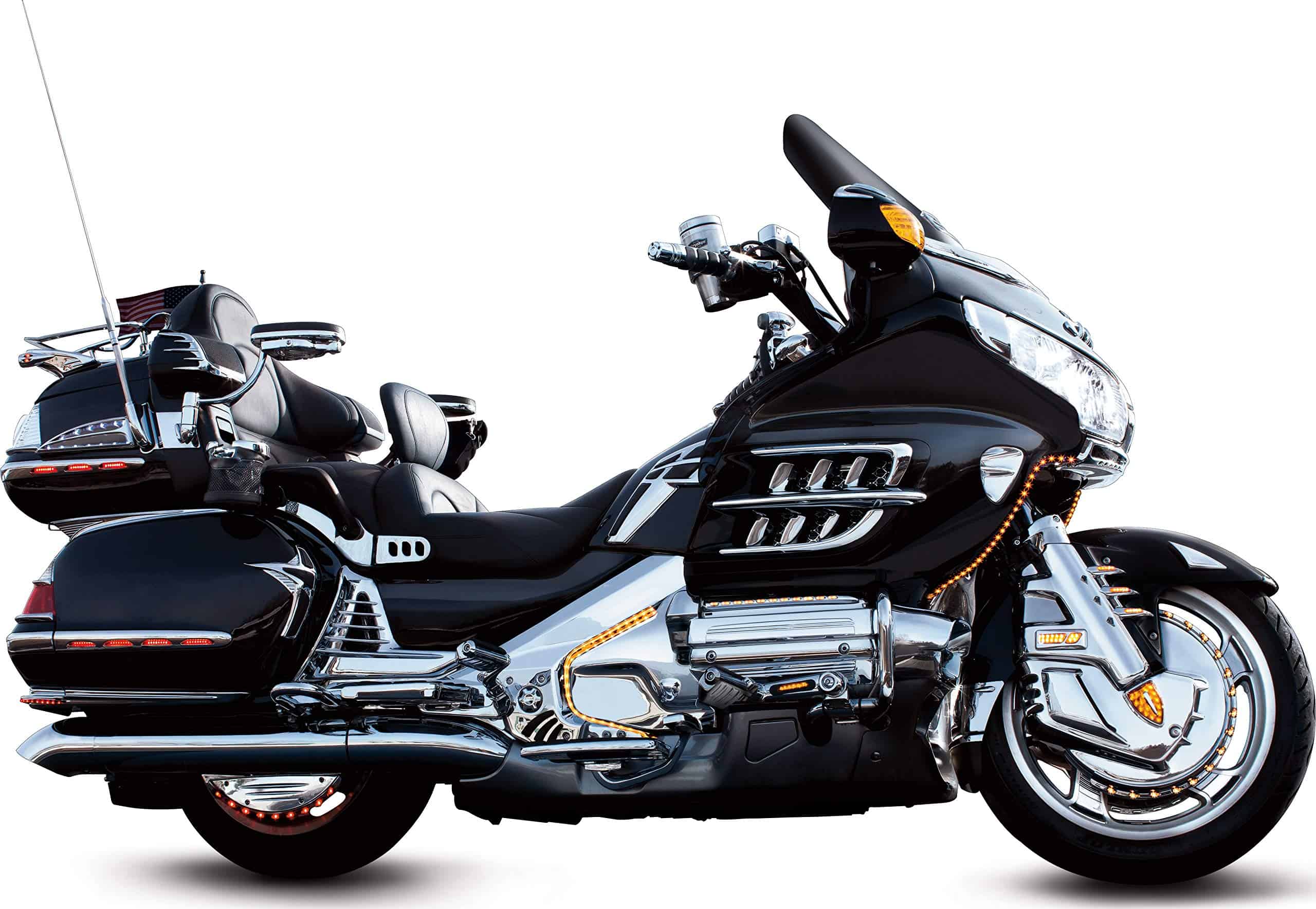 Las Molduras de Saddlebag Iluminadas Kuryakyn 3202 con Lente Roja están hechas con iluminación LED de última generación y consumen mínimo poder. Reemplazan las partes existentes en la motocicleta y conservan todos los puntos de montaje originales. Las Molduras de Saddlebag Iluminadas proporcionan luces de marcha LED de circuito único. Incluye (1) Luz de Moldura de Saddlebag Cromada – Lado Derecho, (1) Luz de Moldura de Saddlebag Cromada – Lado Izquierdo, (1) Luz de Moldura de Esquina Cromada – Izquierda, (1) Luz de Moldura de Esquina Cromada – Derecha, (1) Kit de Instalación; Recomendado para la instalación (No Incluido): destornillador de estrella, llave de vaso de 8 mm, suministros de pelado y empalme de cables. Las Molduras de Saddlebag Iluminadas Kuryakyn 3202 con Lente Roja son compatibles con los modelos Gold Wing: ’01-’10 GL1800.