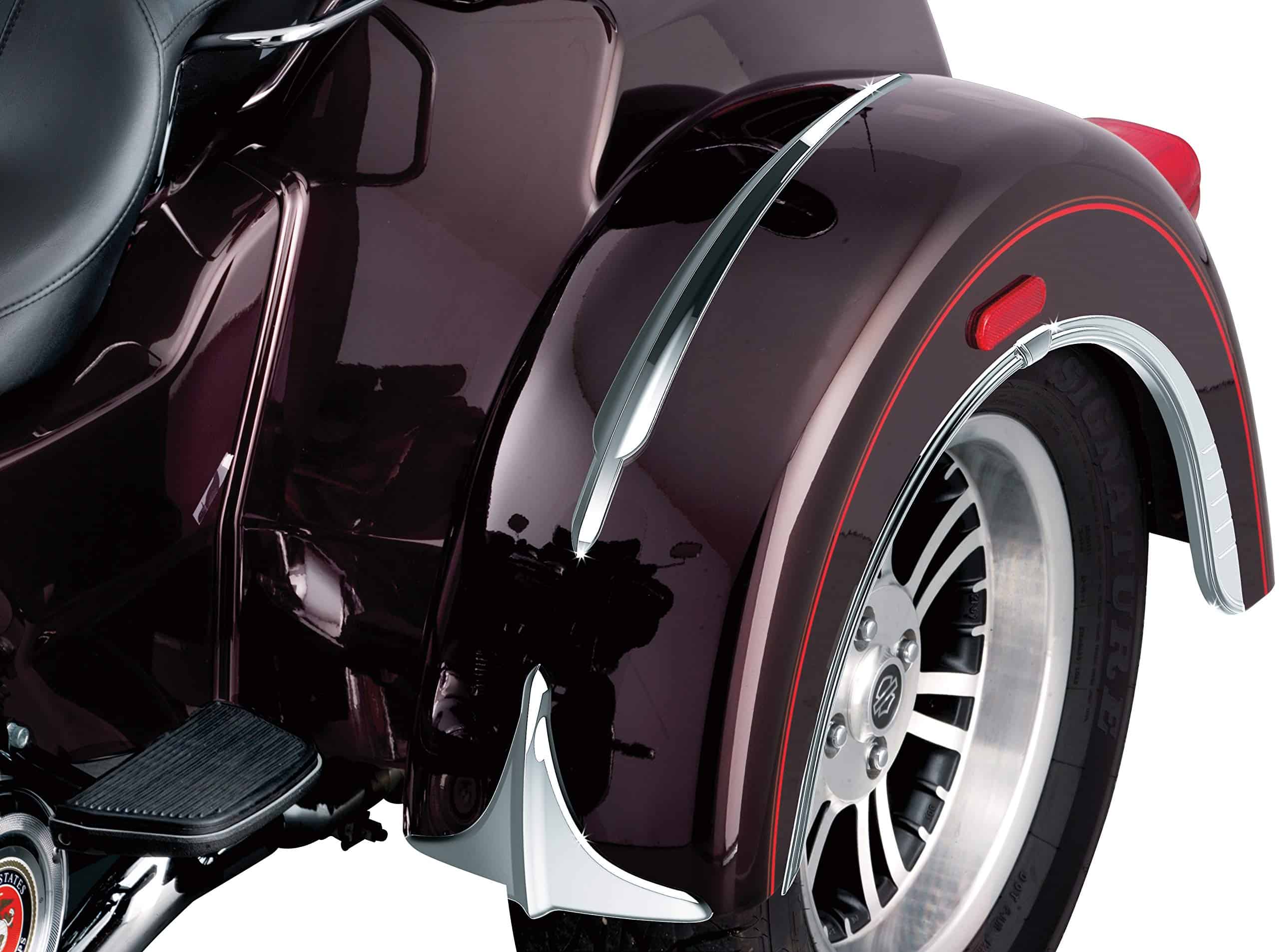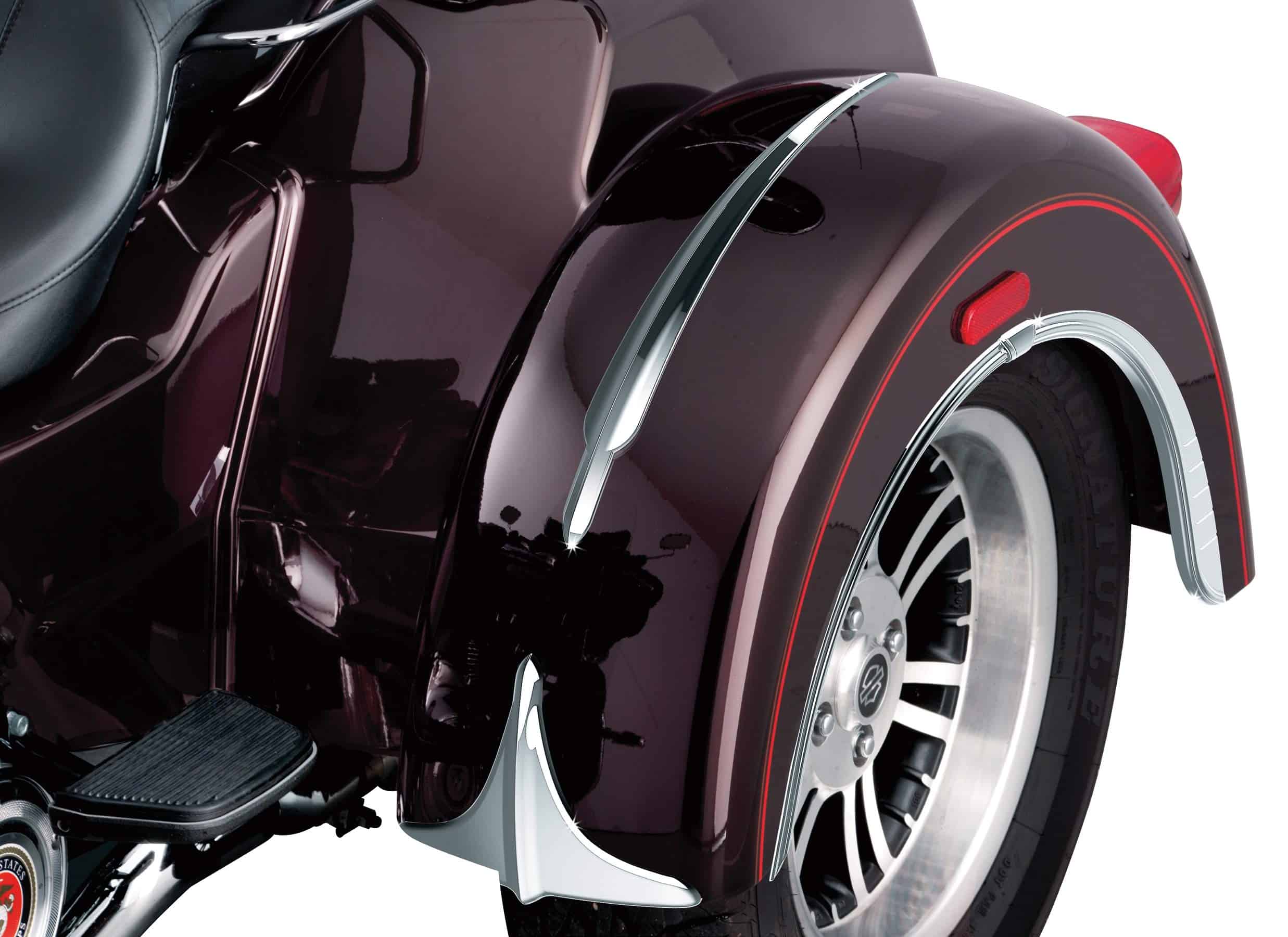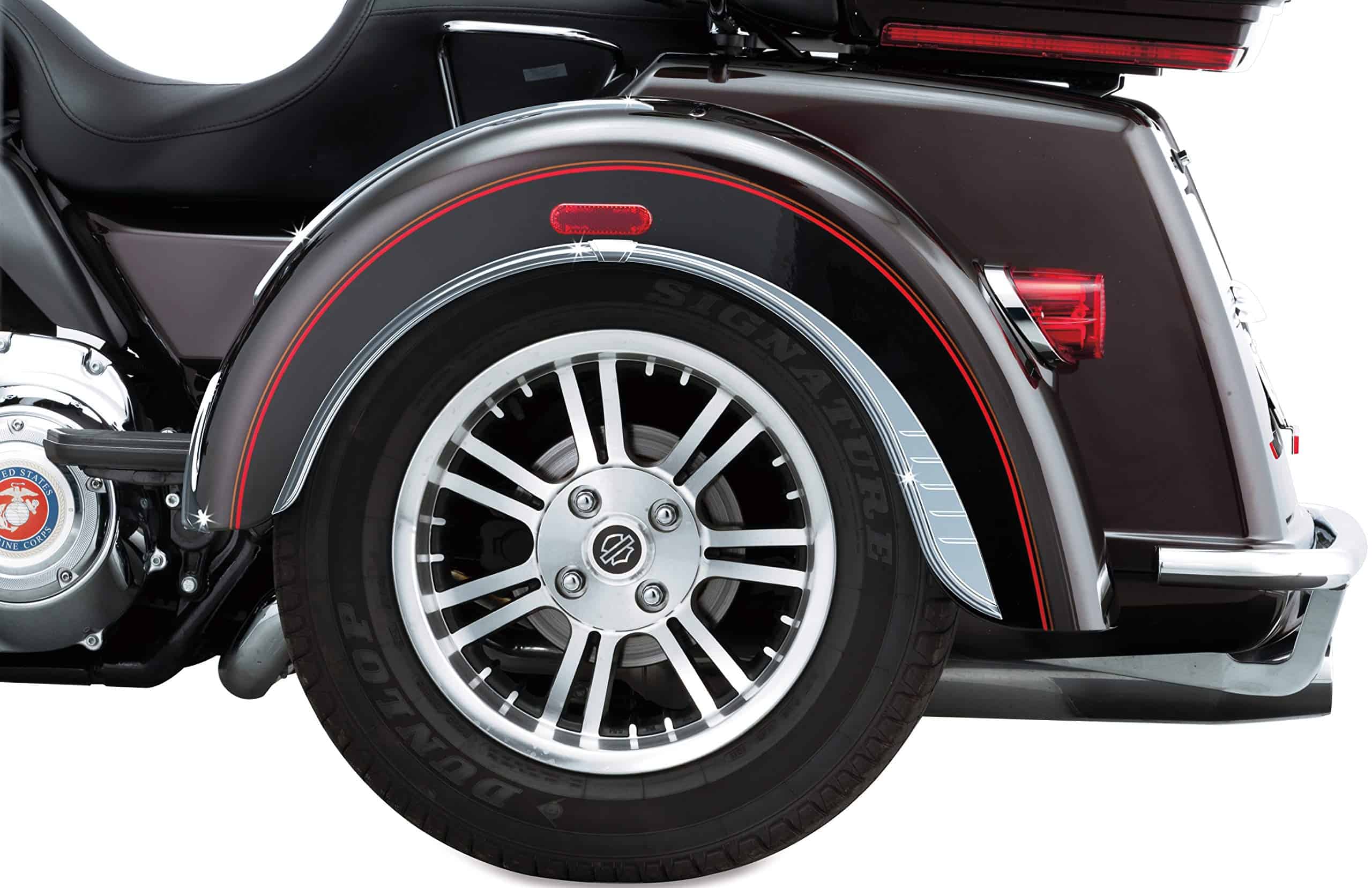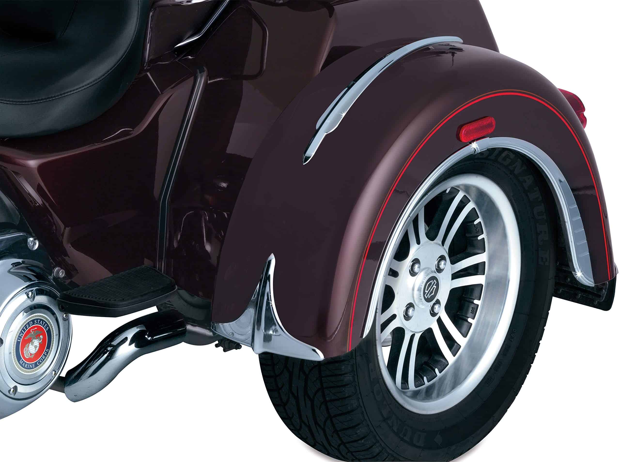 Los acentos superiores de guardabarros Kuraykyn 7216 son más que solo un borde cromado. Proporciona un aspecto mejorado al tiempo que agrega carácter al lado superior del guardabarros trasero. Presenta líneas únicas y un acabado cromado brillante que seguramente llamará la atención; fabricado en ABS ligero y duradero. Instalación rápida y fácil. Incluye (2) acentos cromados superiores de guardabarros; Se recomienda para la instalación (no incluido): cinta métrica, cinta adhesiva y un marcador no permanente. Los acentos superiores de guardabarros Kuraykyn 7216 son compatibles con los modelos de Harley-Davidson: ’09-’19 FLHTCUTG Tri Glide Ultra Classic y ’10-’11 FLHXXX Street Glide Trikes.