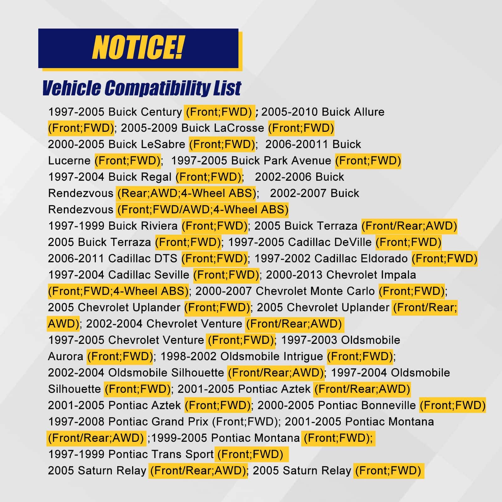 Ensamblaje de Cubo de Rueda y Cojinete 513121 de KUSATEC, ajuste perfecto para una variedad de vehículos como Cadillac DeVille/Seville, Chevrolet Impala/Venture, Buick Regal/Lucerne/LeSabre/LaCrosse, Pontiac Bonneville/Montana. Este ensamble de cubo de rueda y cojinete es completamente nuevo y está diseñado para la posición delantera o trasera, con 3 orificios de pernos en el manguito y un tamaño de rosca de M12X1.5 con 5 pernos y sistema de frenos ABS. Las imágenes reales muestran la calidad del producto y su fácil instalación, garantizando un funcionamiento estable y seguro. Los pernos del cubo de rueda cuentan con un recubrimiento protector para evitar la oxidación y facilitar el ajuste de las tuercas. El diseño de sellado mejorado minimiza el ruido y la vibración, asegurando un rendimiento óptimo. Cada ensamble se somete a estrictas inspecciones de calidad para cumplir con los estándares OEM y ofrecer la máxima fiabilidad. KUSATEC ofrece un amplio soporte al cliente y una gama de piezas de auto para elegir si este modelo no es el adecuado para su vehículo.
