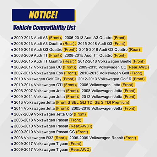 Especificaciones:Condición: Nueva MarcaPosición de Montaje: Delantera/TraseraMaterial: Acero para Cojinete de RuedaNúmero de Orificios de Perno de la Brida: 4Tamaño de Rosca del Perno de la Brida: M14X1.5Pernos de 5 Huecos con ABSInformación de ajuste de parte:El Ensamble de Cojinete de Rueda y Cubo Delantero/Trasero 513253 es apto para los siguientes vehículos:Compatible con 2009-2013 Audi A3 (Modelos Delanteros AWD/FWD)Compatible con 2006-2013 Audi A3 Quattro (Modelos Delanteros AWD/FWD)Compatible con 2015-2018 Audi Q3 (Modelos Delanteros AWD/FWD)Compatible con 2015-2018 Audi Q3 Quattro (Modelos Delanteros AWD/FWD)Compatible con 2008-2009 Audi TT (Modelos Delanteros AWD/FWD)Compatible con 2008-2015 Audi TT Quattro (Modelos Delanteros AWD/FWD)Compatible con 2012-2019 Volkswagen Beetle (Modelos Delanteros AWD/FWD)Compatible con 2009-2017 Volkswagen Tiguan/CC (Modelos Delanteros AWD/FWD)Compatible con 2007-2016 Volkswagen Eos (Modelos Delanteros AWD/FWD)Compatible con 2010-2014 Volkswagen Golf (Modelos Delanteros AWD/FWD)Compatible con 2006-2009 Volkswagen Rabbit (Modelos Delanteros AWD/FWD)Compatible con 2010-2014 Volkswagen GTI (Modelos Delanteros AWD/FWD)Compatible con 2005-2018 Volkswagen Jetta (Modelos Delanteros AWD/FWD)Compatible con 2006-2019 Volkswagen Passat (Modelos Delanteros AWD/FWD)Compatible con 2006-2013 Audi A3 Quattro (Modelos AWD Delanteros y Traseros)Compatible con 2015-2018 Audi Q3 Quattro (Modelos AWD Delanteros y Traseros)Compatible con 2012-2013 Volkswagen Golf R (Modelos AWD Delanteros y Traseros)Compatible con 2008 Volkswagen R32 (Modelos AWD Delanteros y Traseros)Paquete incluye:1X 513253 Ensamble de Cojinete de Rueda y Cubo Delantero/TraseroNota:Por favor, revise el modelo de vehículo, la descripción del producto y el número de parte para asegurarse de que sea adecuado para su vehículo.